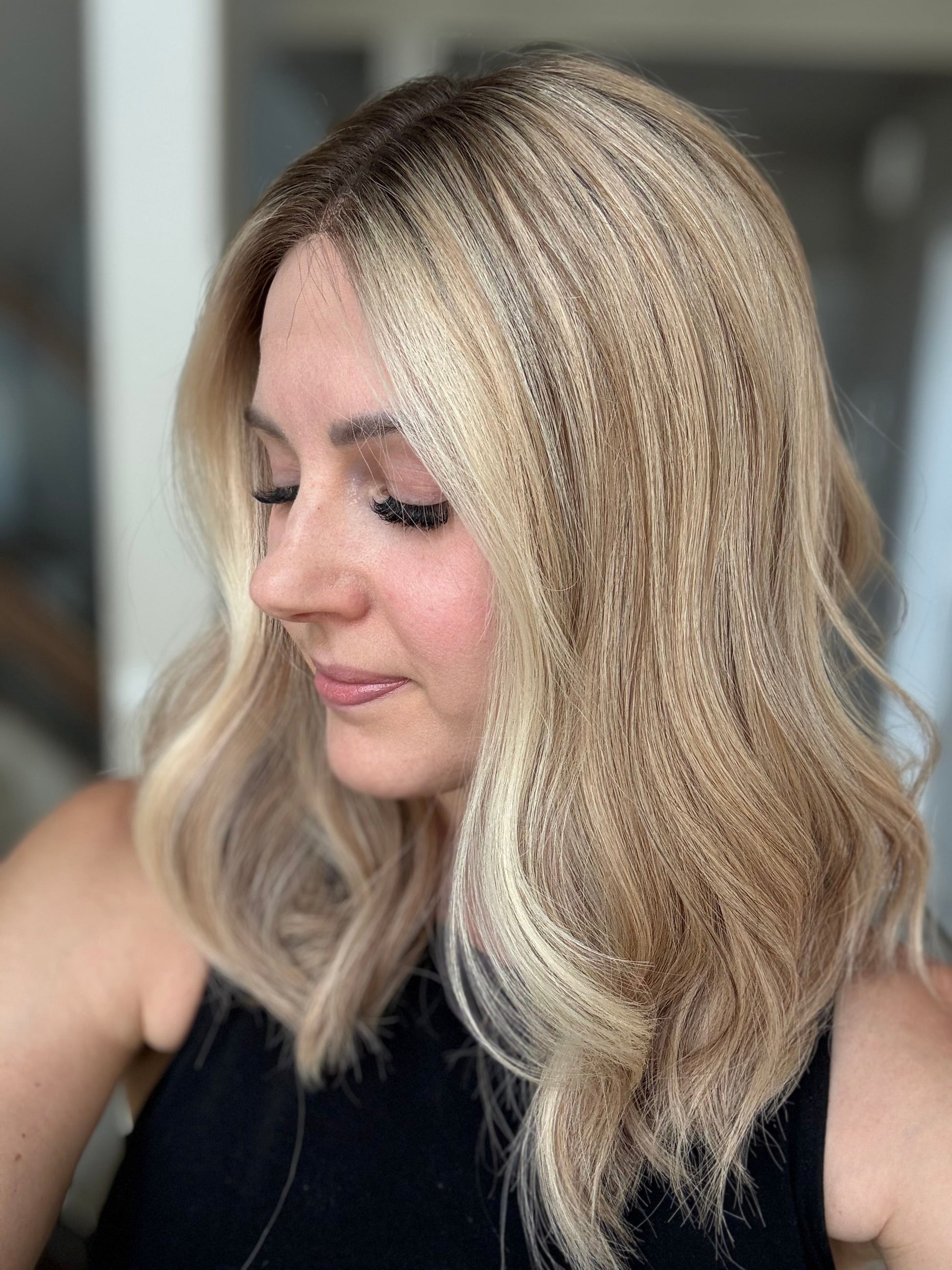 * Color: Dimensional neutral-warm blonde with a medium brown root.