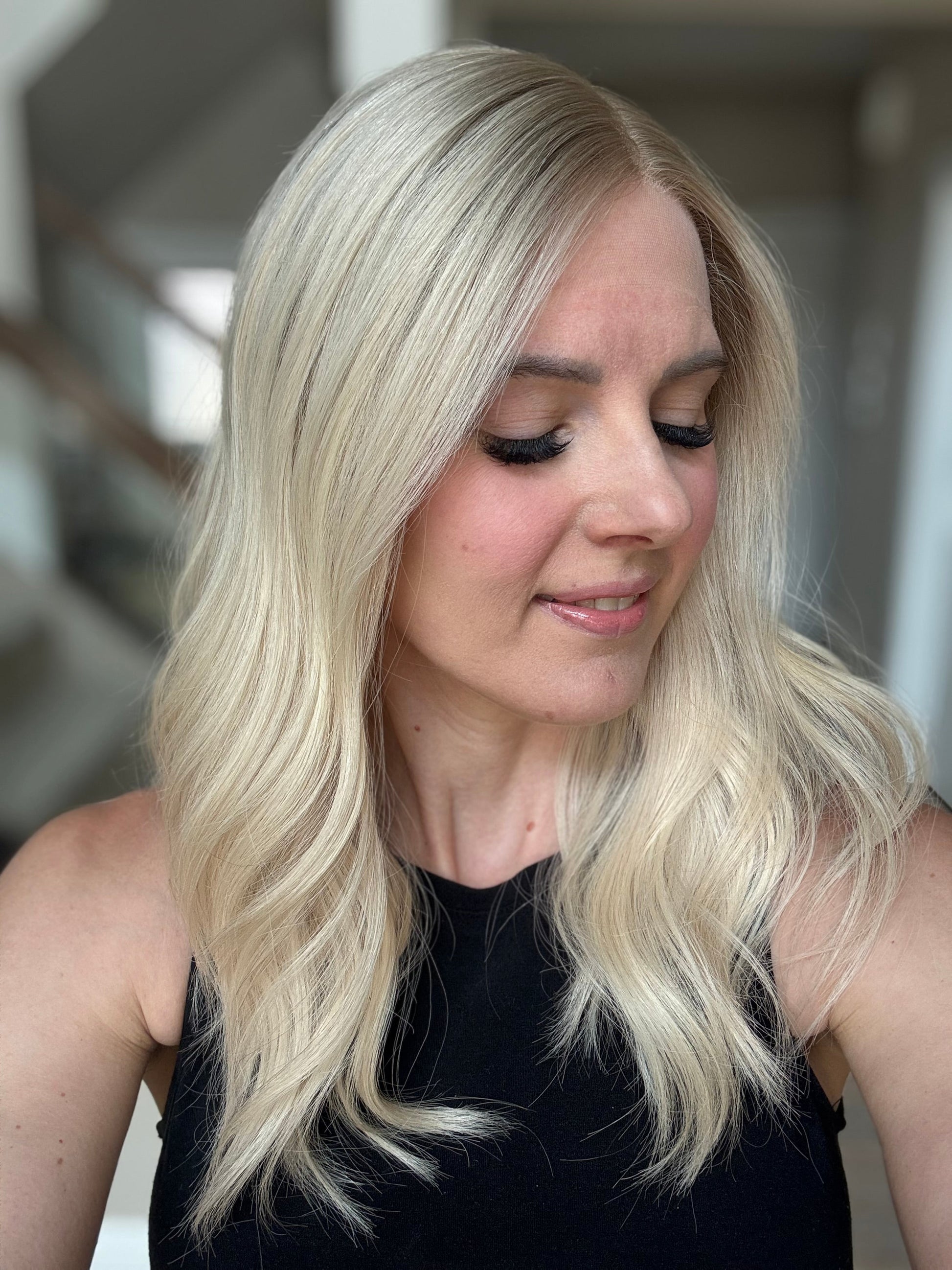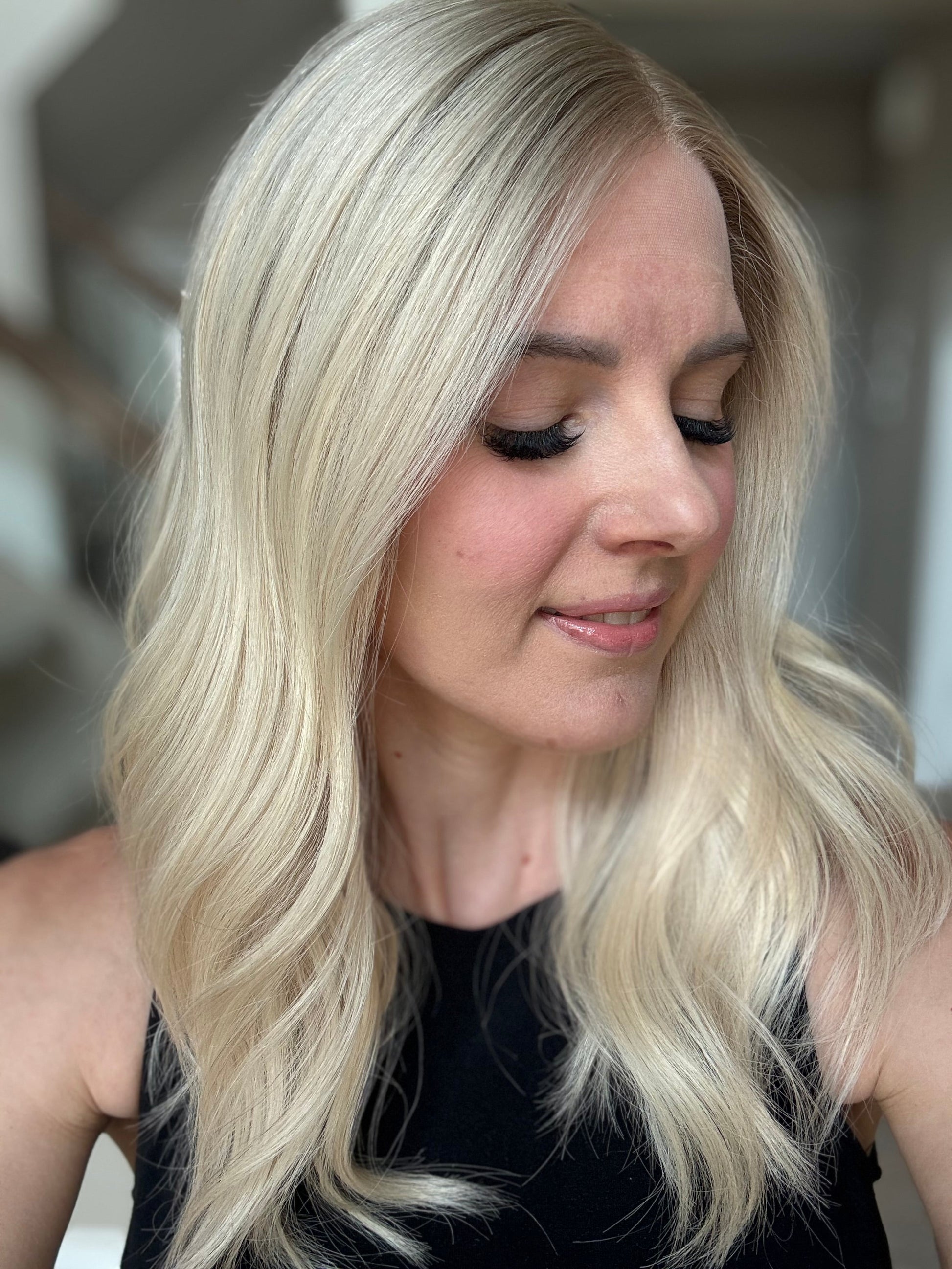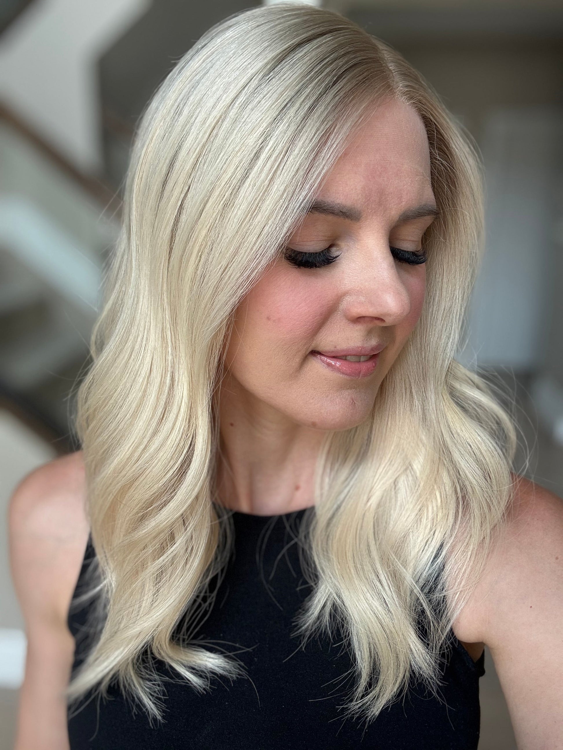 * Please note wig is shown with a small amount of face powder dabbed into the part-line for demonstration purposes. We recommend clients use powder rather than bleaching the knots as it extends the longevity of the wig and often looks more realistic.