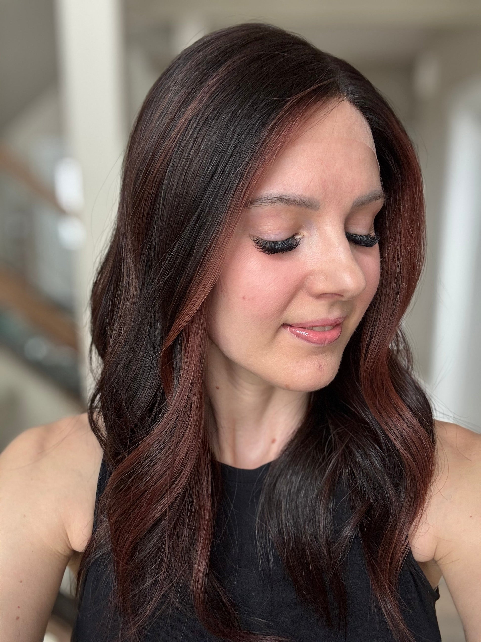 * Color: Darkest brown / natural black with deep red balayage.