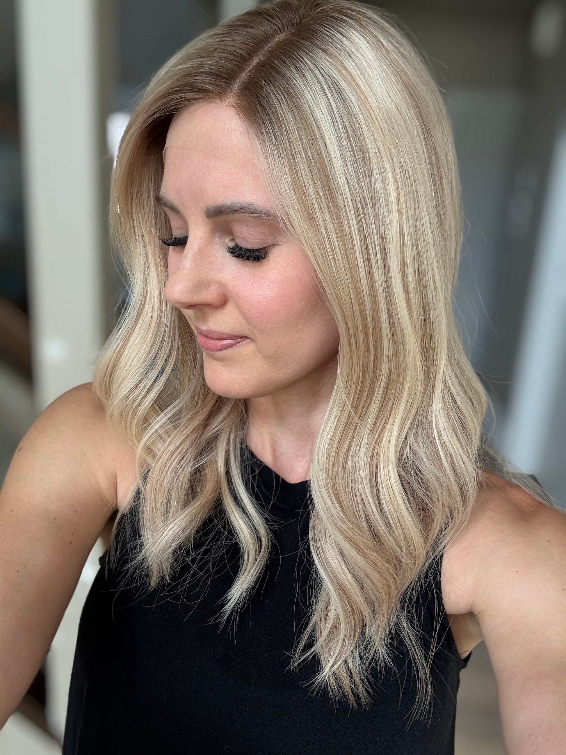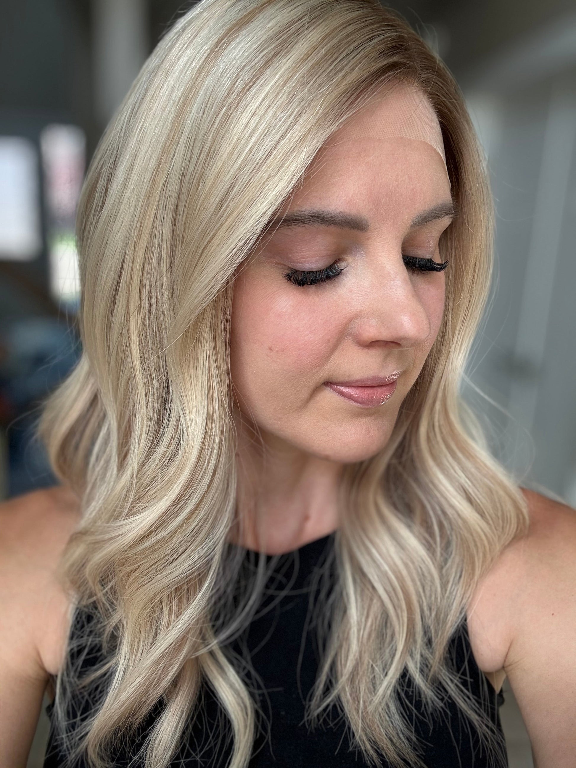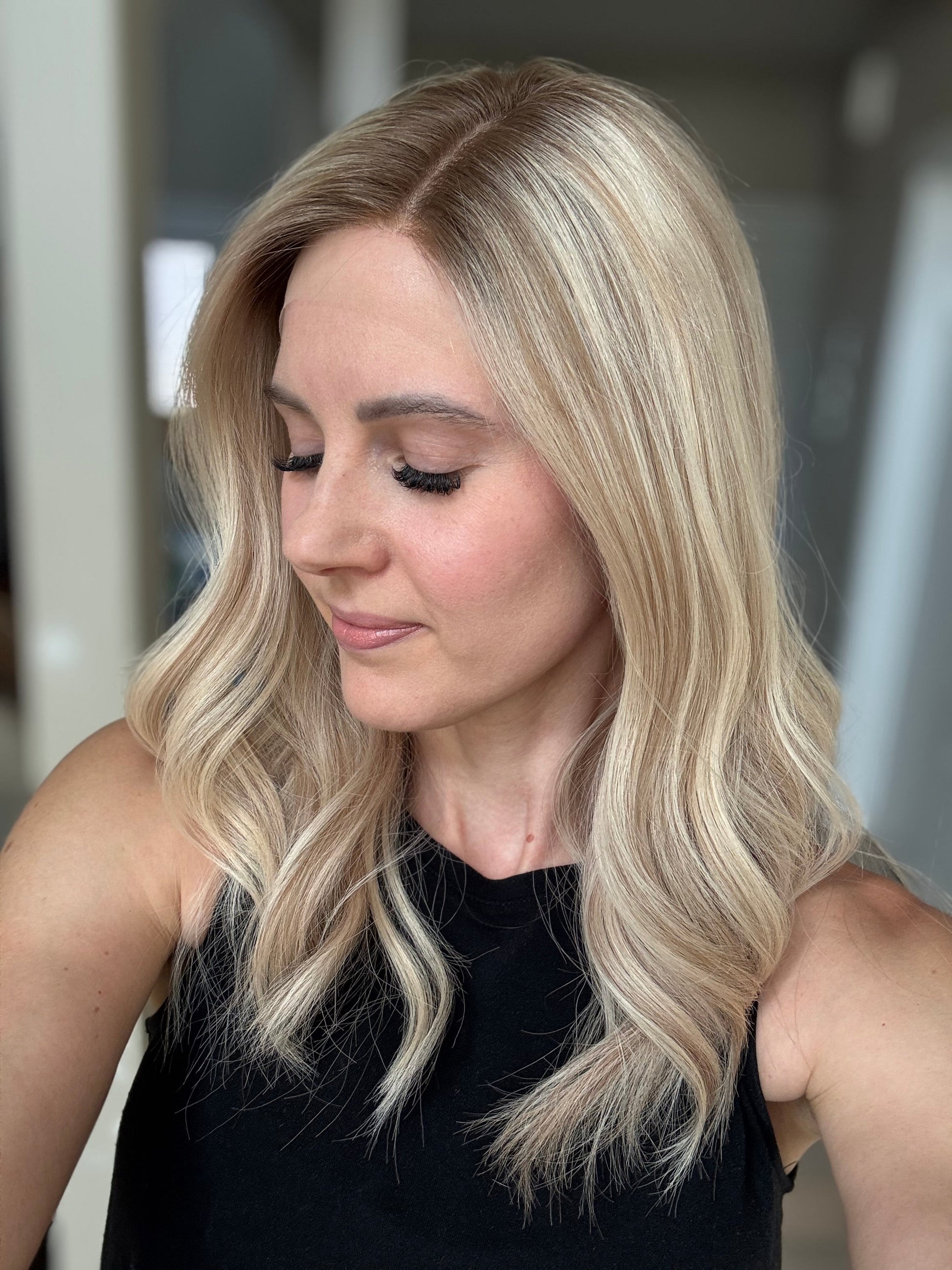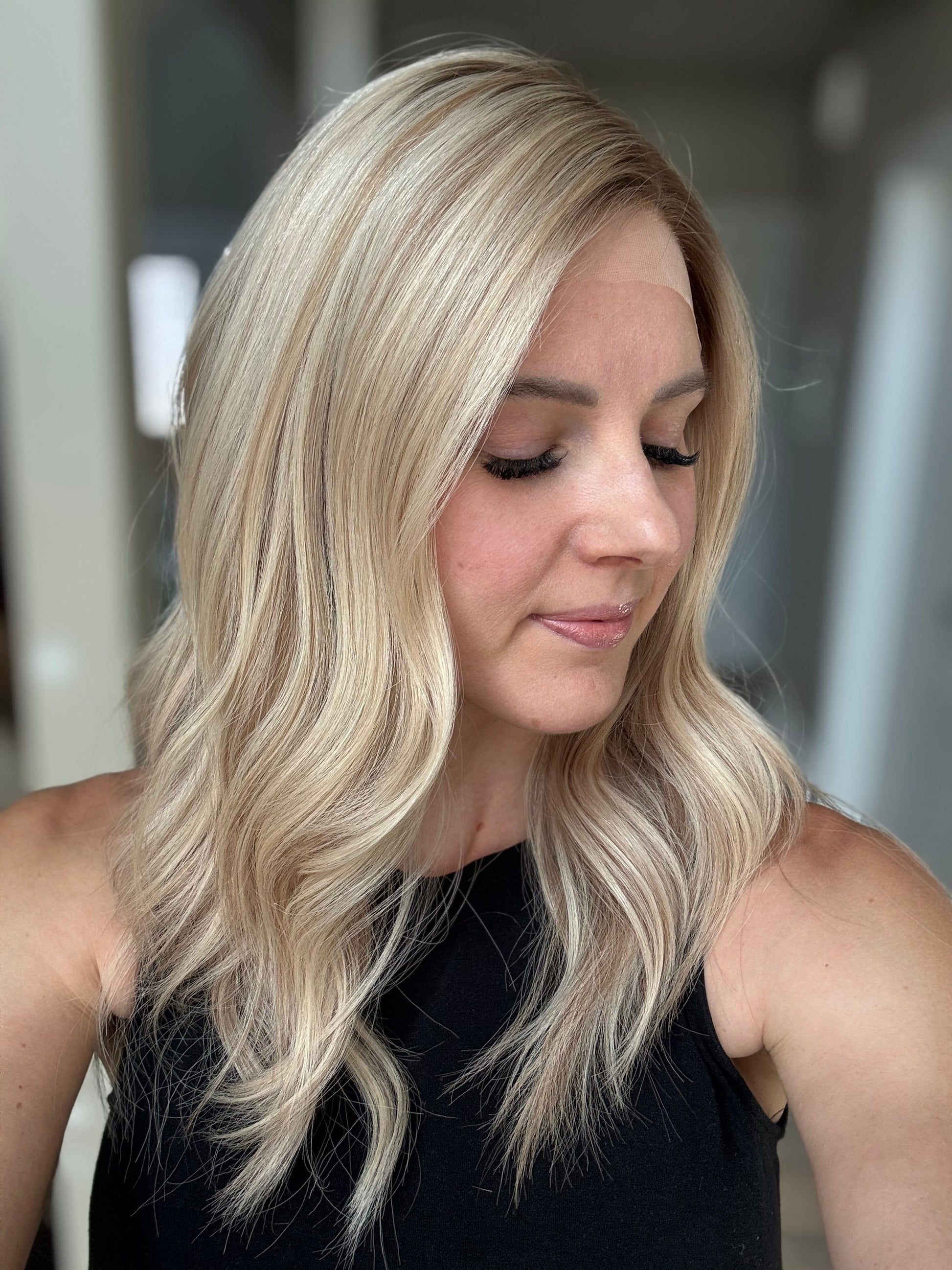 * Color: Neutral light blonde with medium blonde dimension and a light brown root.
