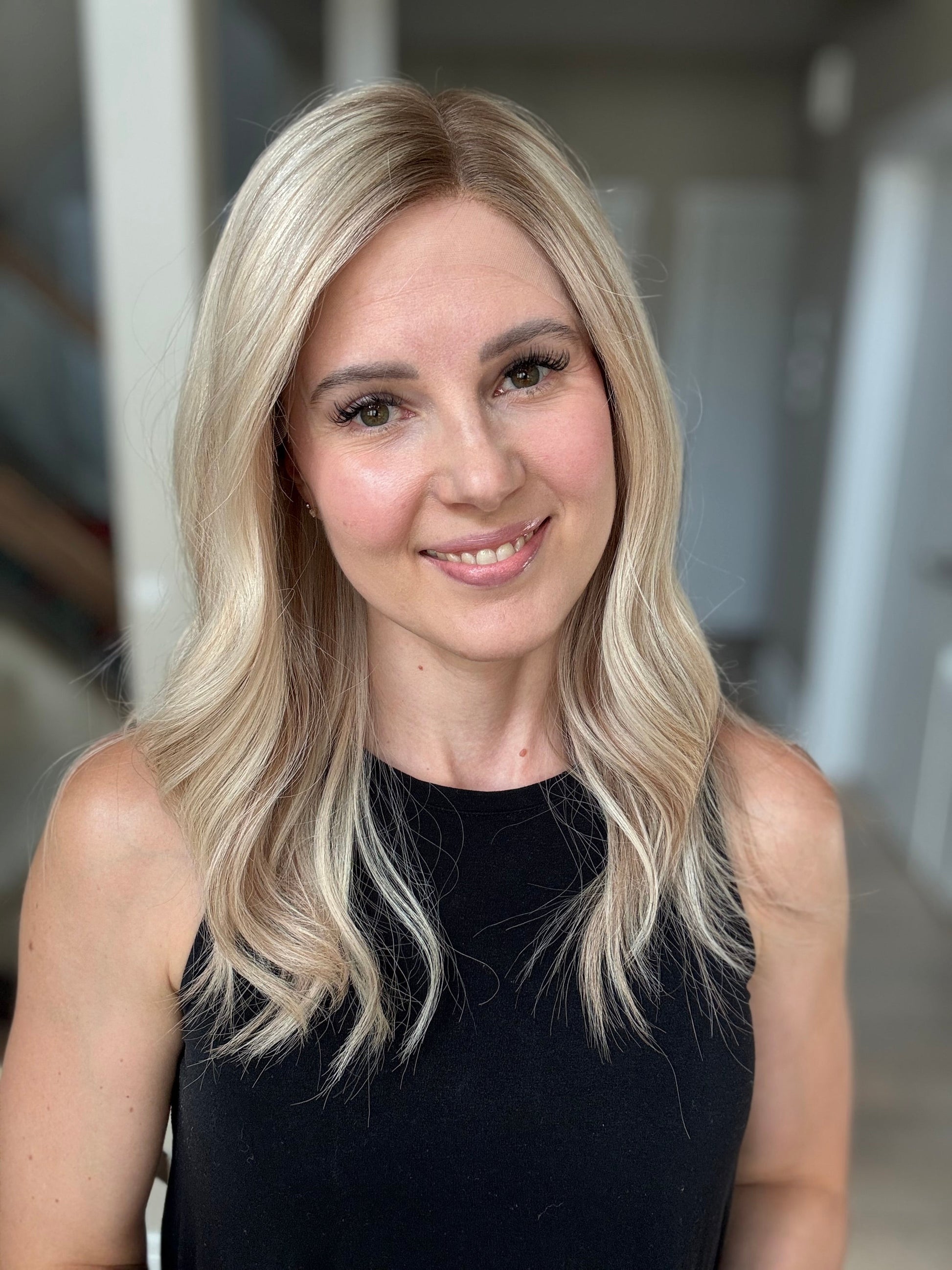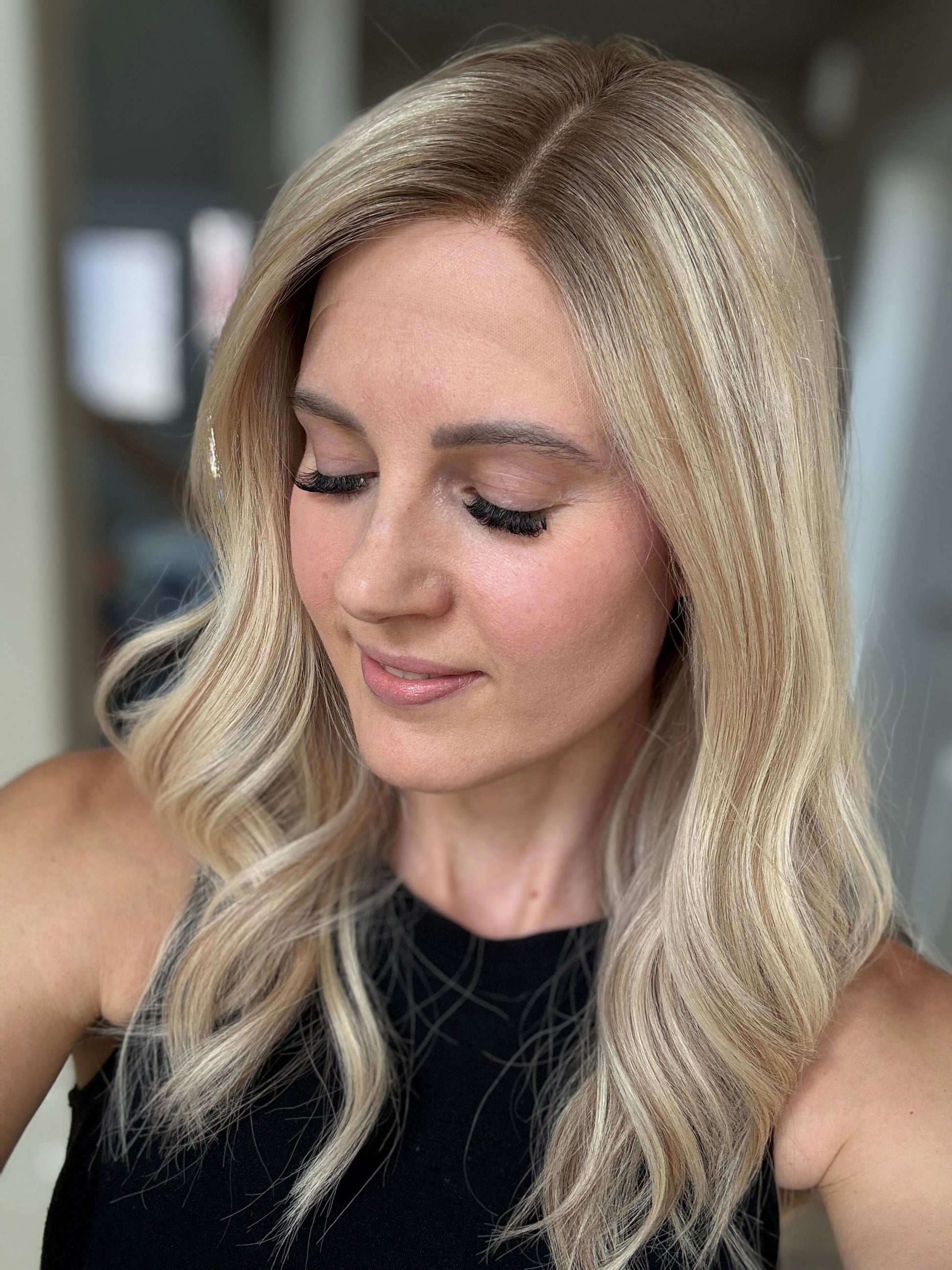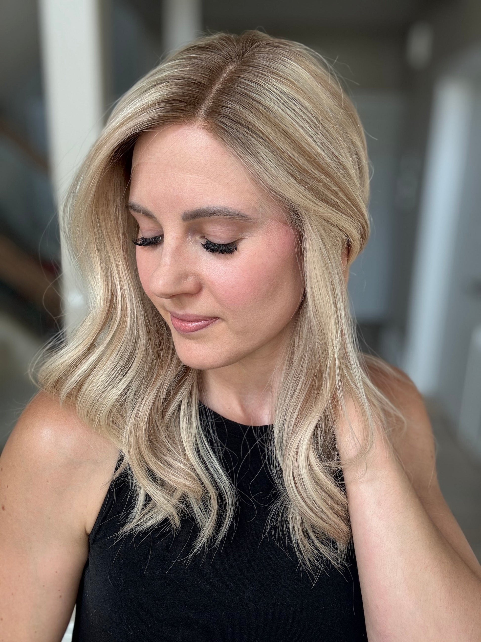 * Color: Neutral light blonde with medium blonde dimension and a light brown root.
