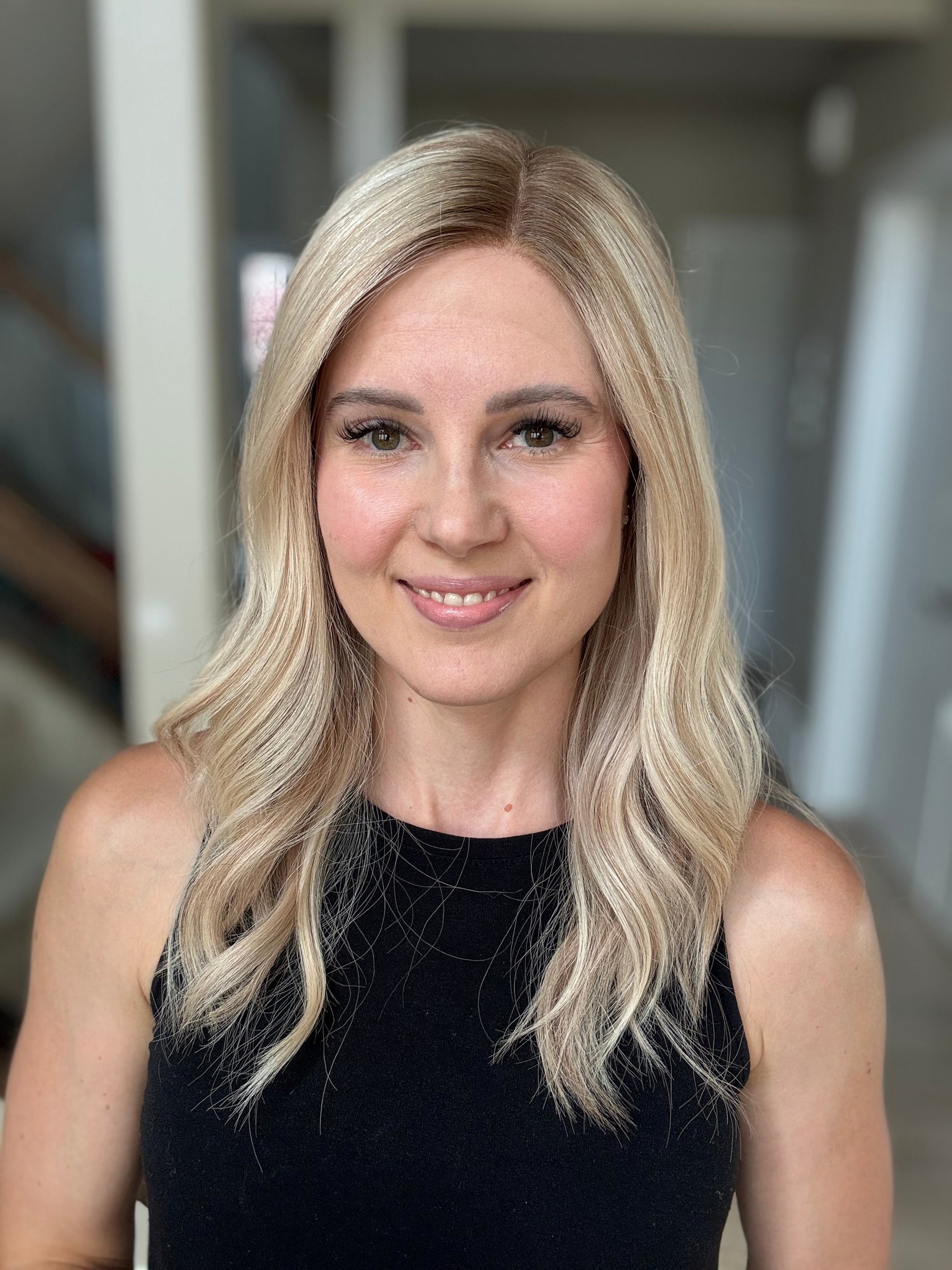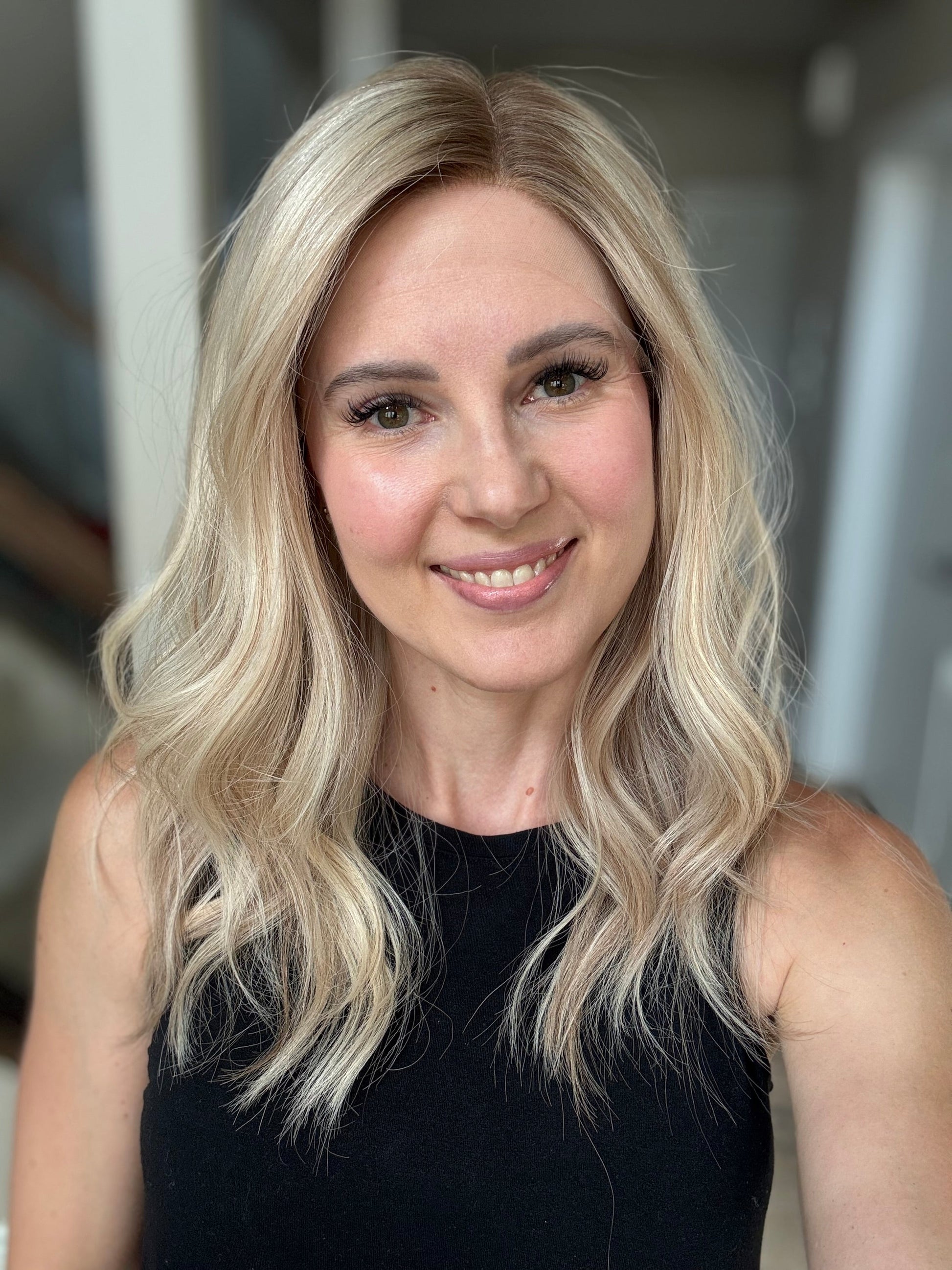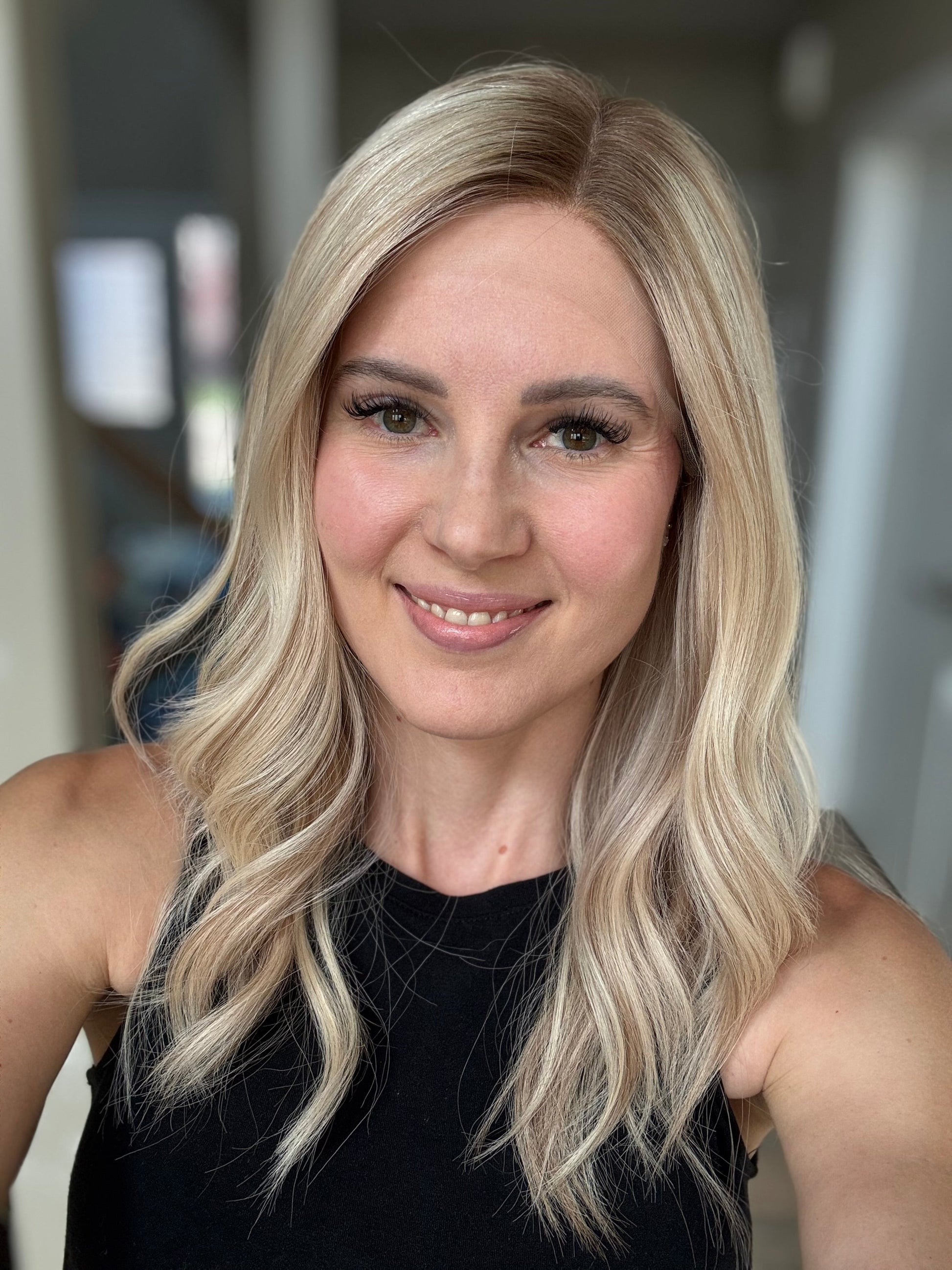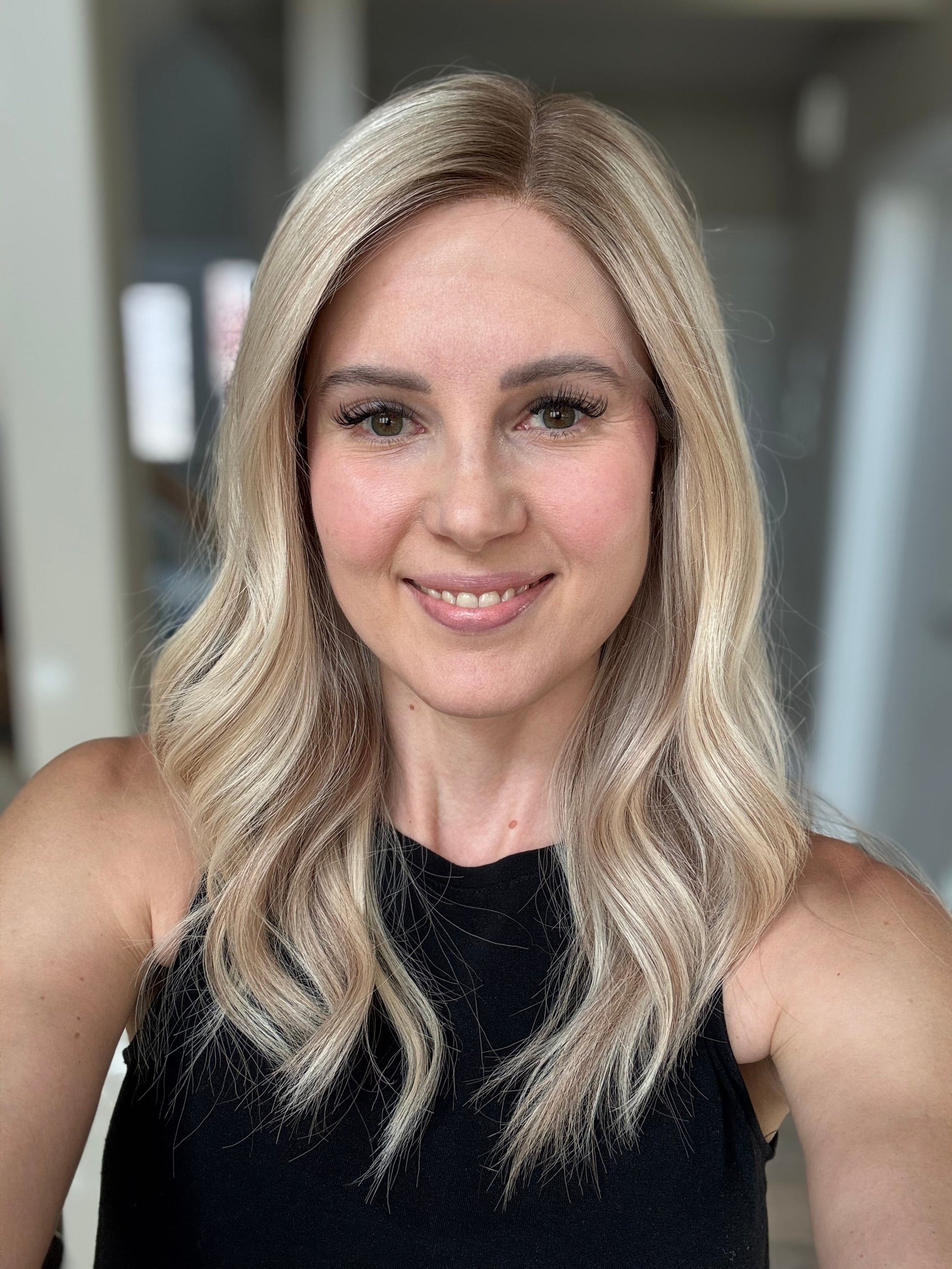 * Color: Neutral light blonde with medium blonde dimension and a light brown root.