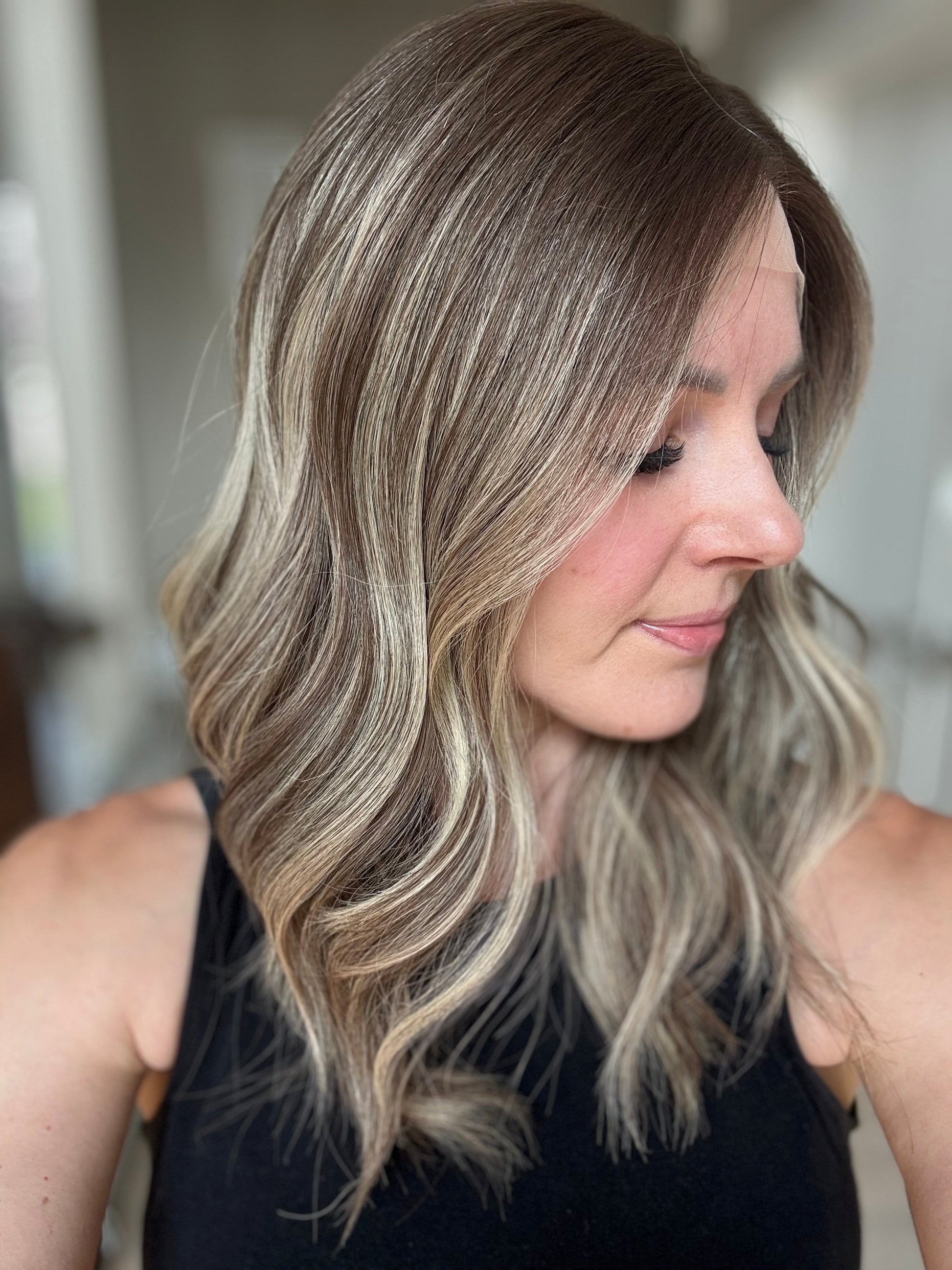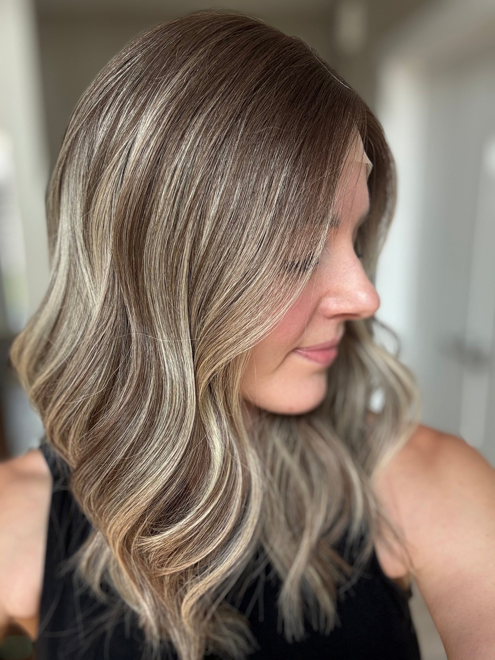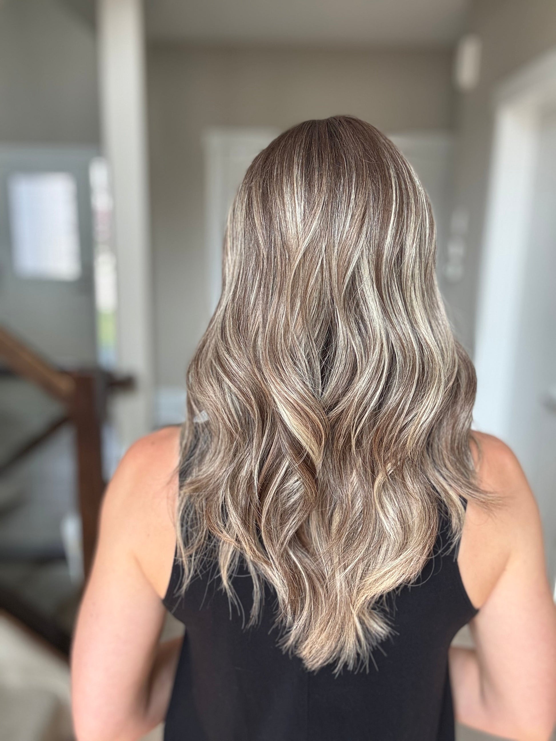 * Color: Neutral light blonde with darker warm blonde dimension on a reverse balayage medium brown root.