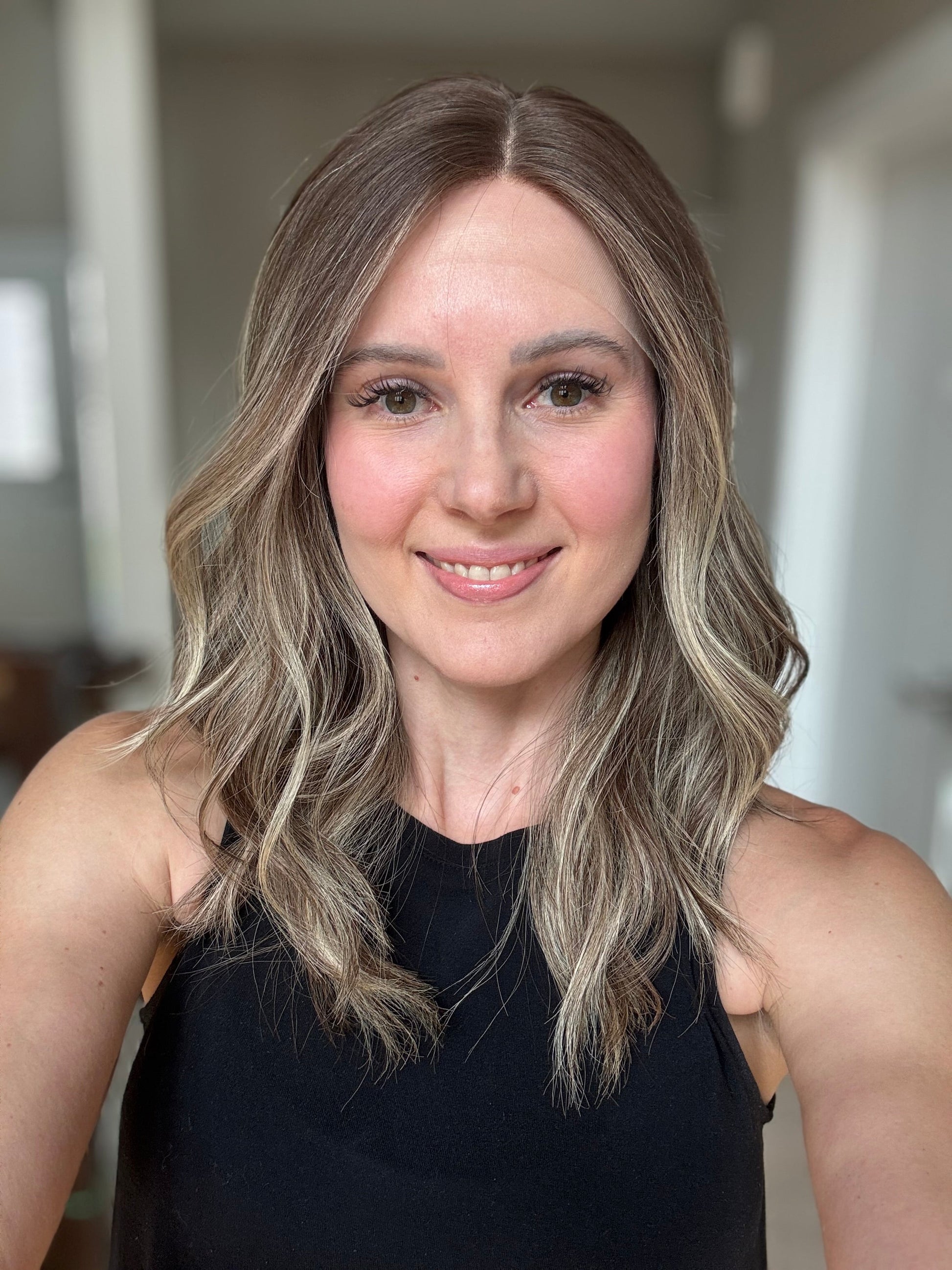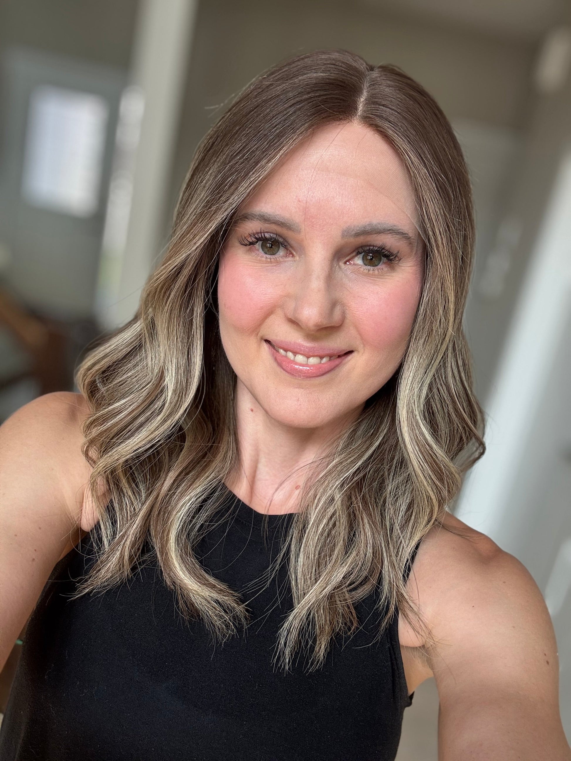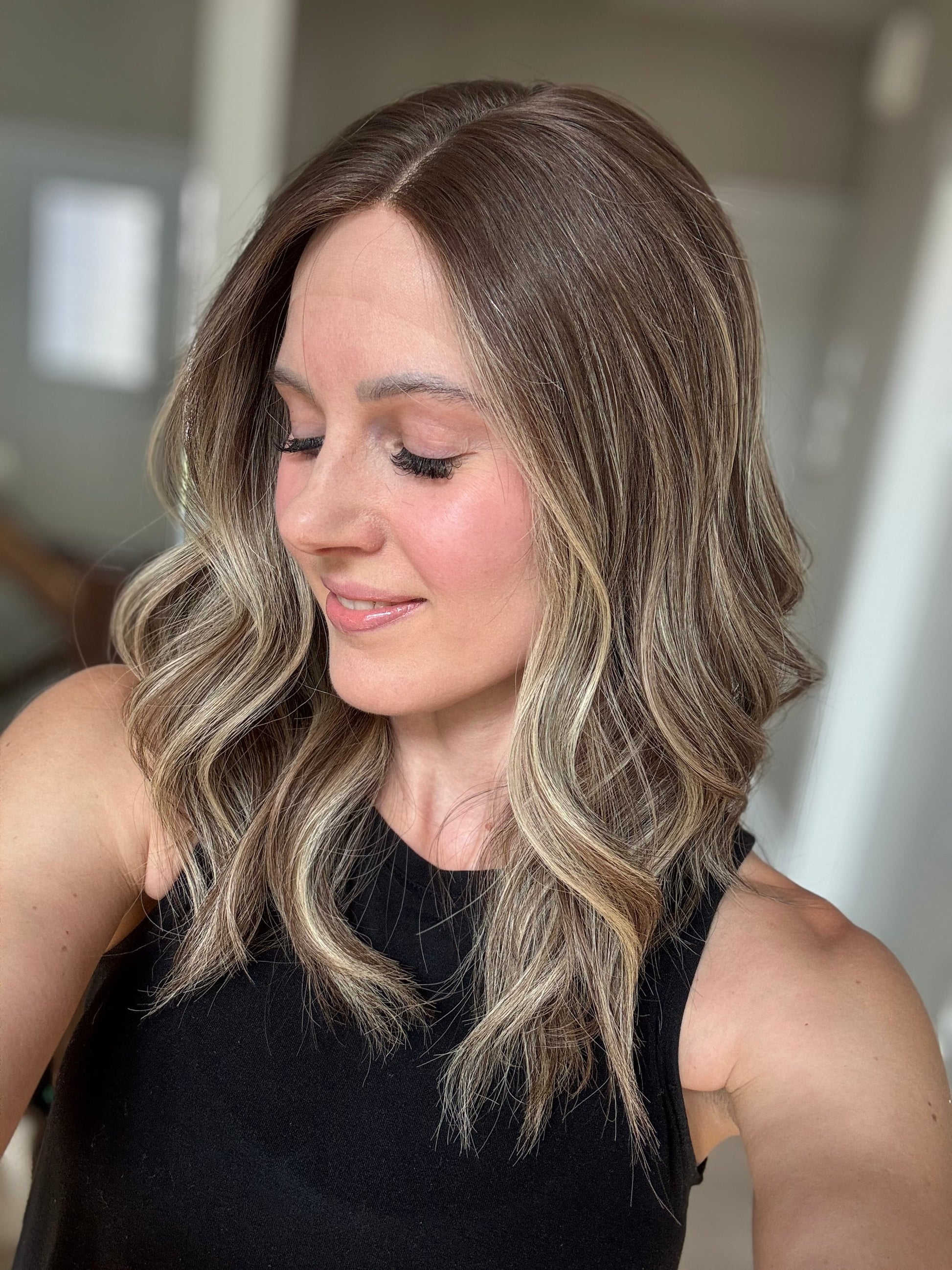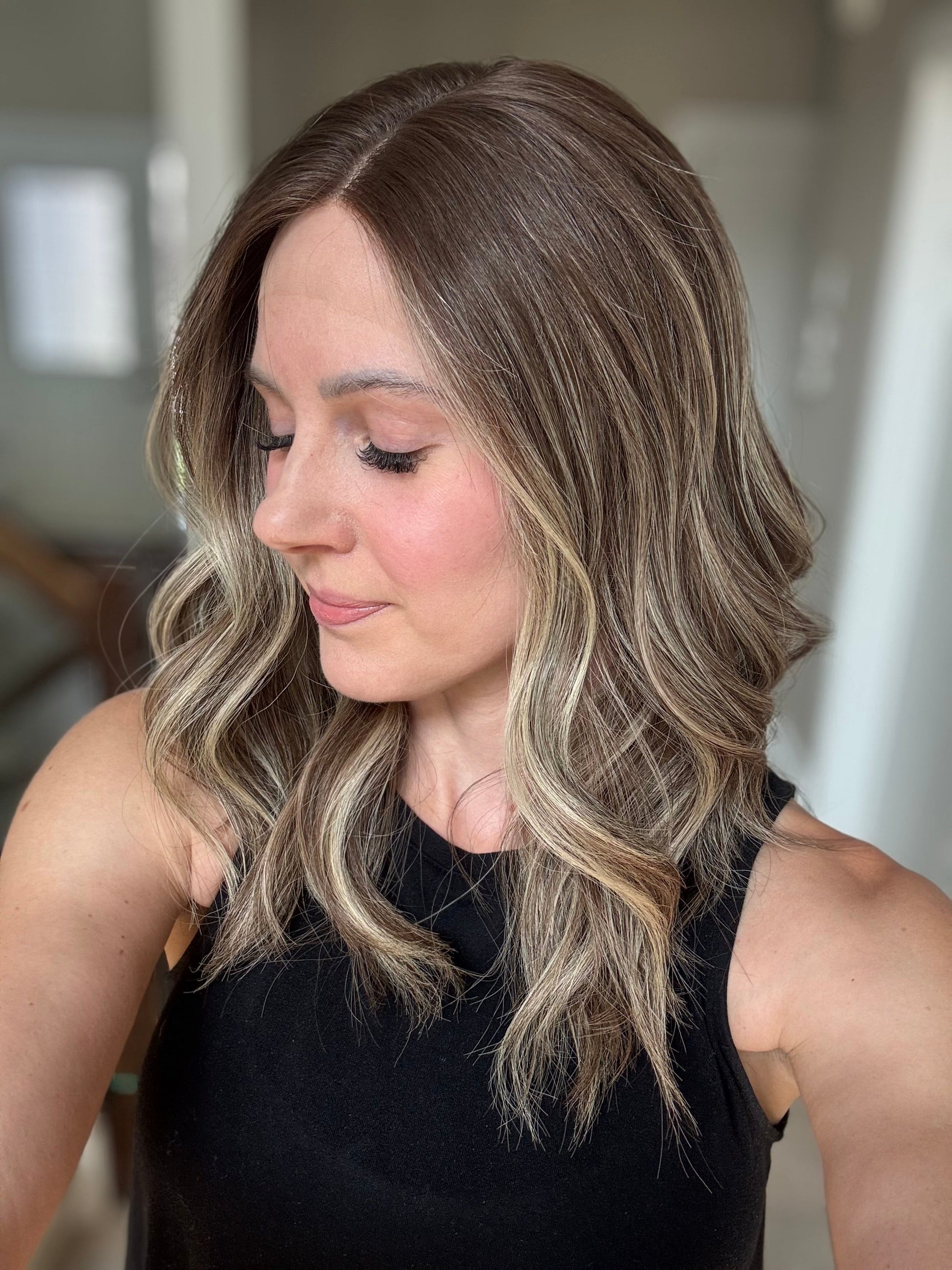 * Color: Neutral light blonde with darker warm blonde dimension on a reverse balayage medium brown root.