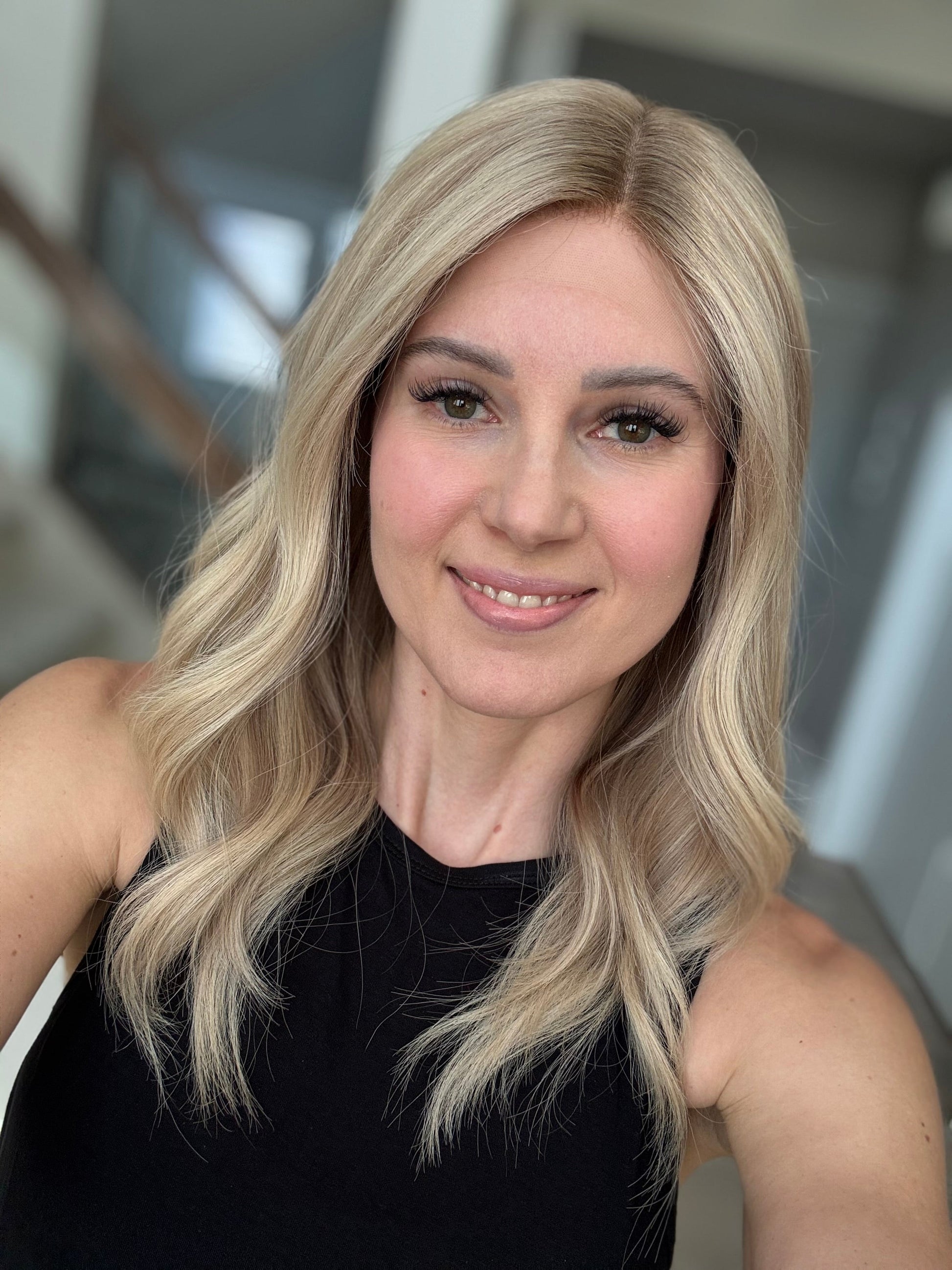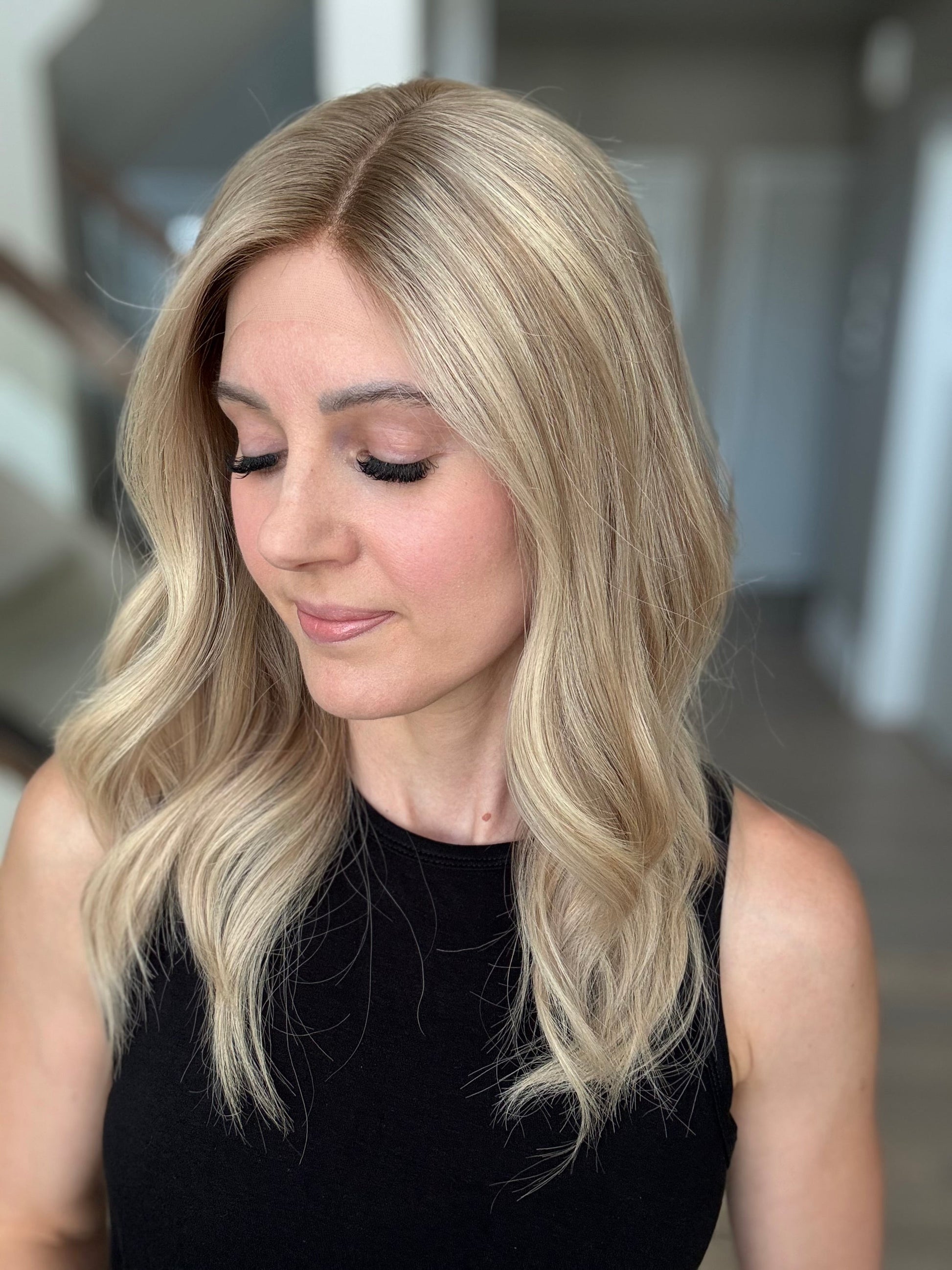 * Color: Neutral blonde with dimension and a dark blonde root.