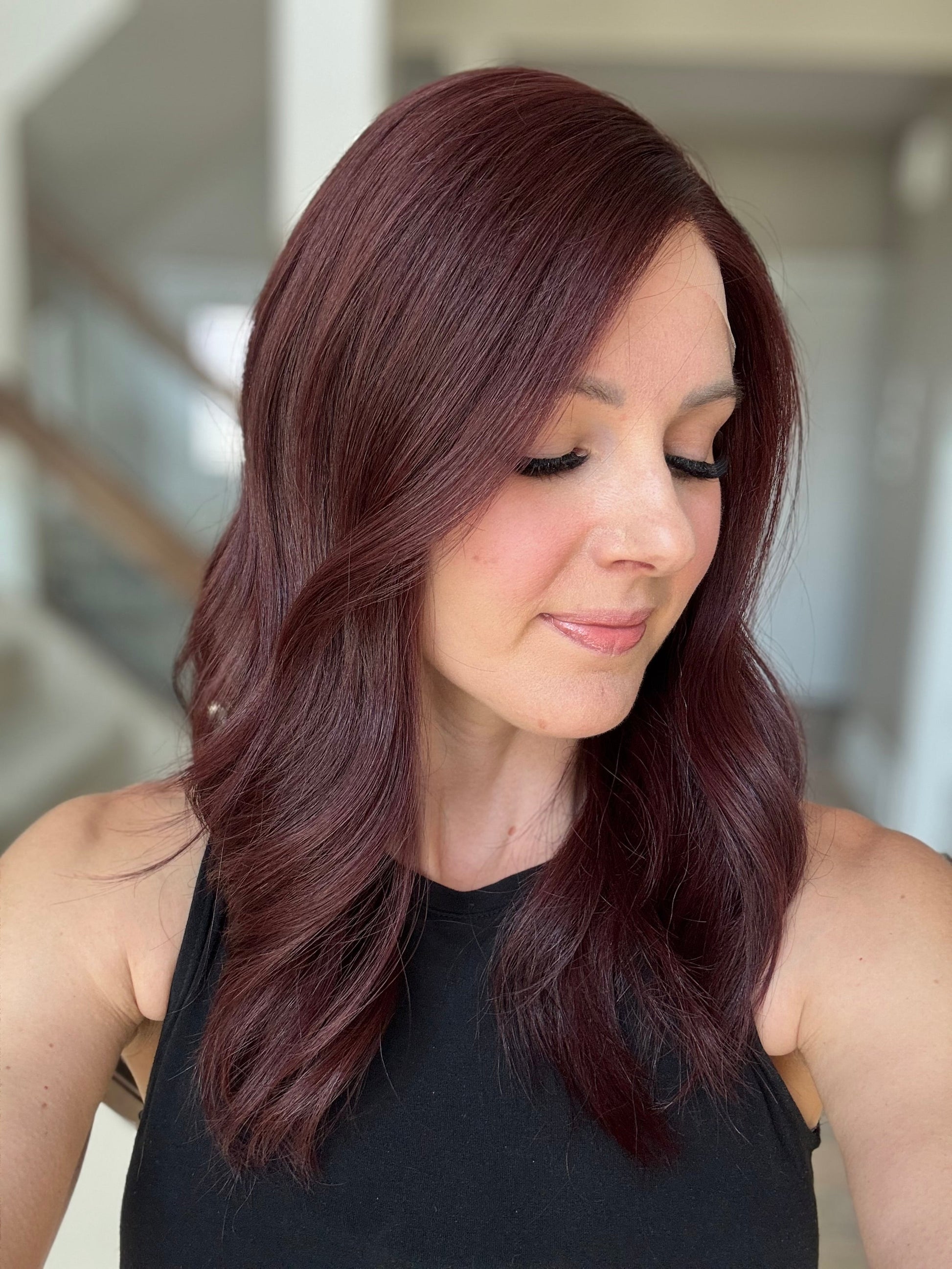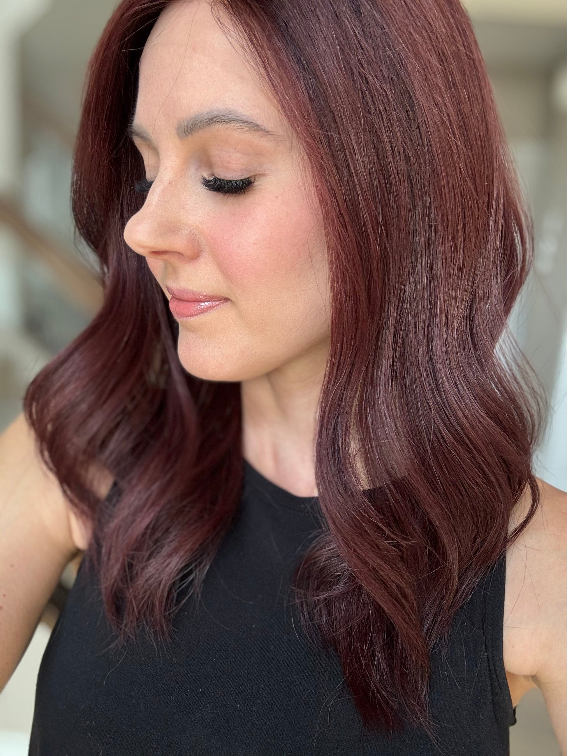 * Color: Deep burgundy red. This wig has purplish red tones.