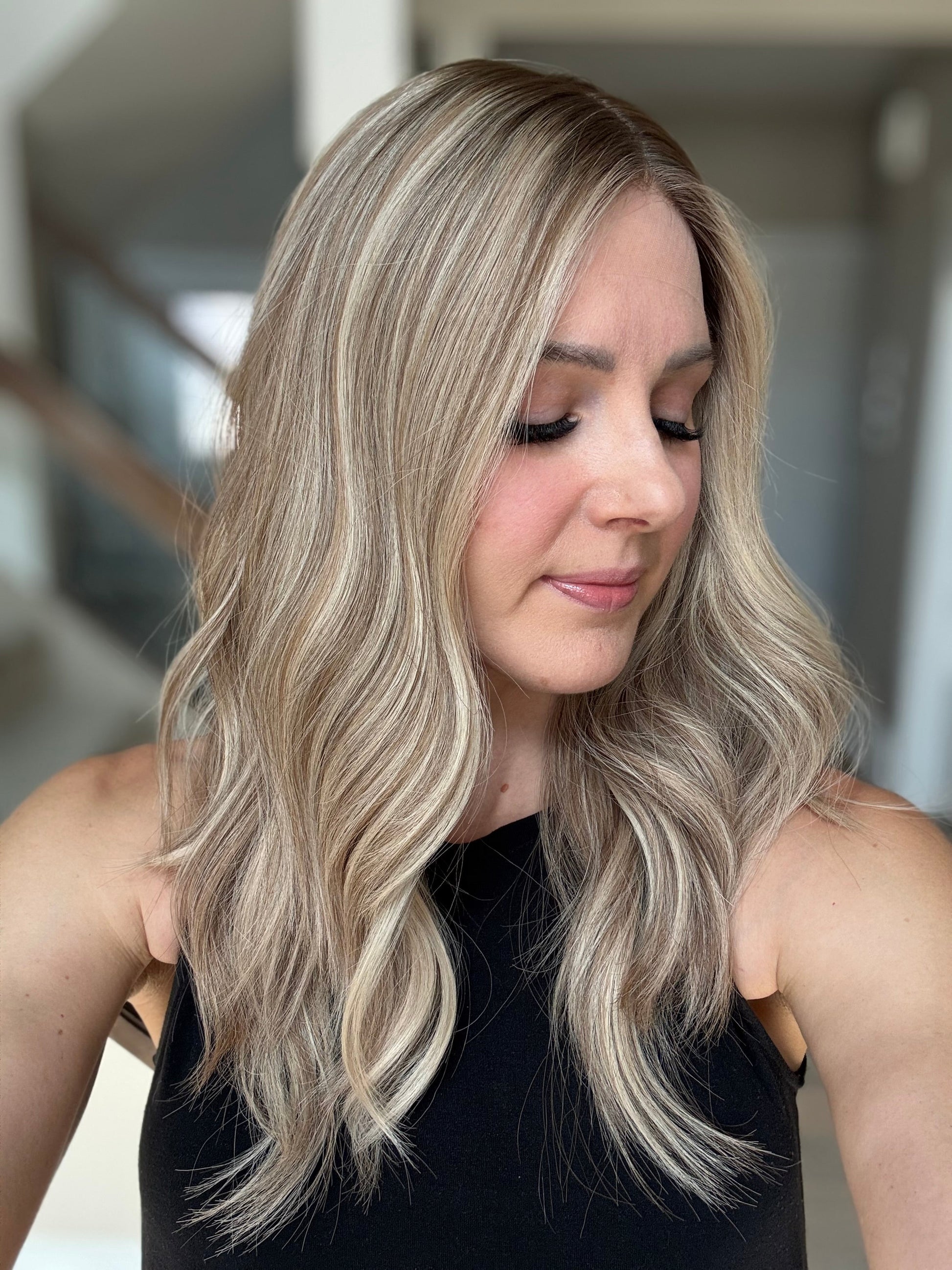 * Color: Neutral light blonde with lots of dimension and a medium brown root.
