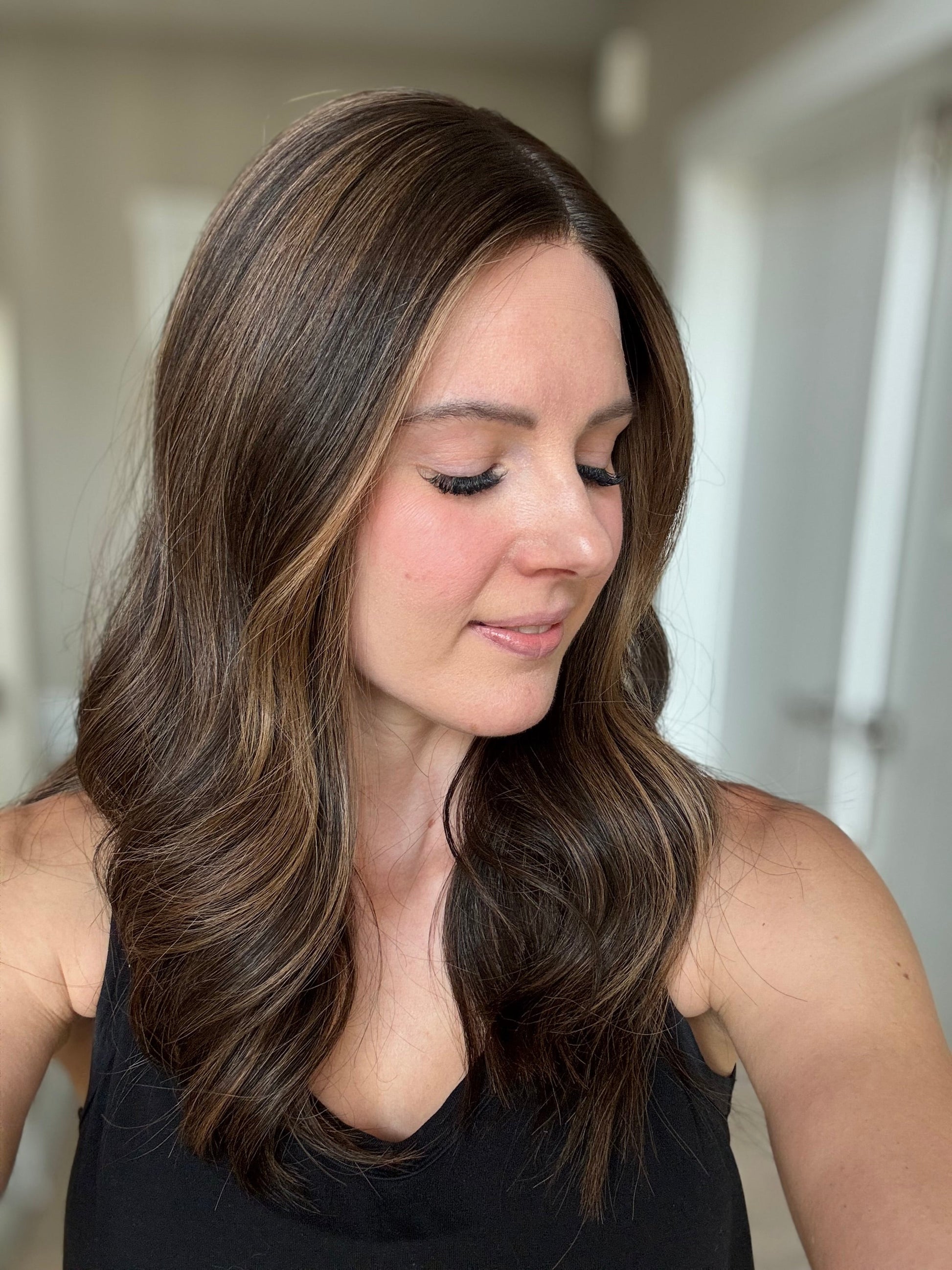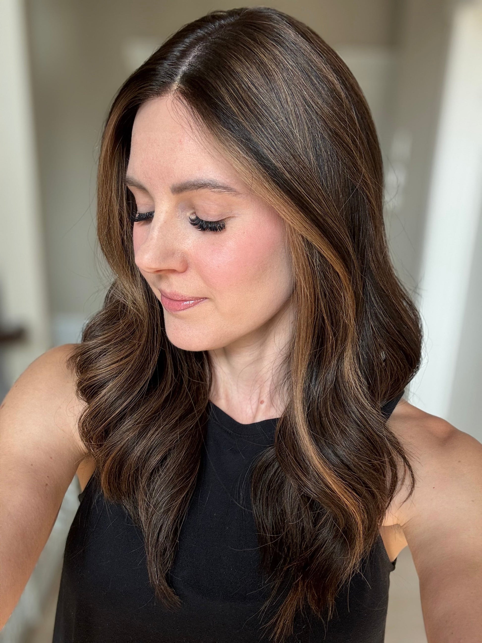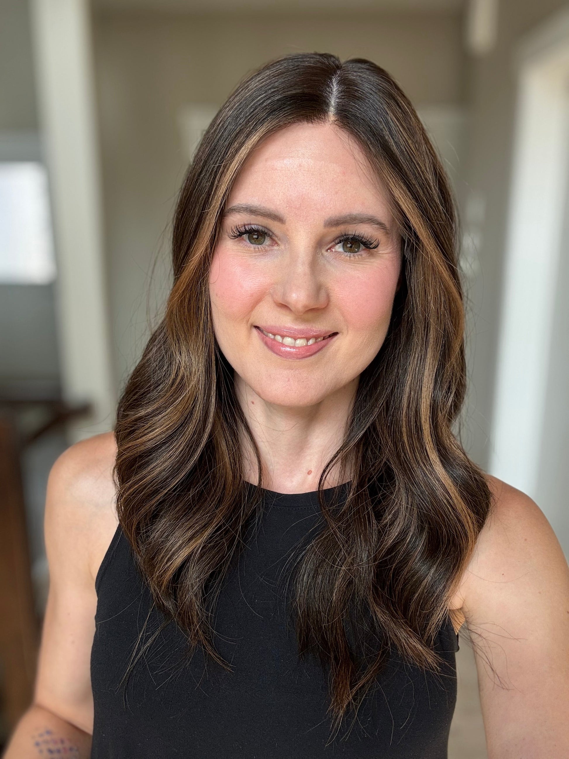 * Color: Darkest brown with warm caramel balayage.