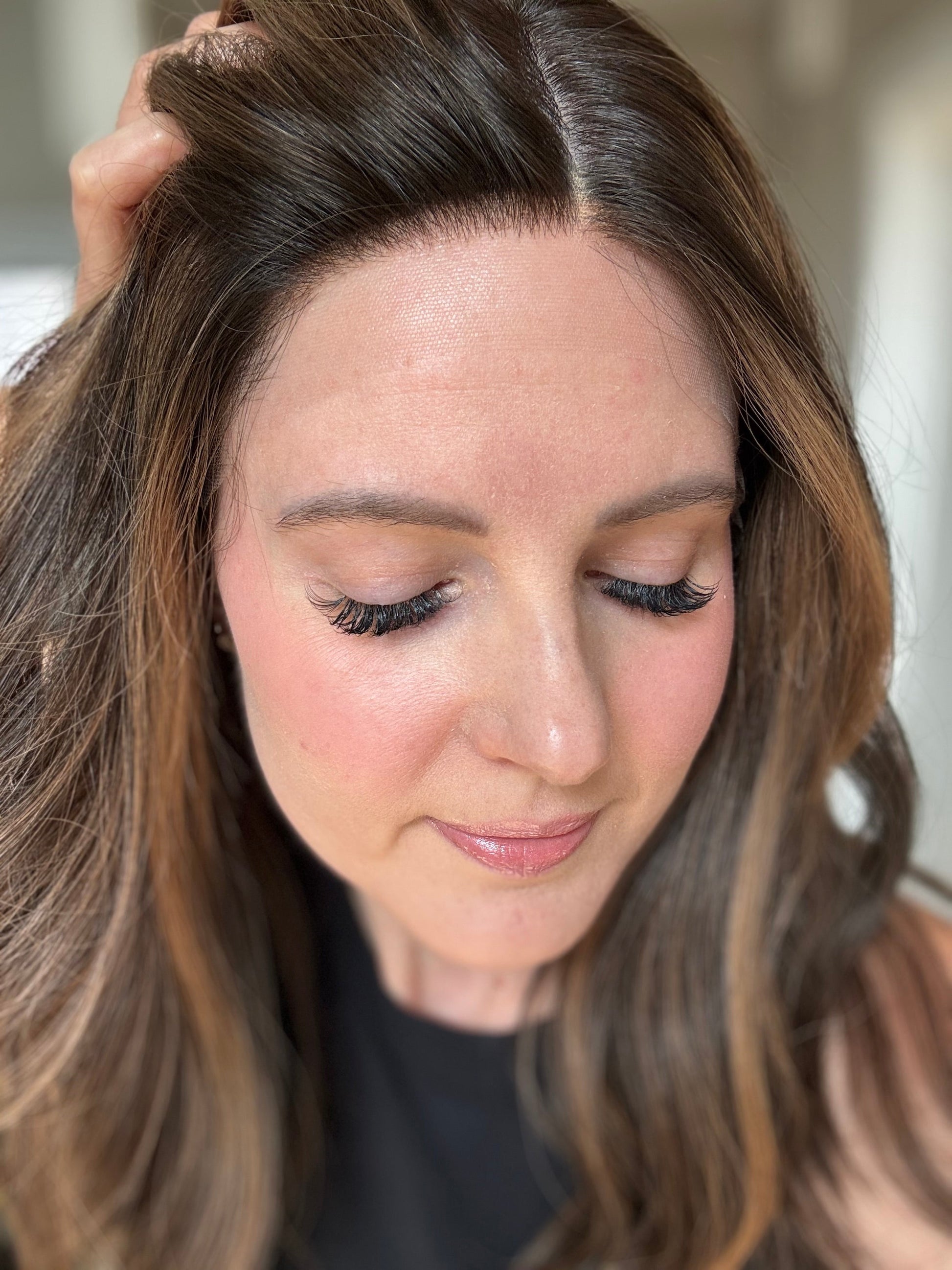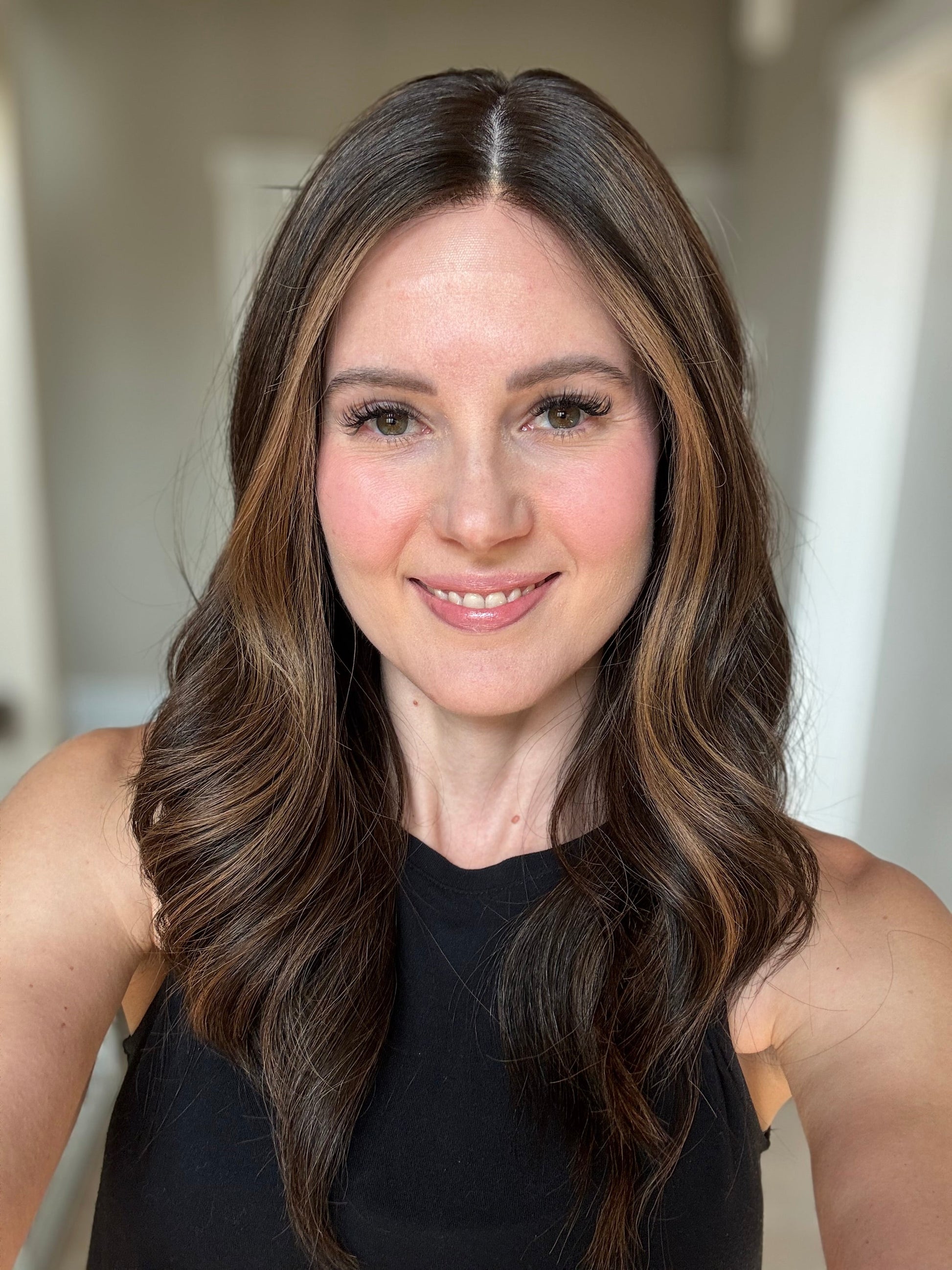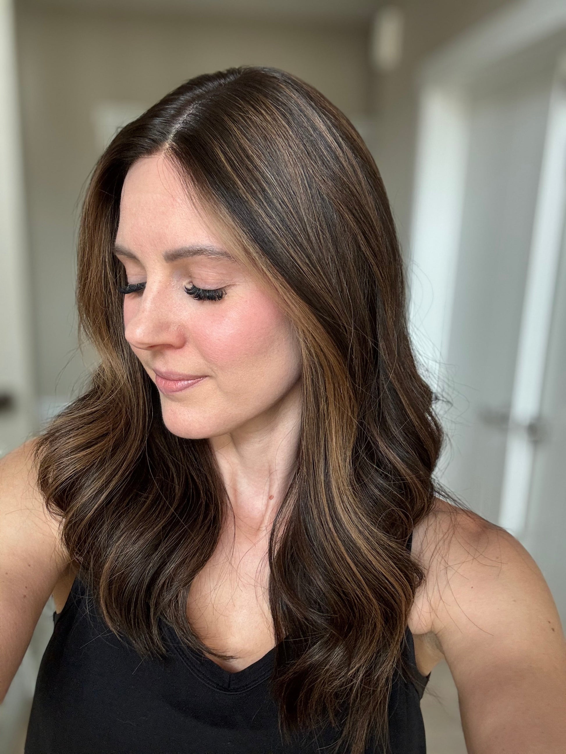 * Color: Darkest brown with warm caramel balayage.
