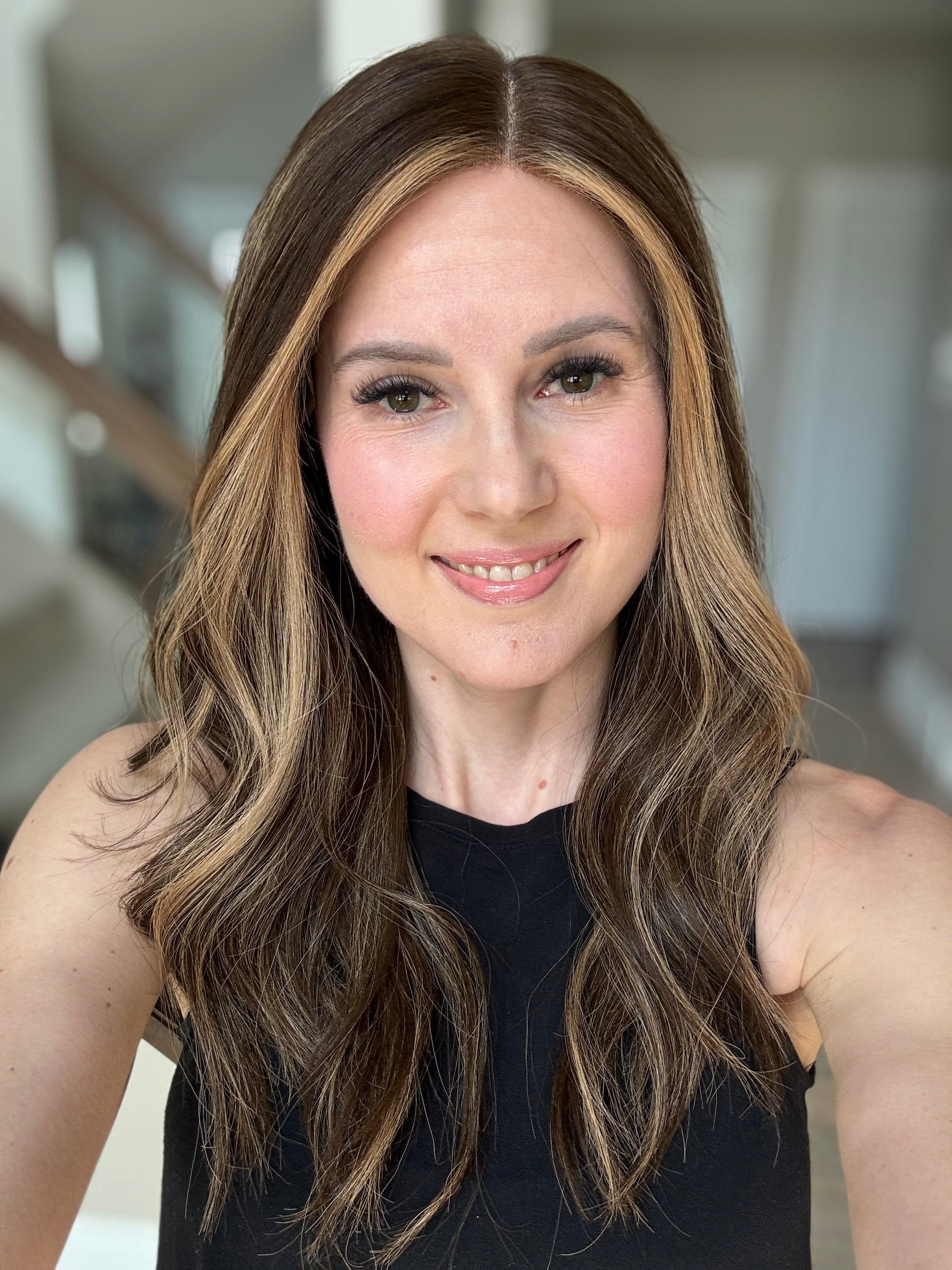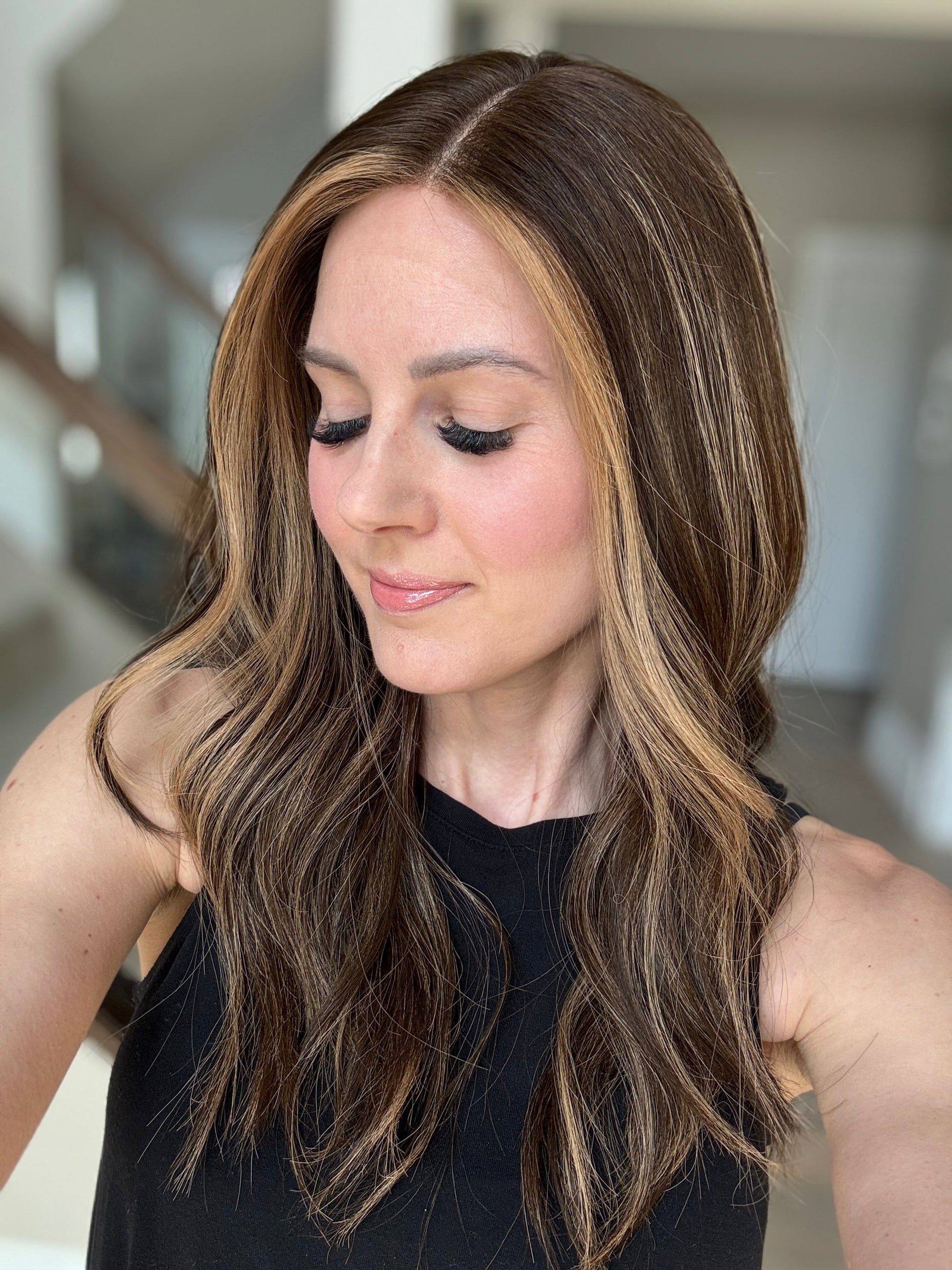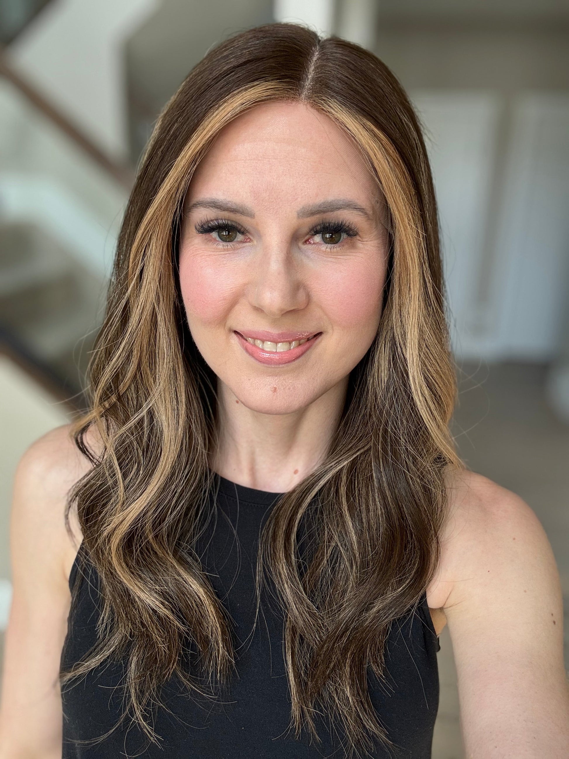 * Color: Dark brown with warm caramel blonde balayage.