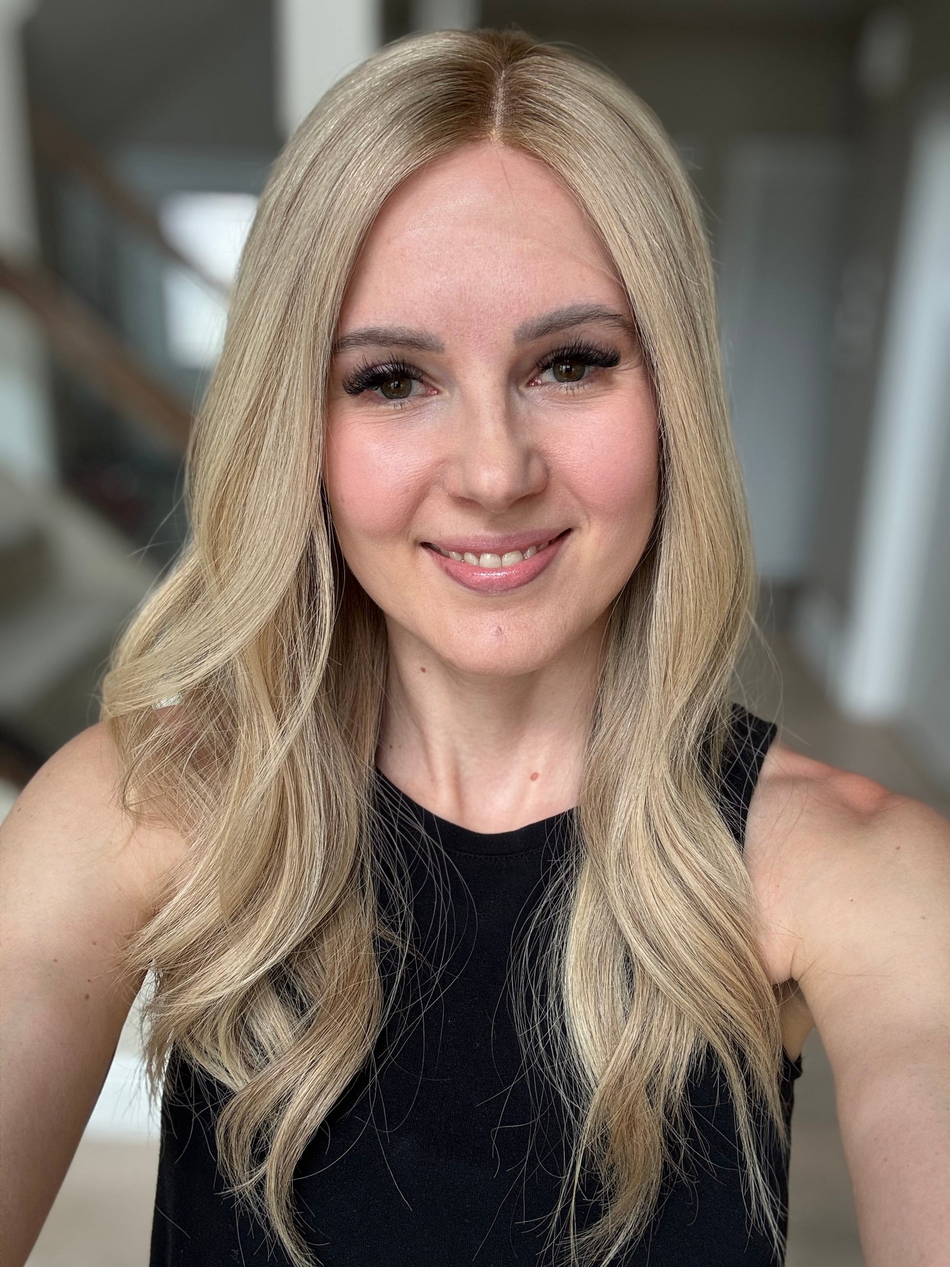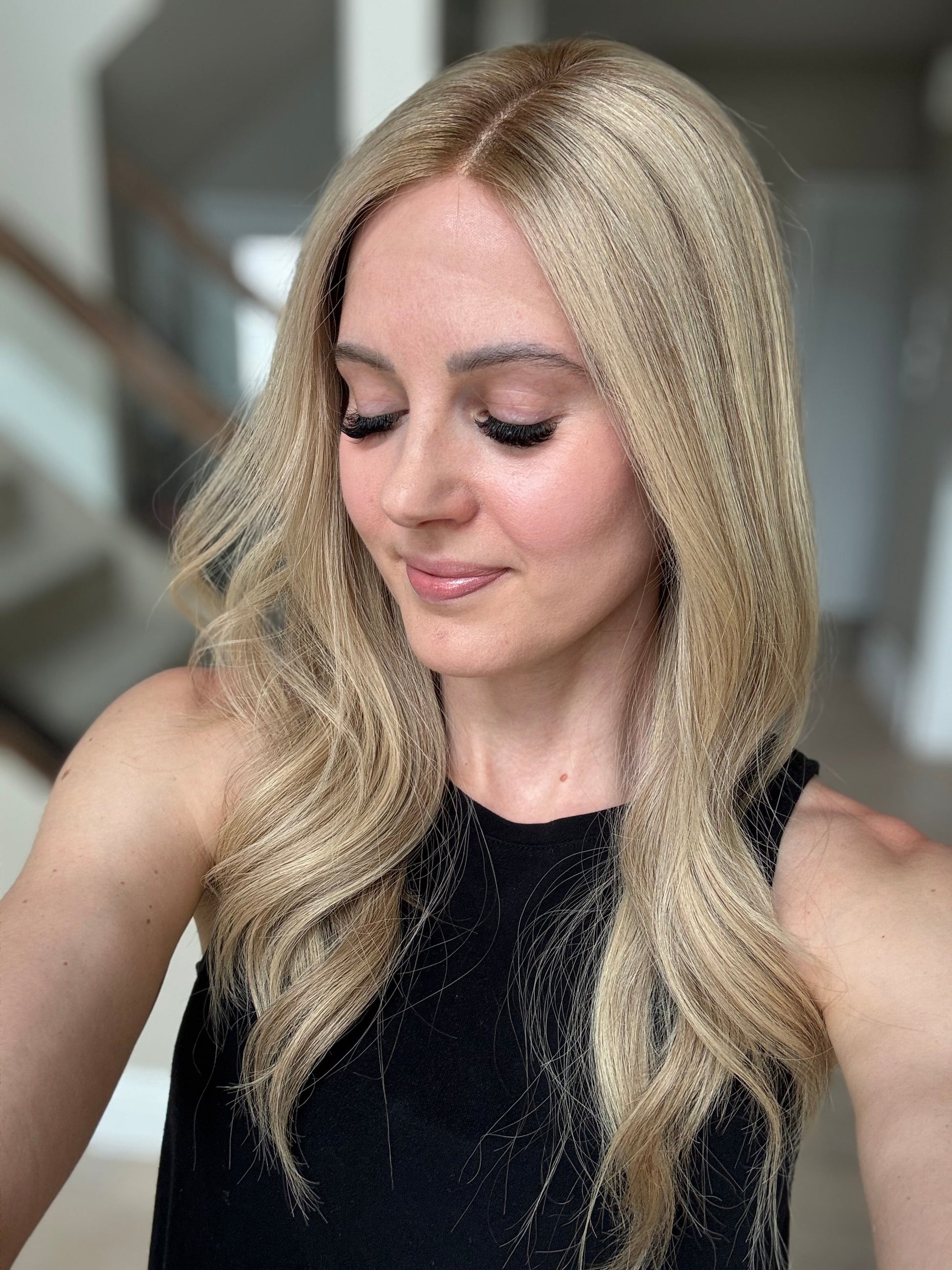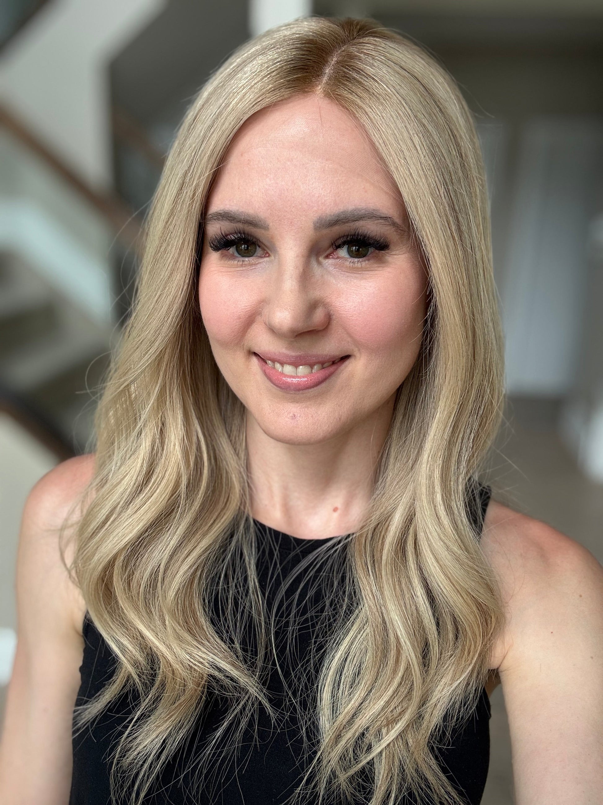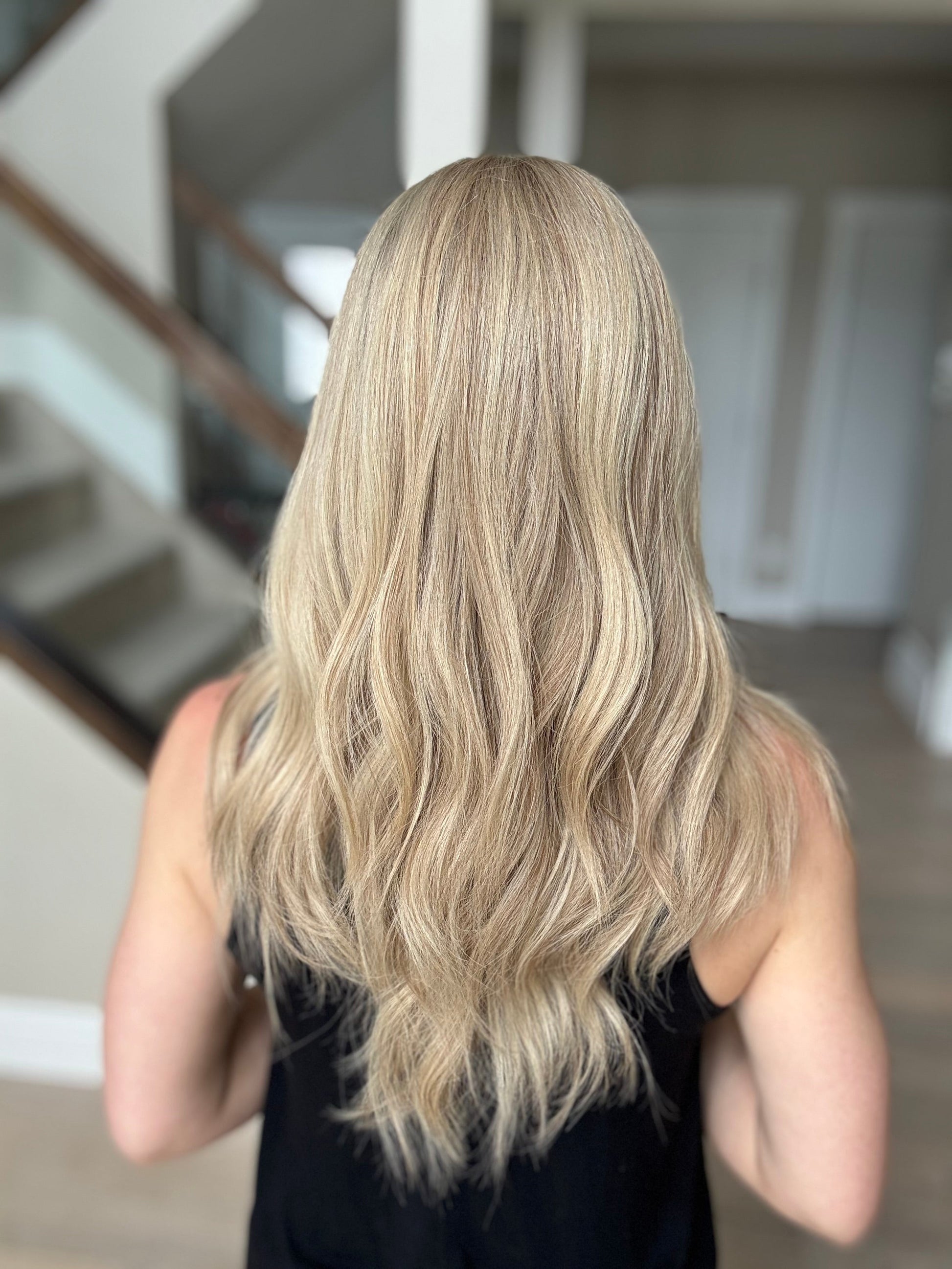 * Color: Neutral-warm medium blonde with hints of dimension and a dark blonde root.