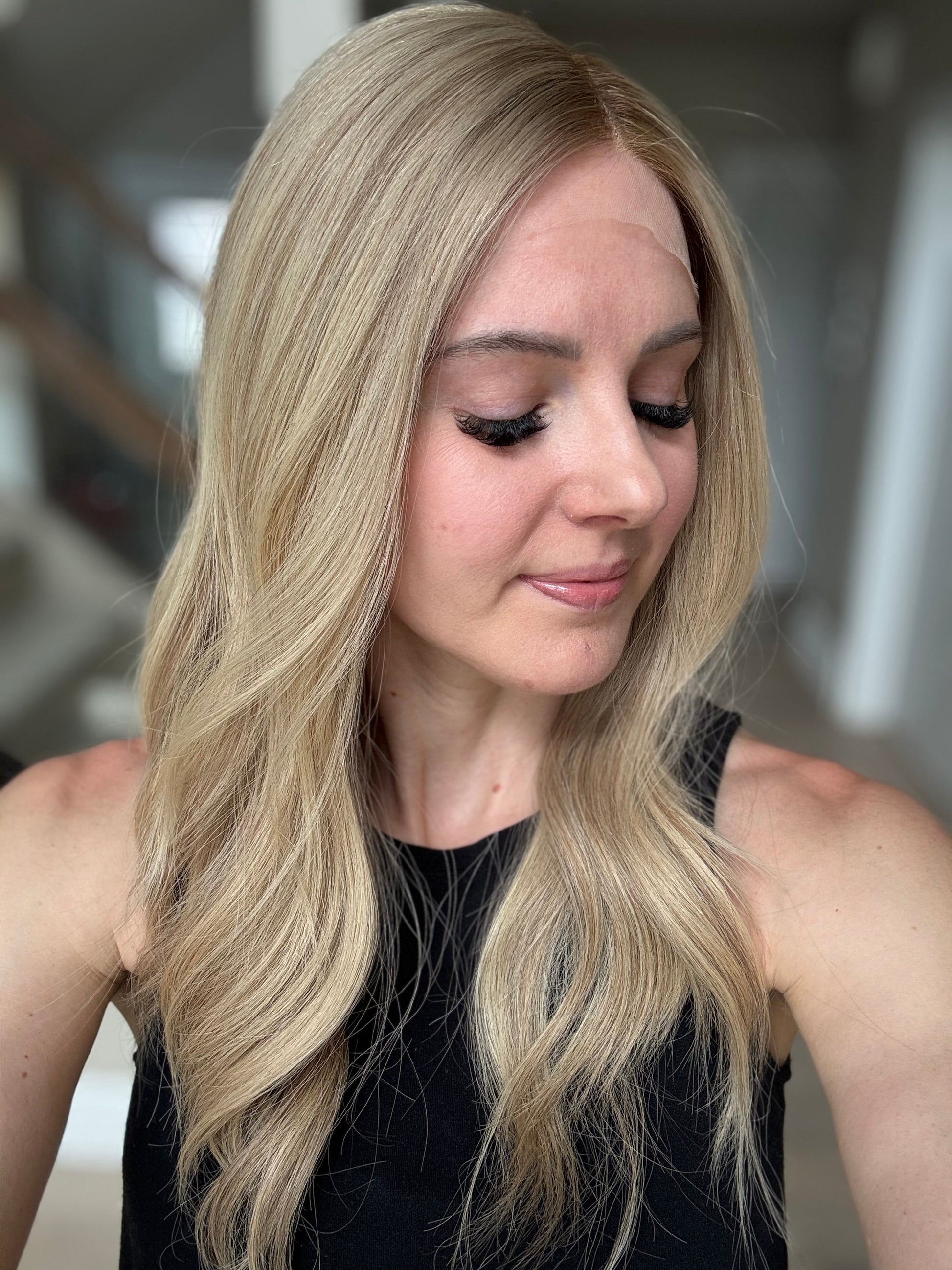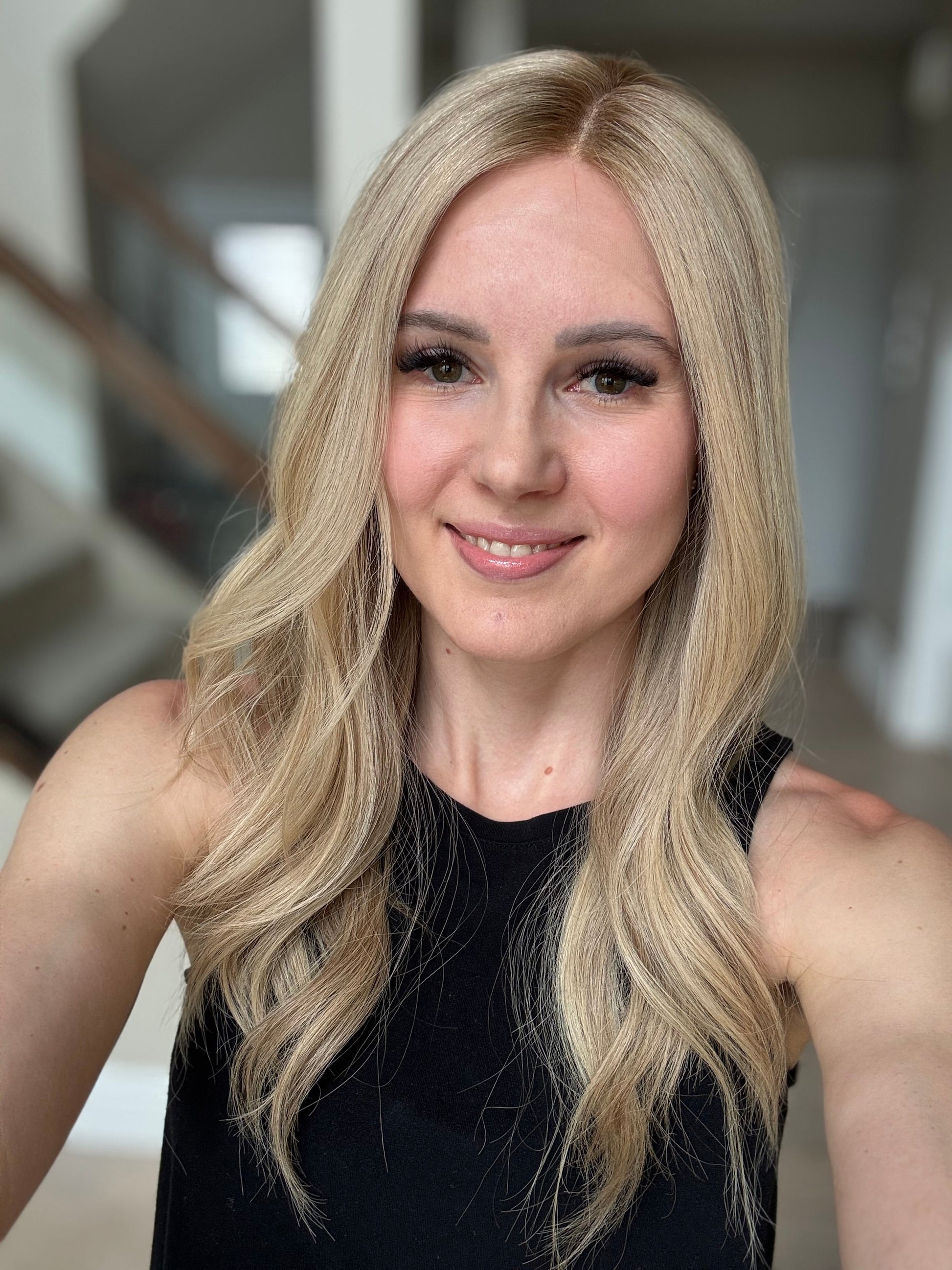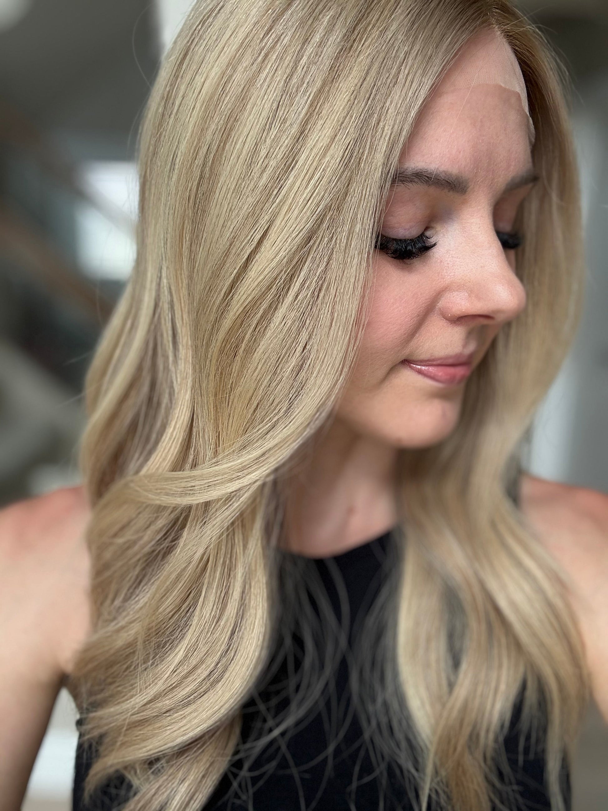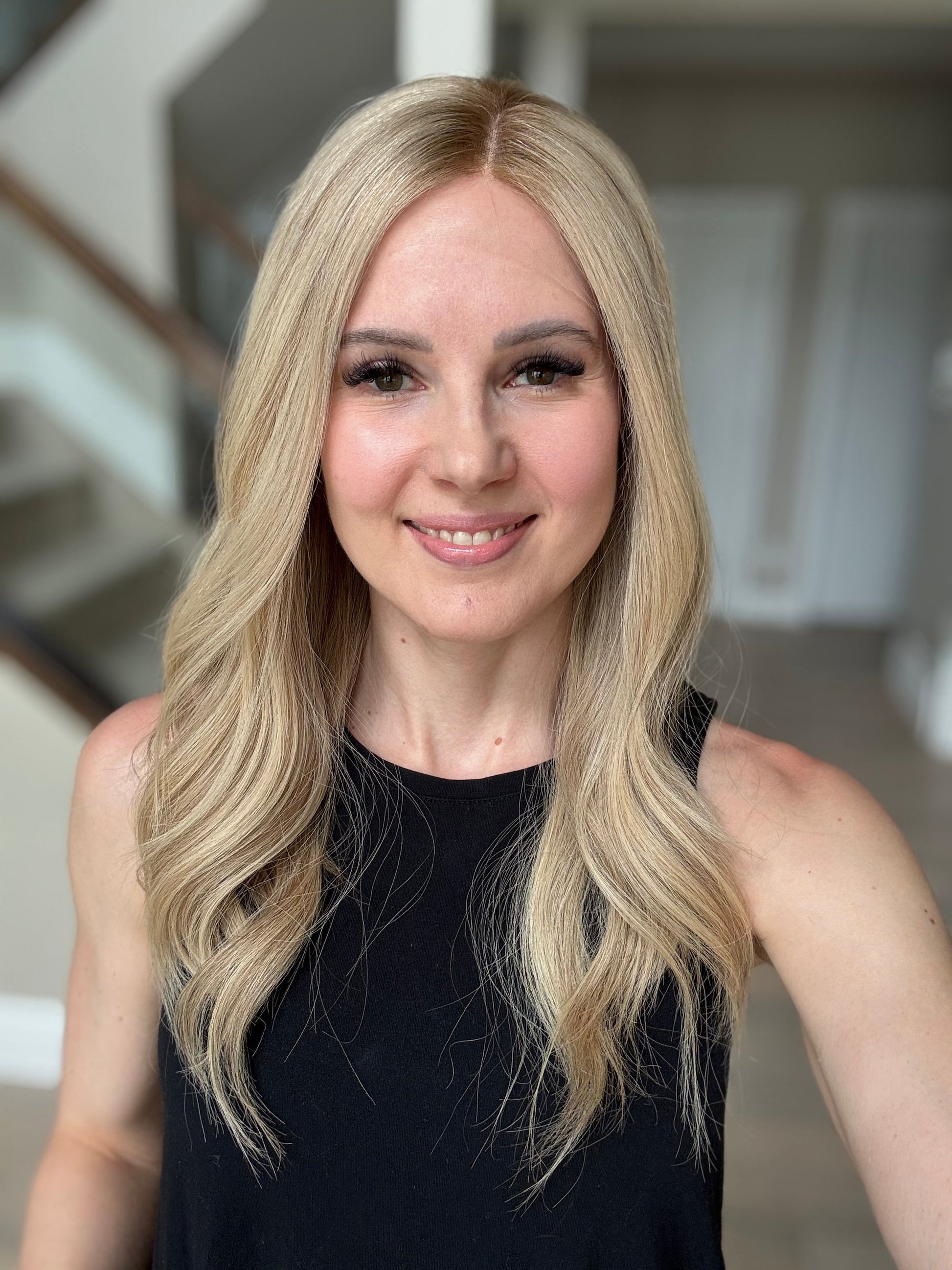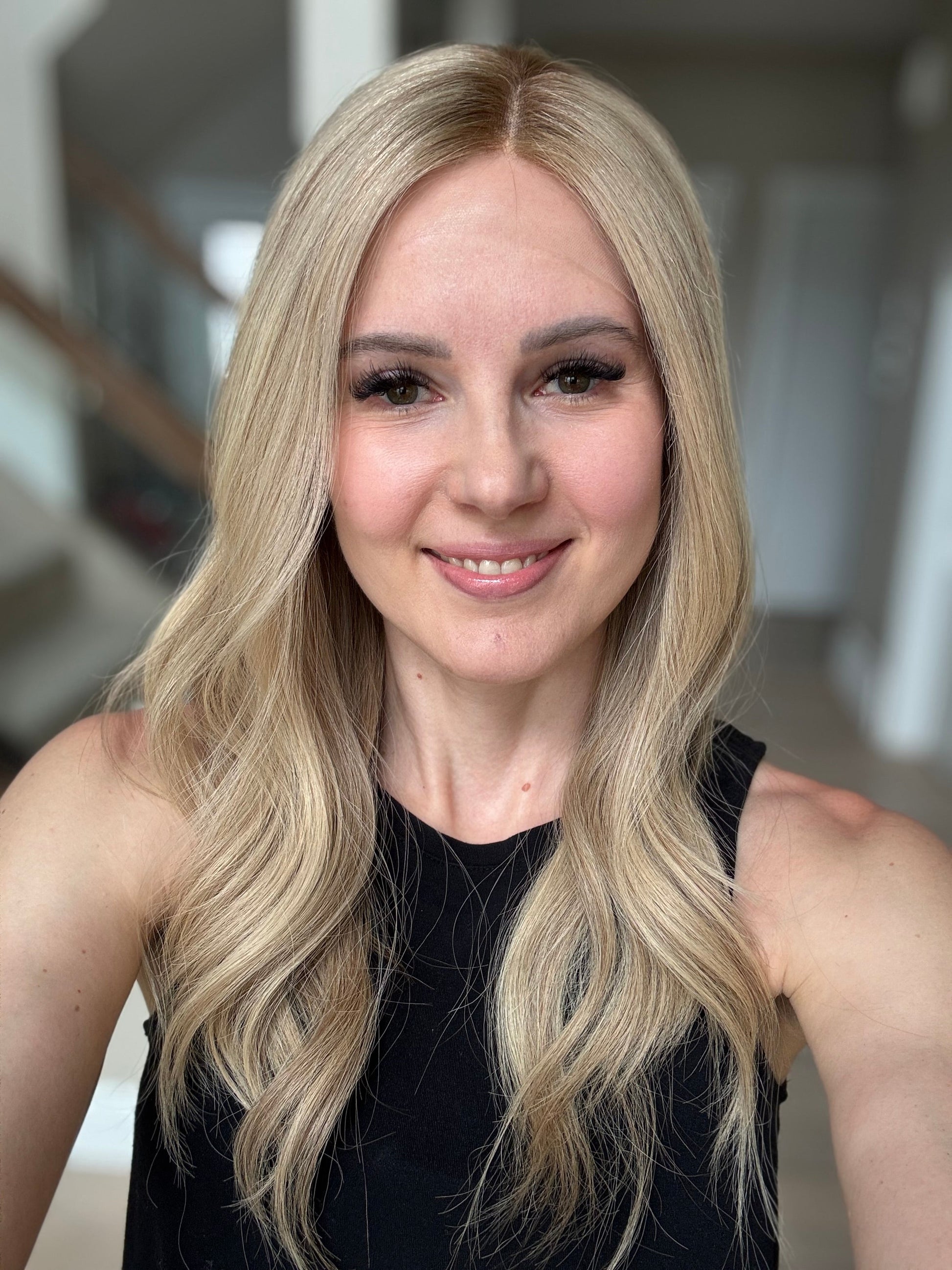 * Color: Neutral-warm medium blonde with hints of dimension and a dark blonde root.