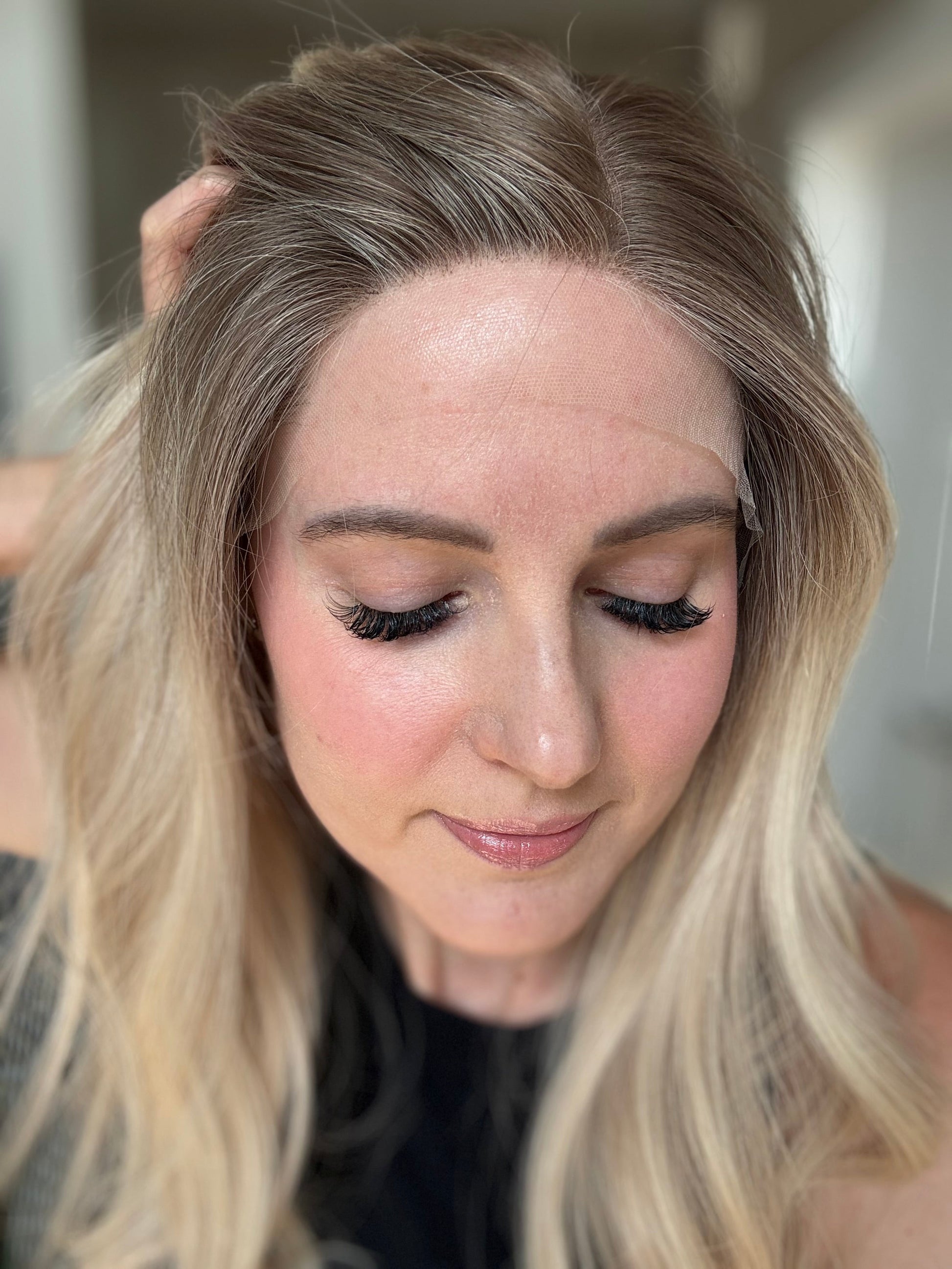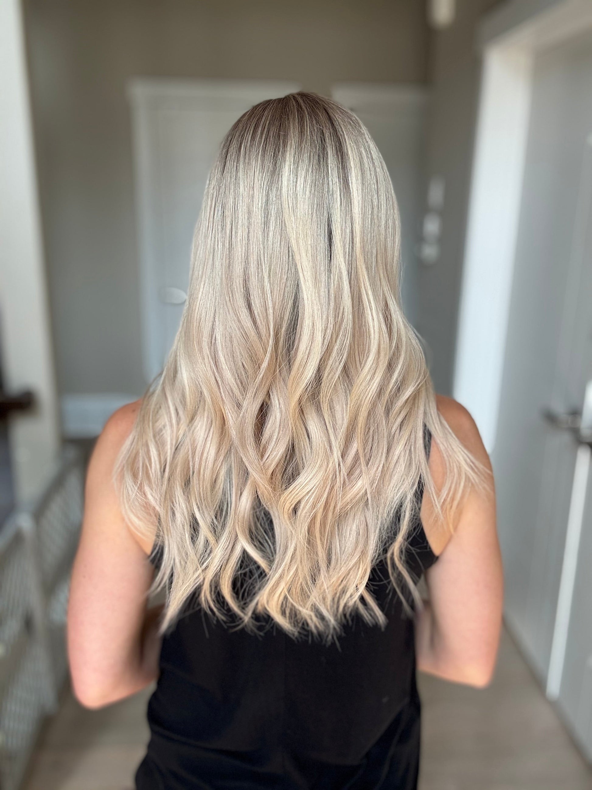* Color: Light neutral blonde with cool dark blonde root melt.