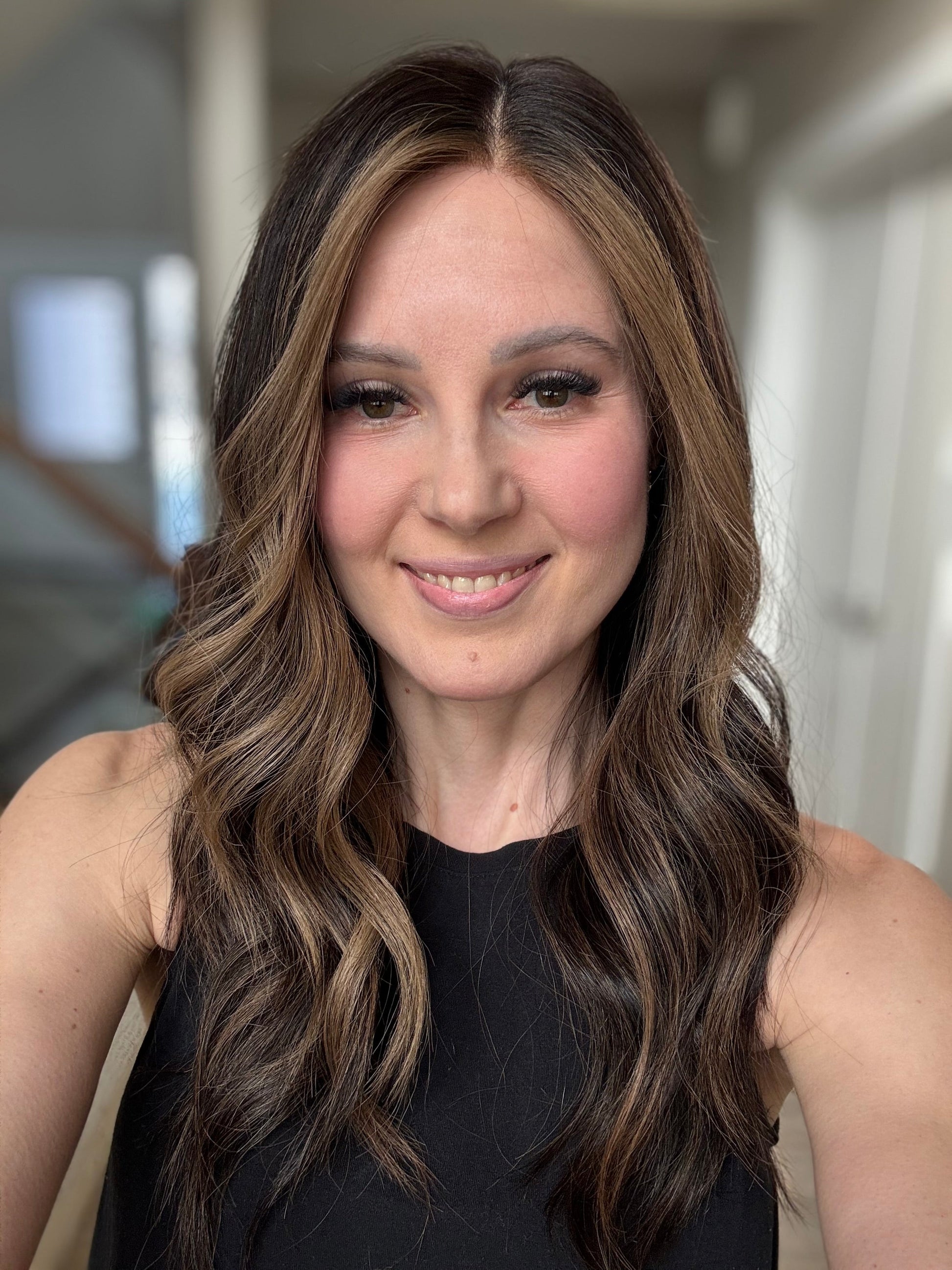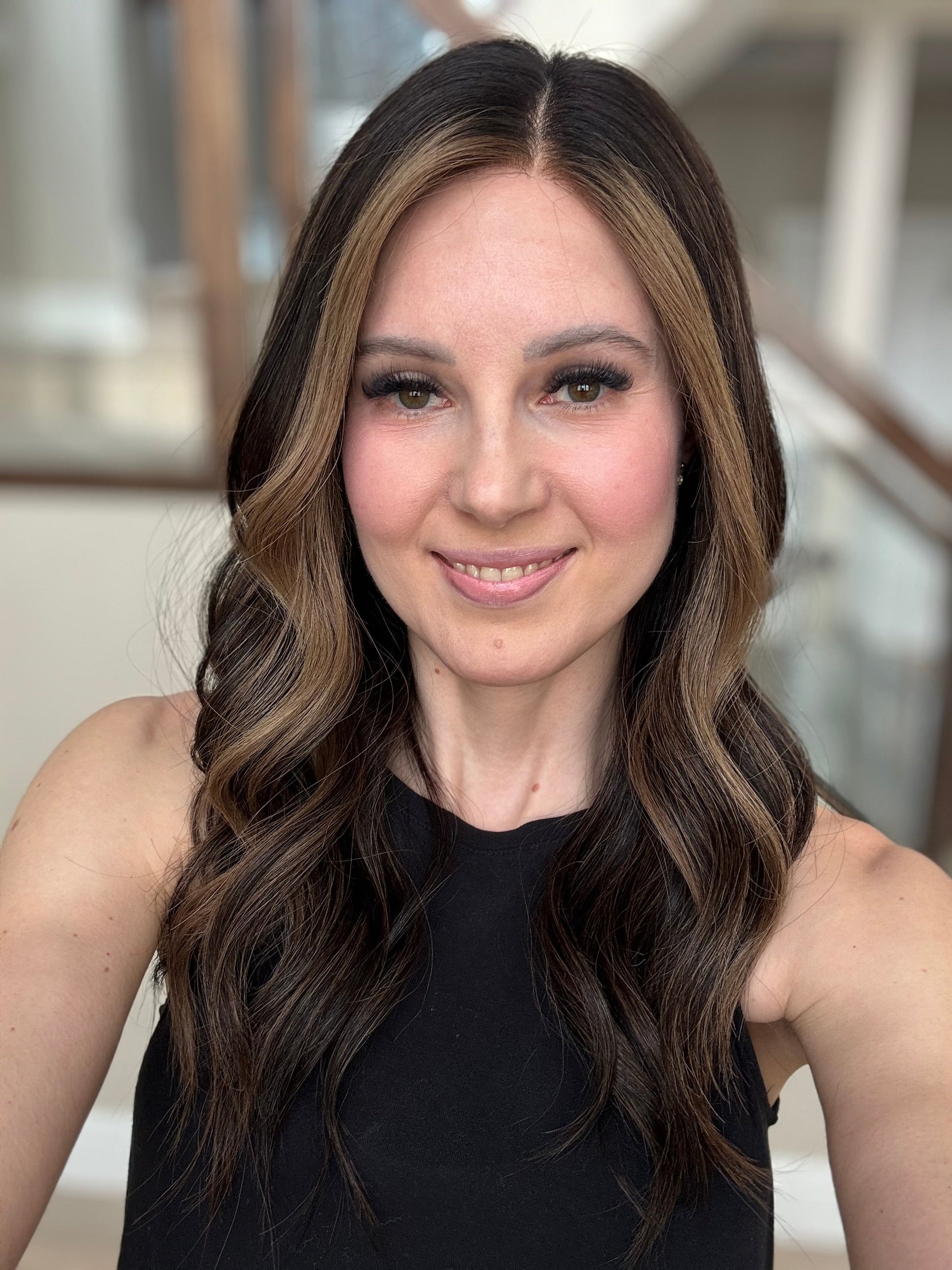 * Color: Darkest brown with beige caramel balayage and front money piece highlights.