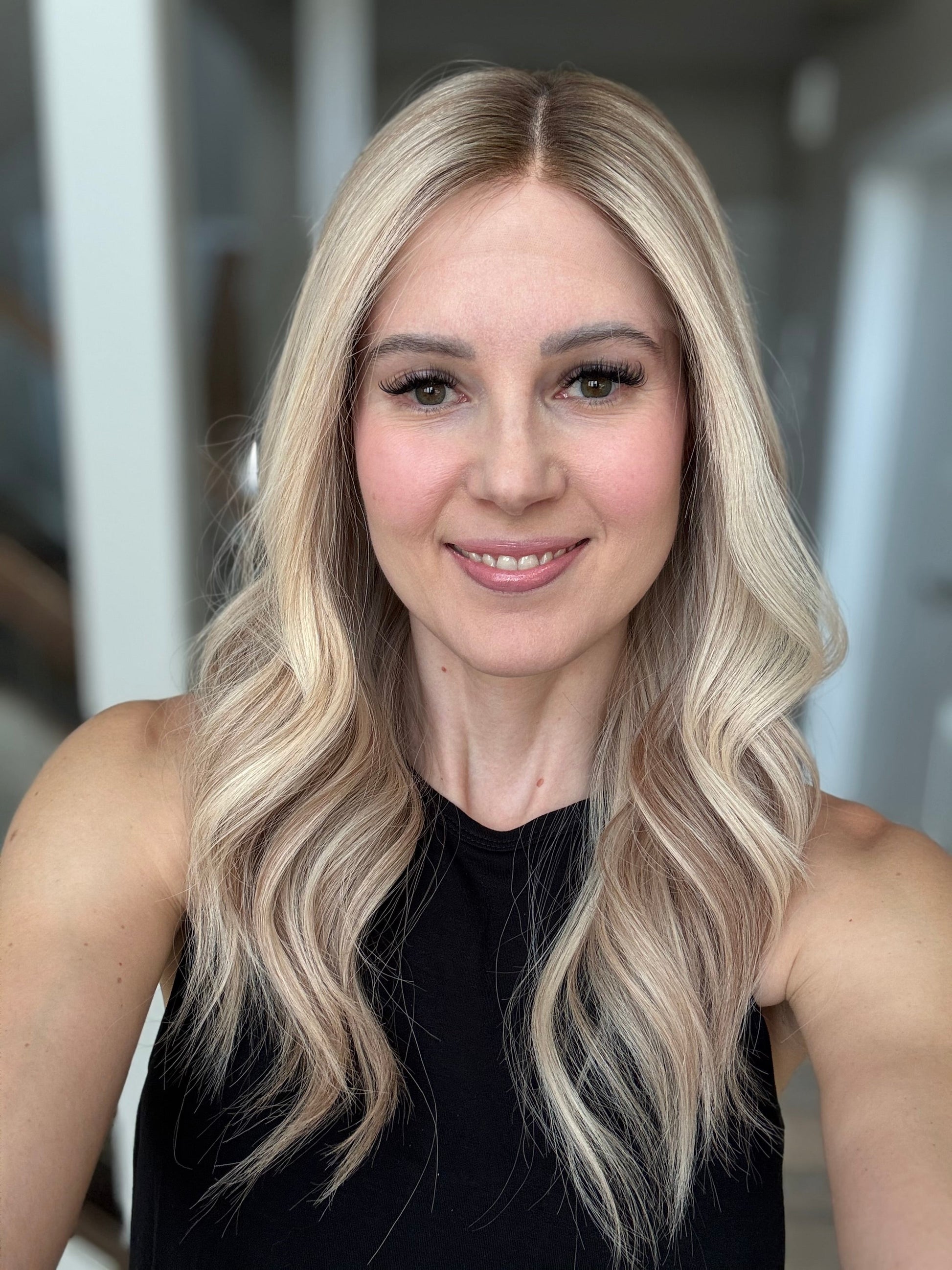 * Color: Light neutral blonde with dimension and a medium brown root.