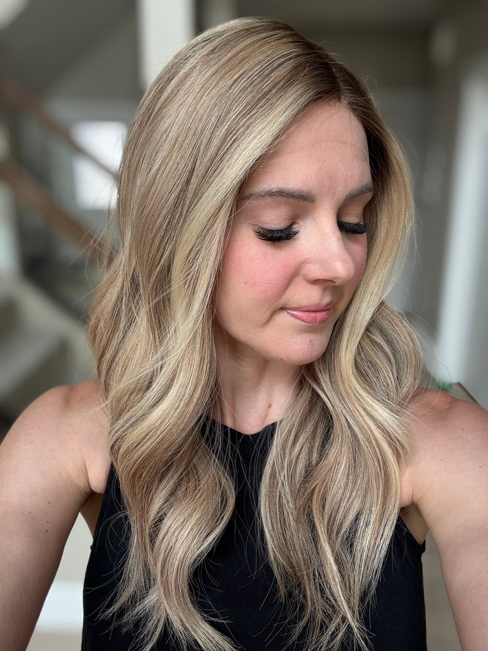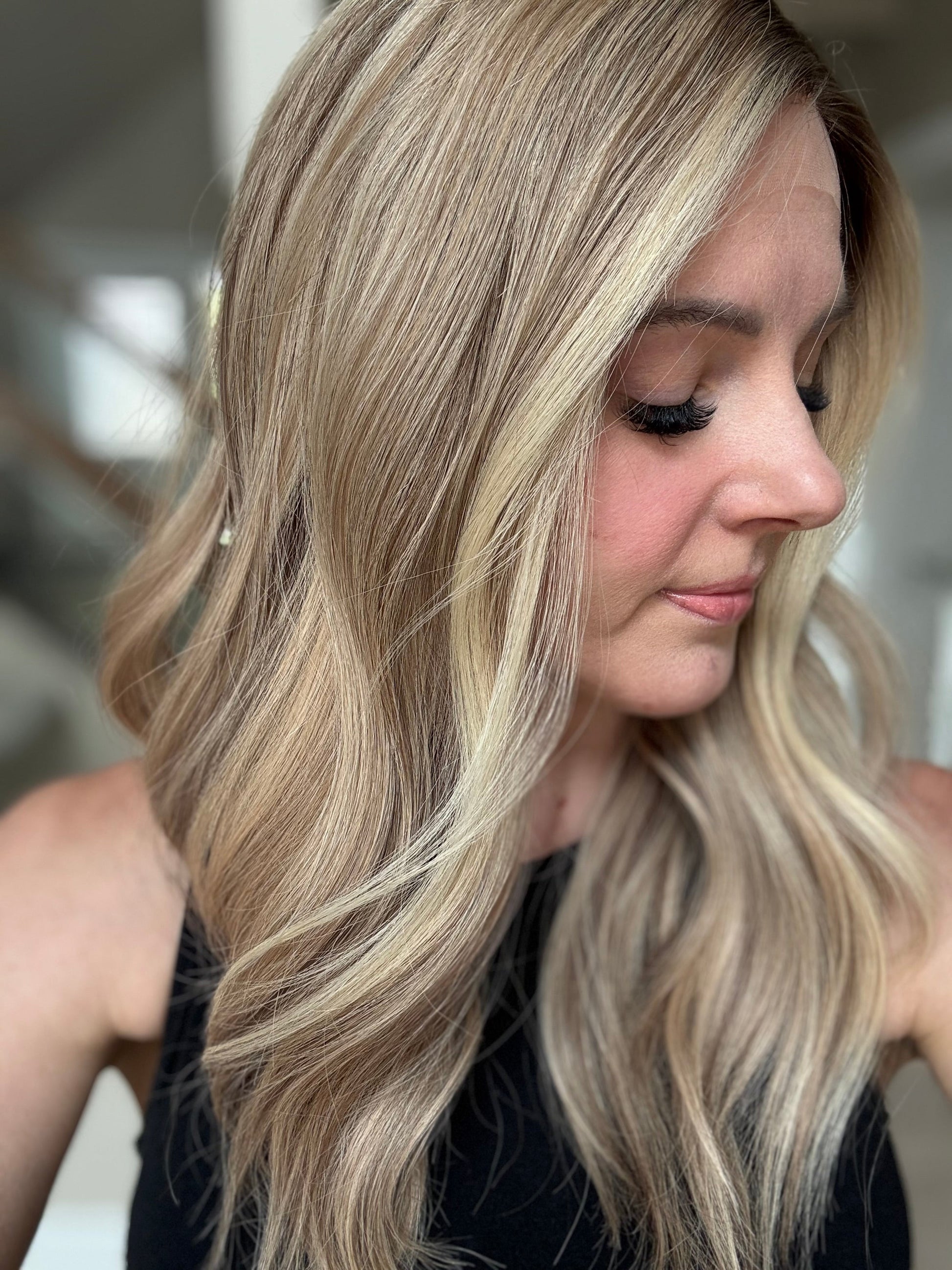 * Color: Medium neutral blonde with dimension and a medium brown shadow root.