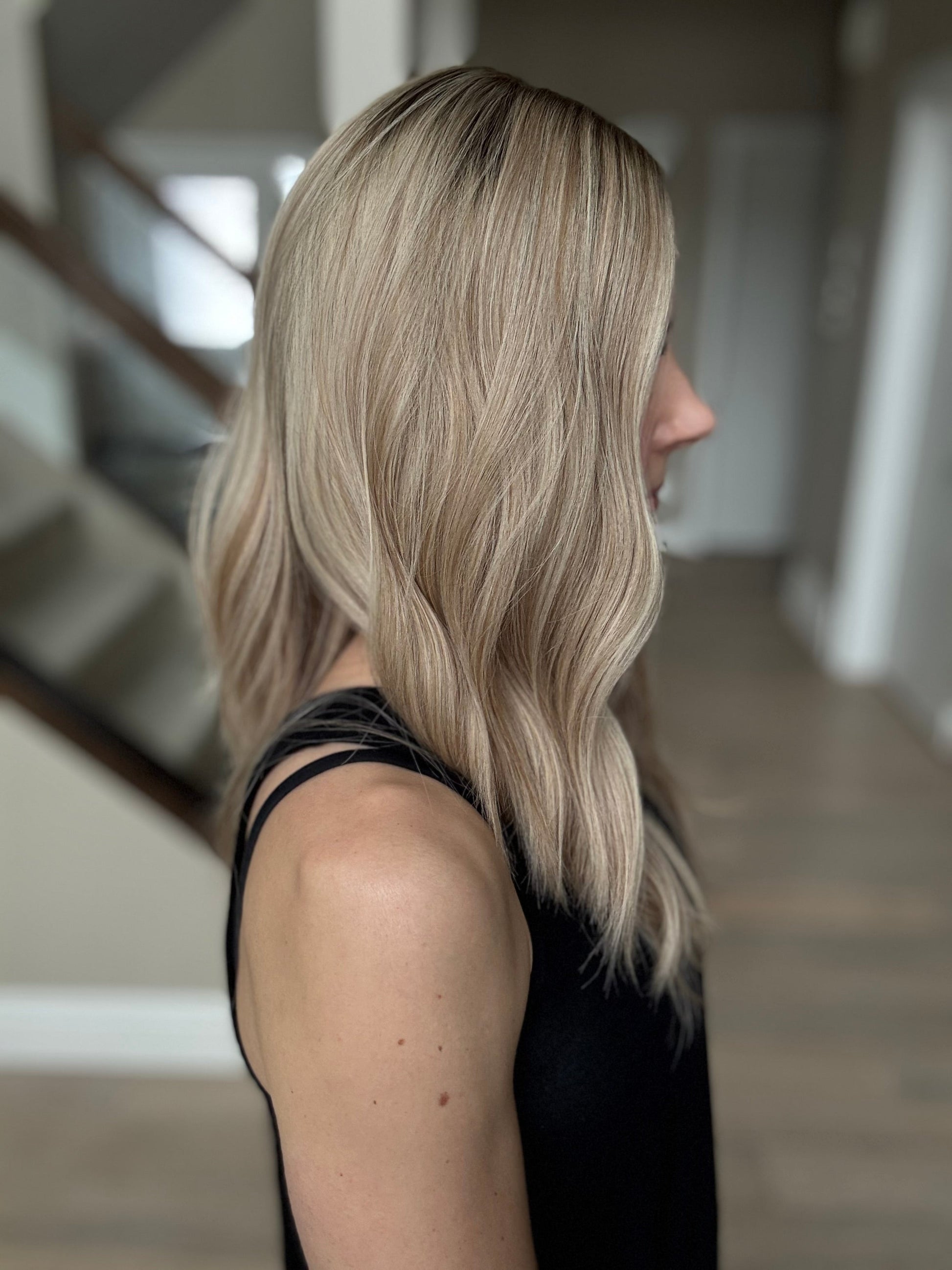 * Color: Light neutral blonde with darker blonde neutral to warm lowlights and a dark blonde root.