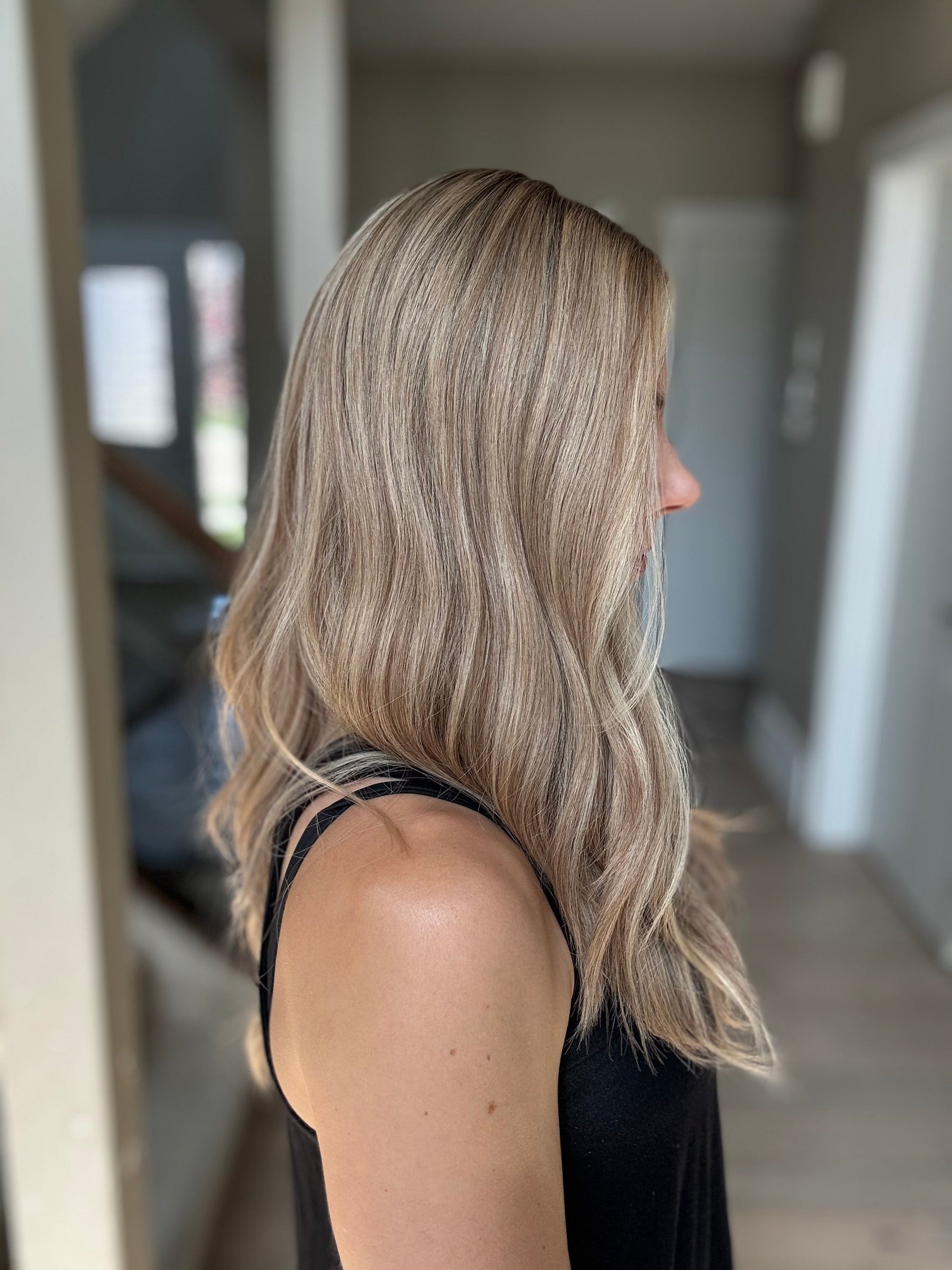 * Color: Neutral dimensional blonde with a medium/dark brown root.