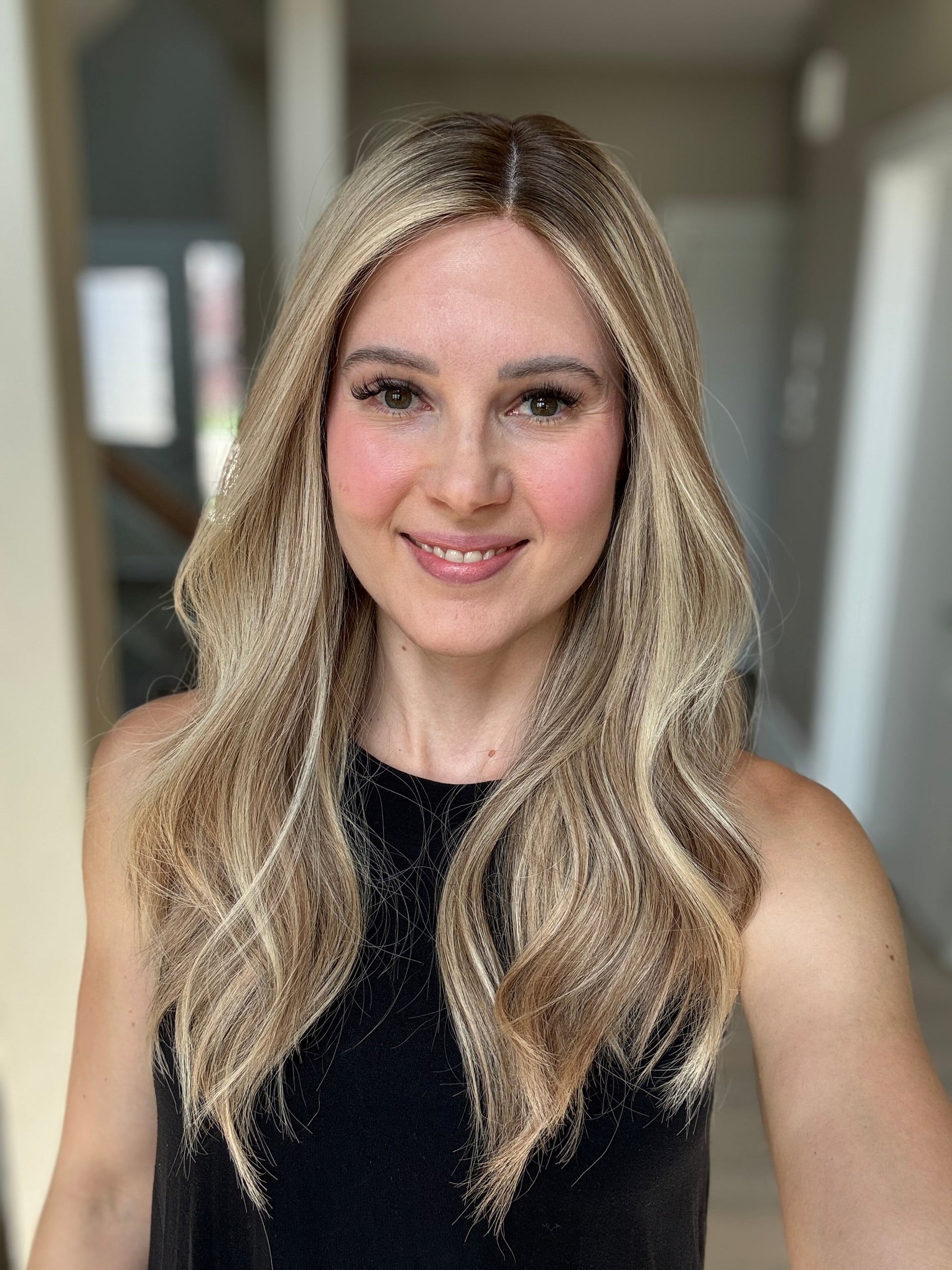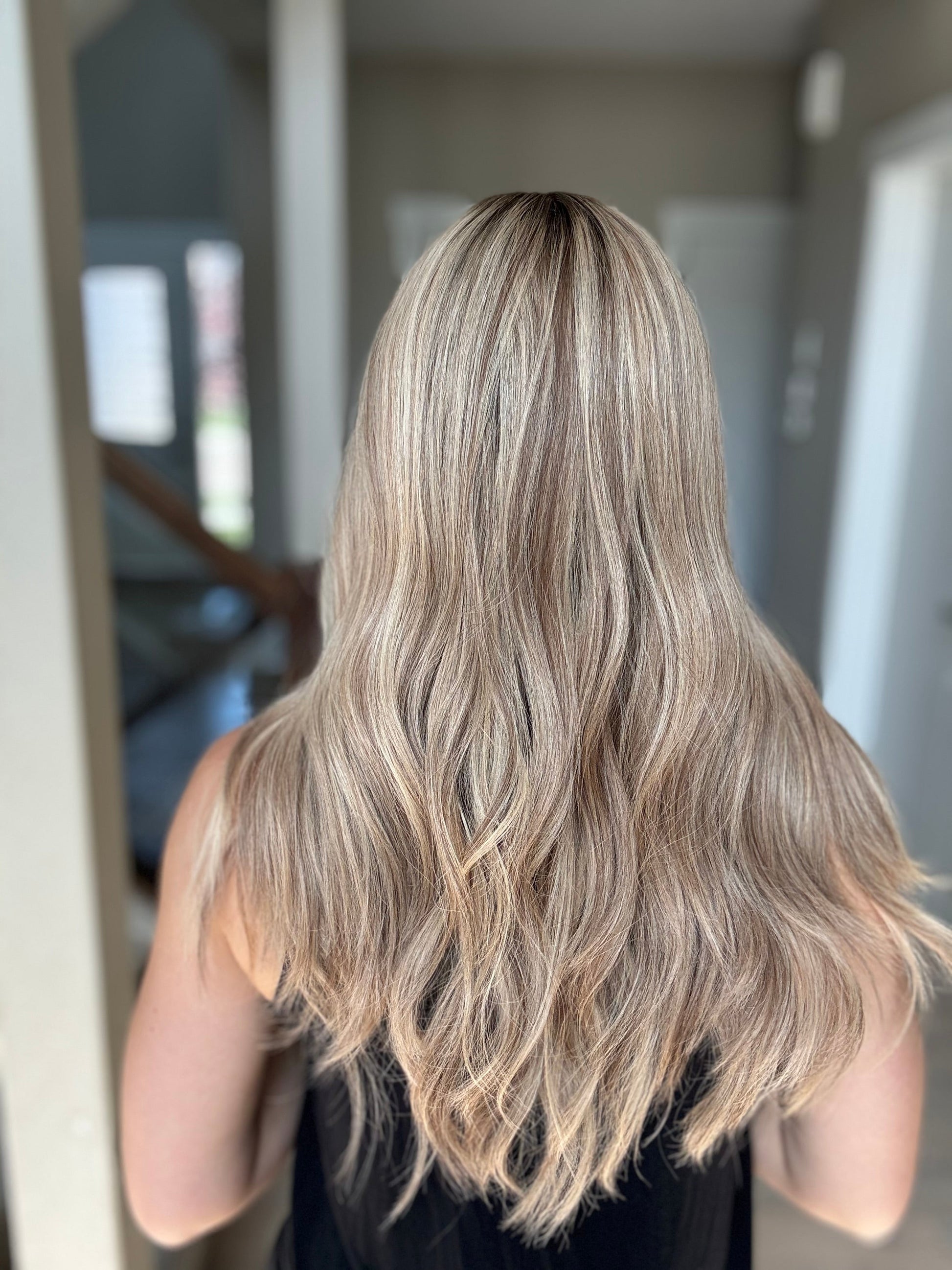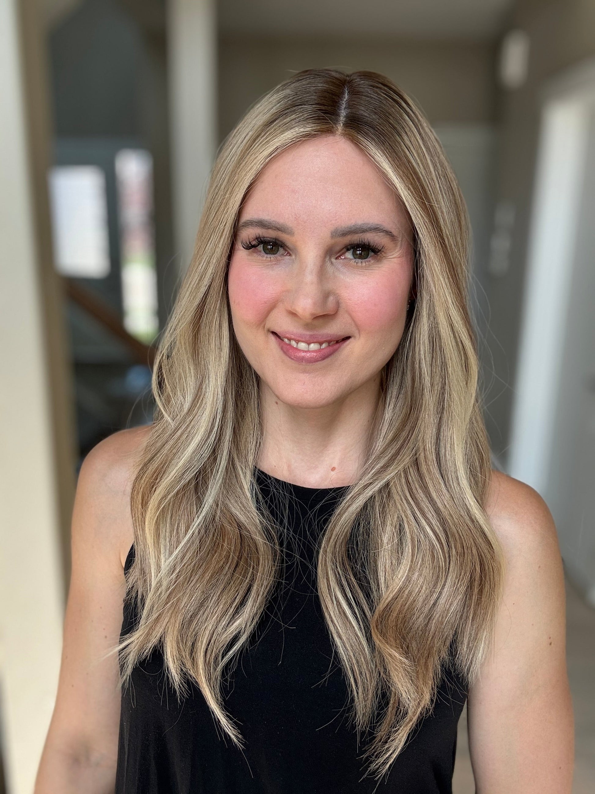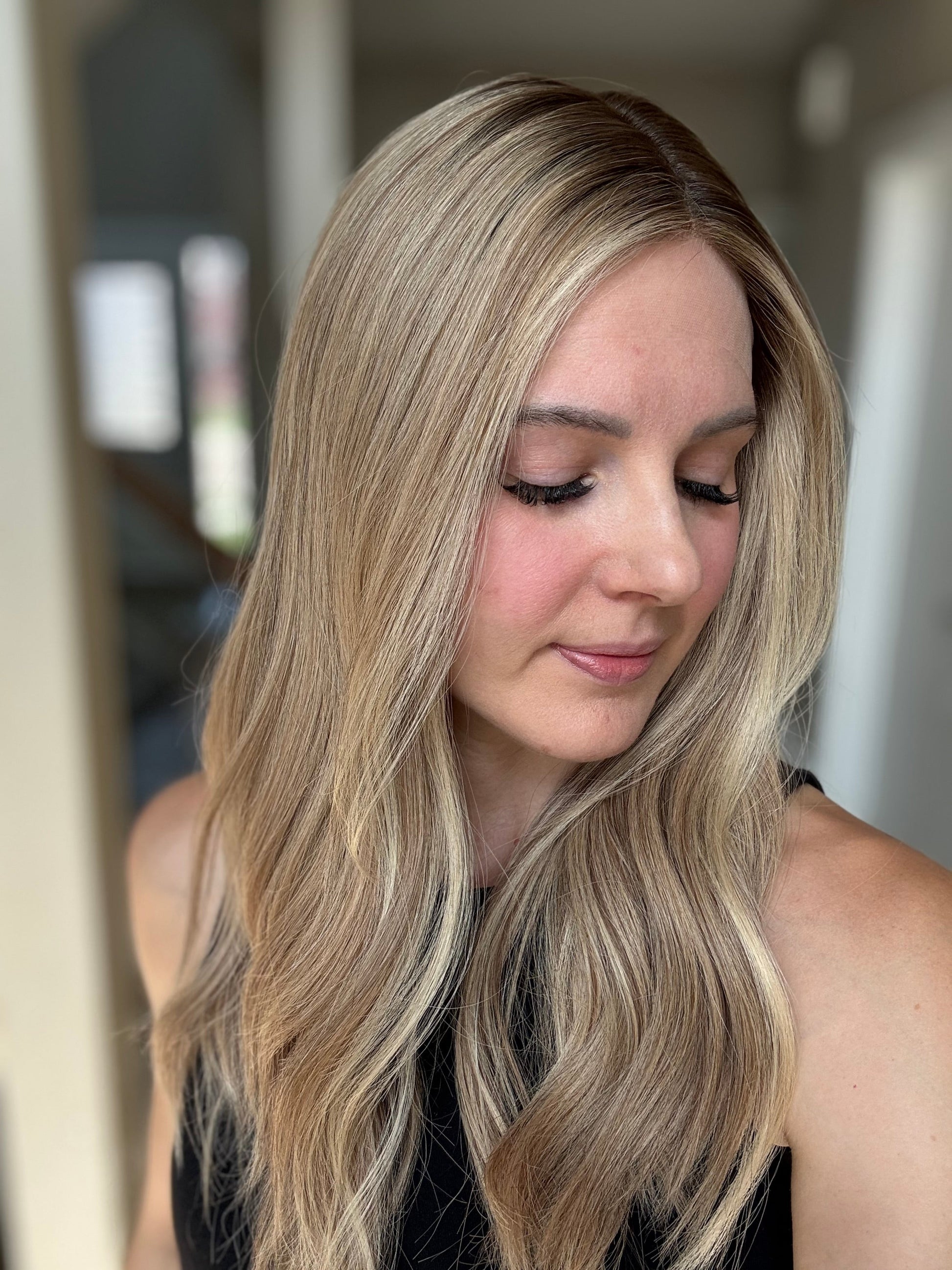 * Color: Neutral dimensional blonde with a medium/dark brown root.