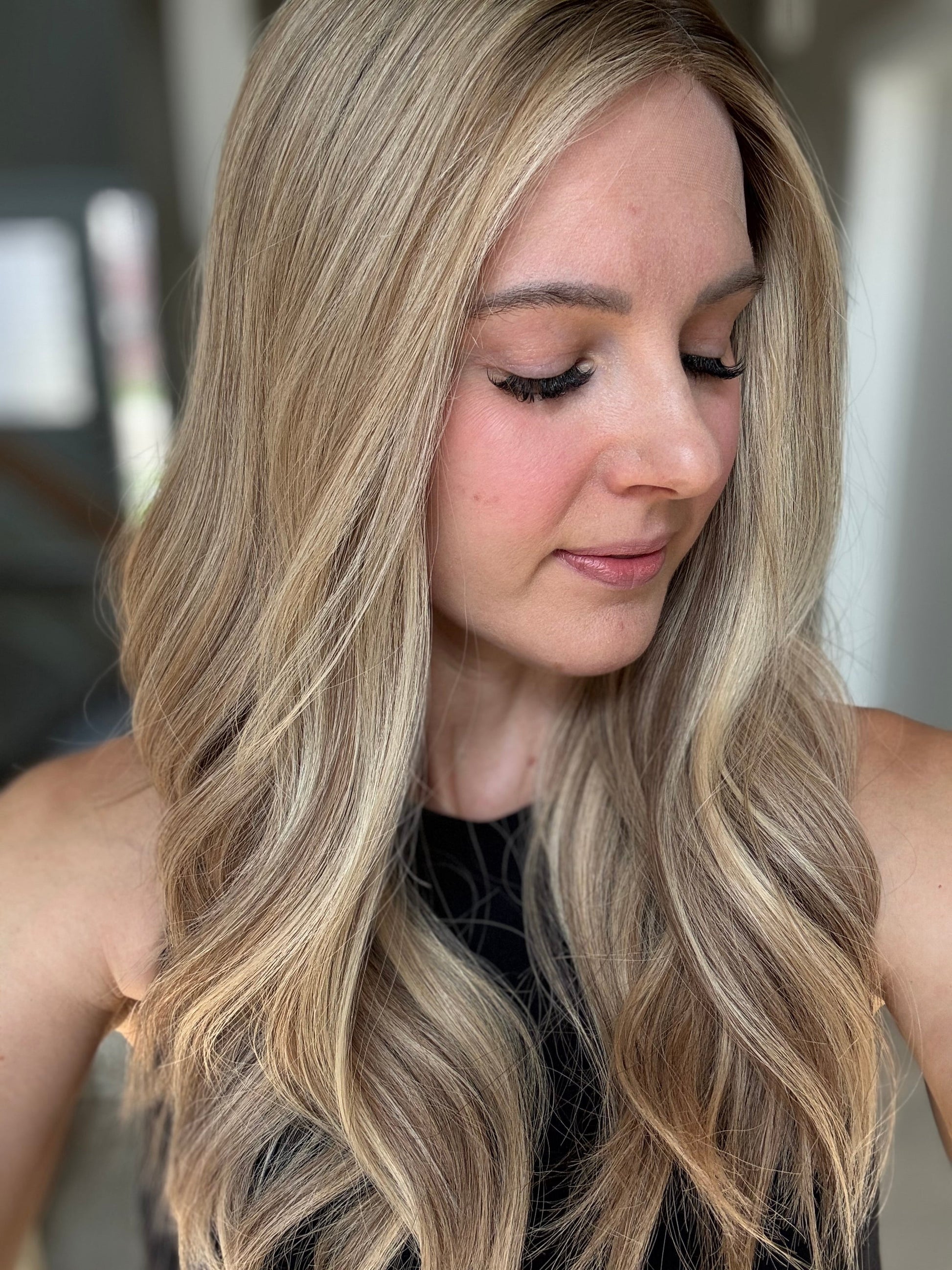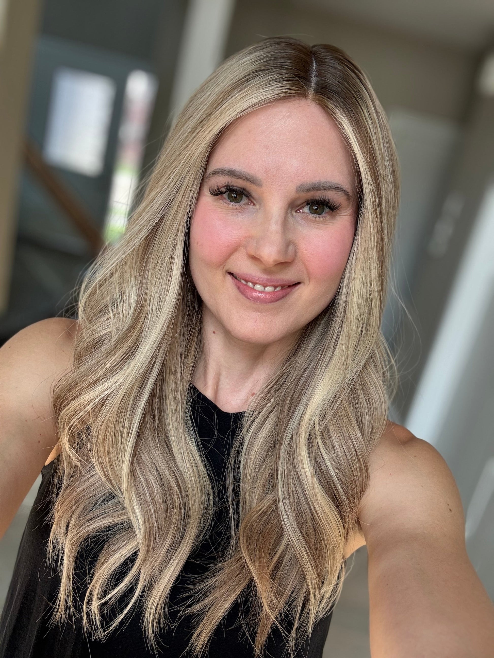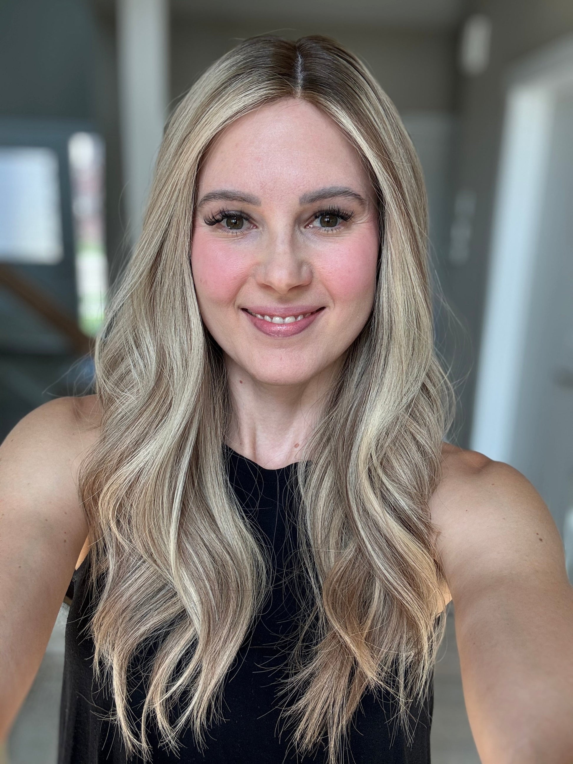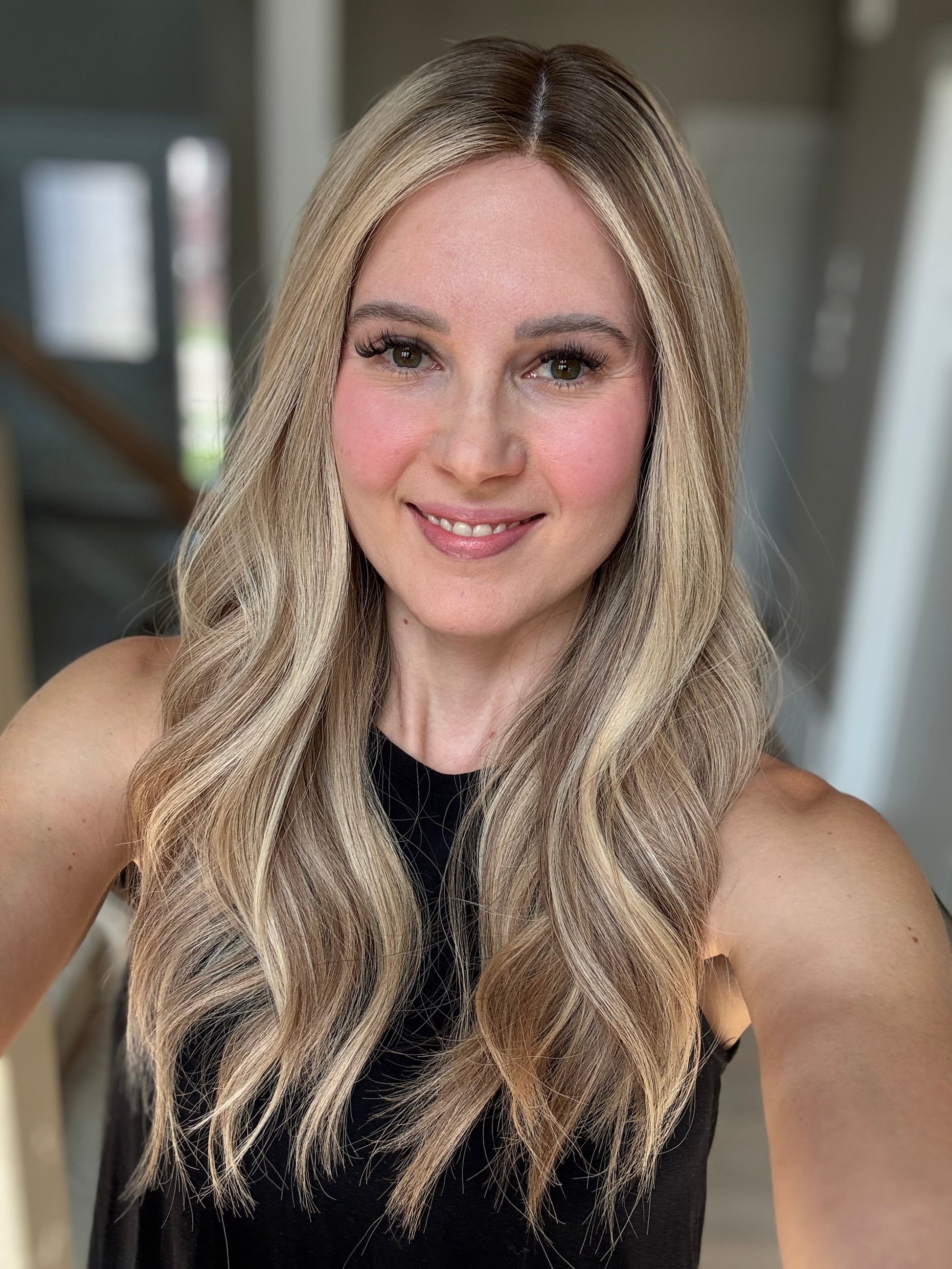 * Color: Neutral dimensional blonde with a medium/dark brown root.