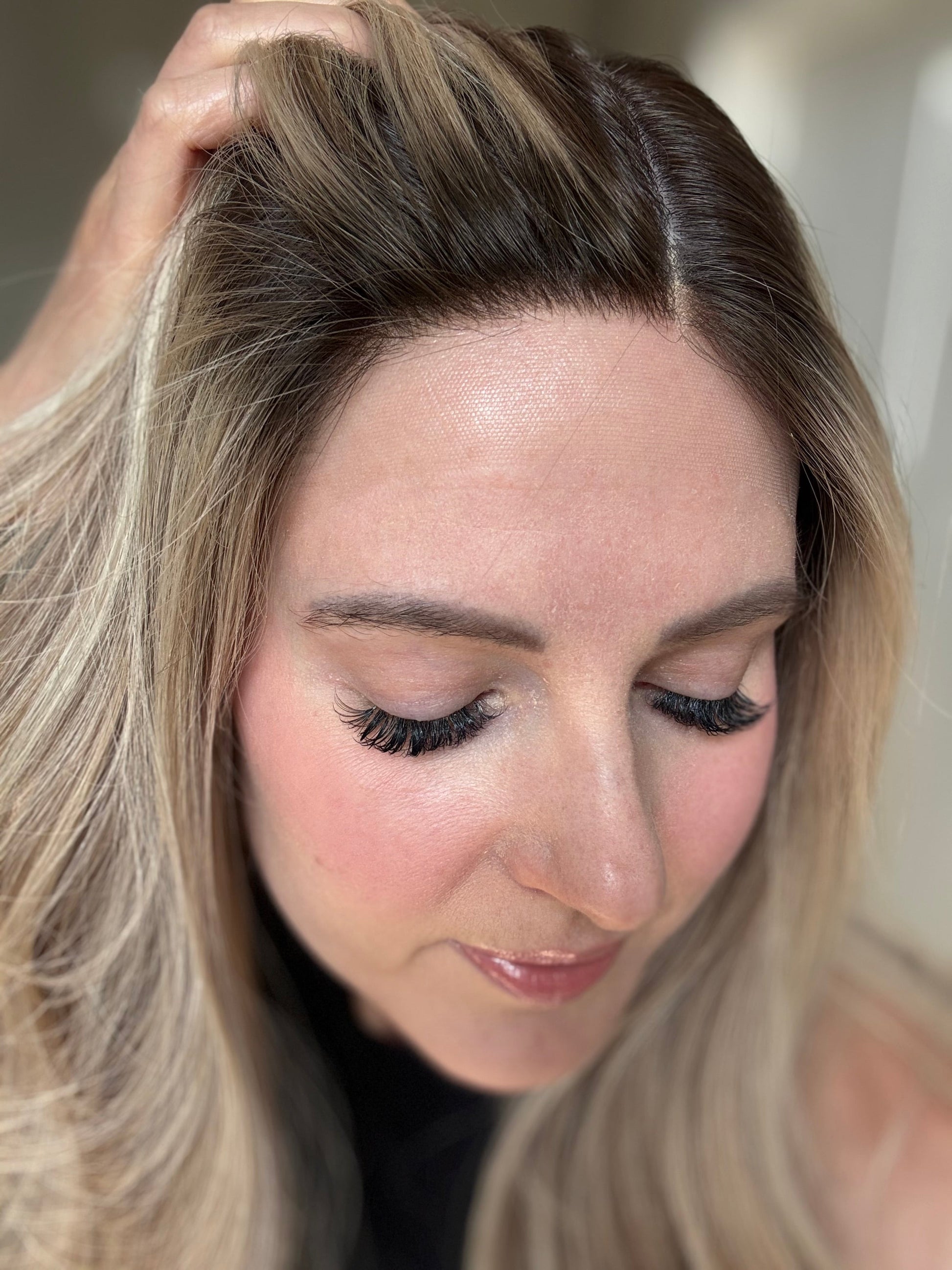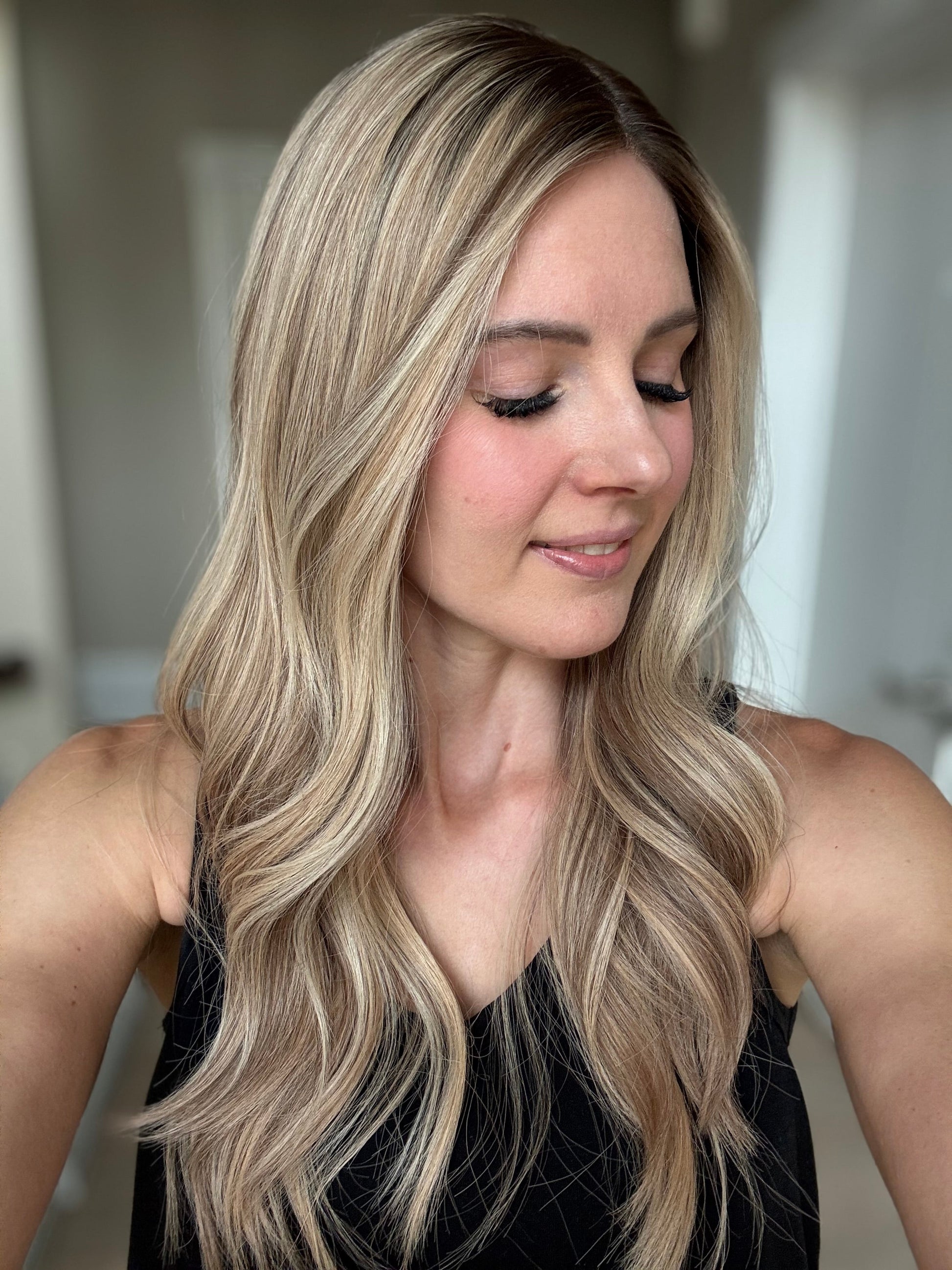 * Color: Neutral medium blonde with dimension and a short dark brown root.