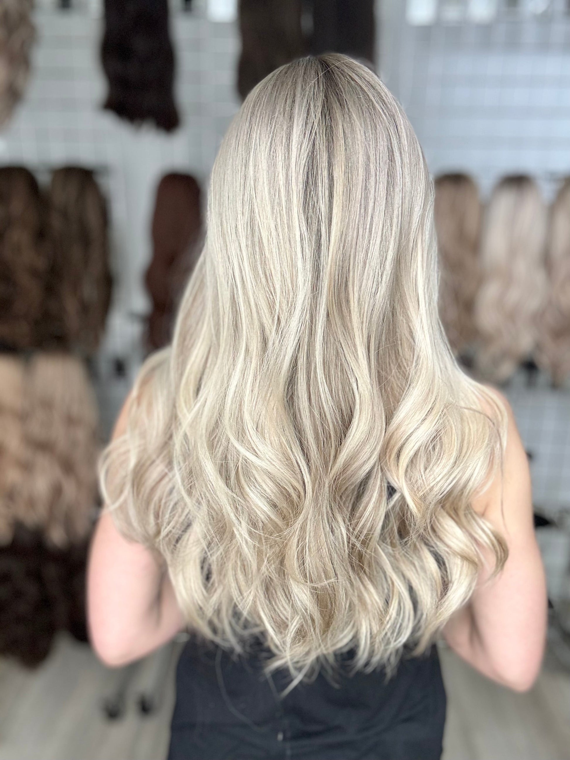 * Color: Neutral to slightly warm light blonde with a neutral reverse balayage root and subtle lowlights.