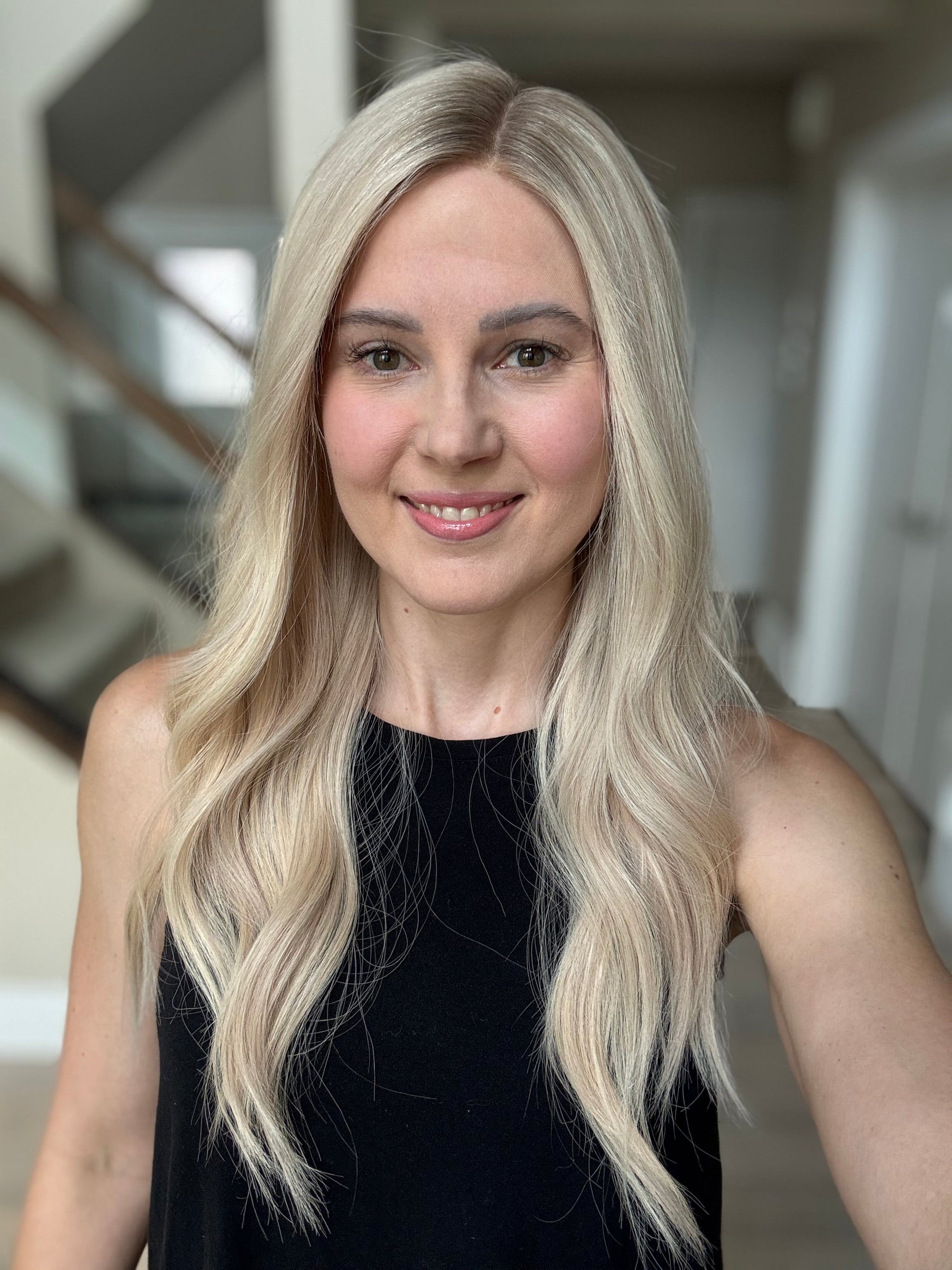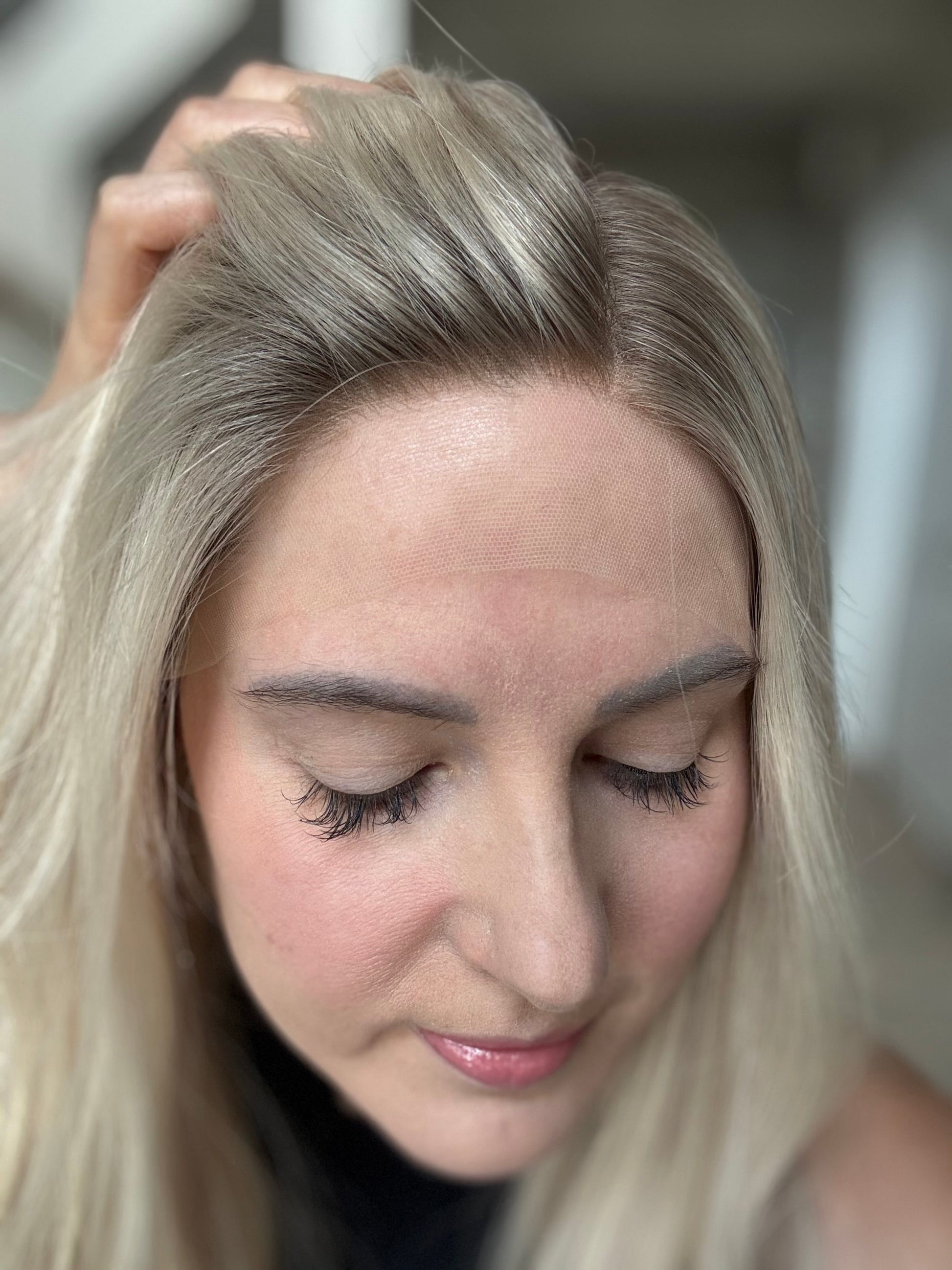 * Color: Light neutral-cool blonde with subtle dimension and a cool dark blonde root.