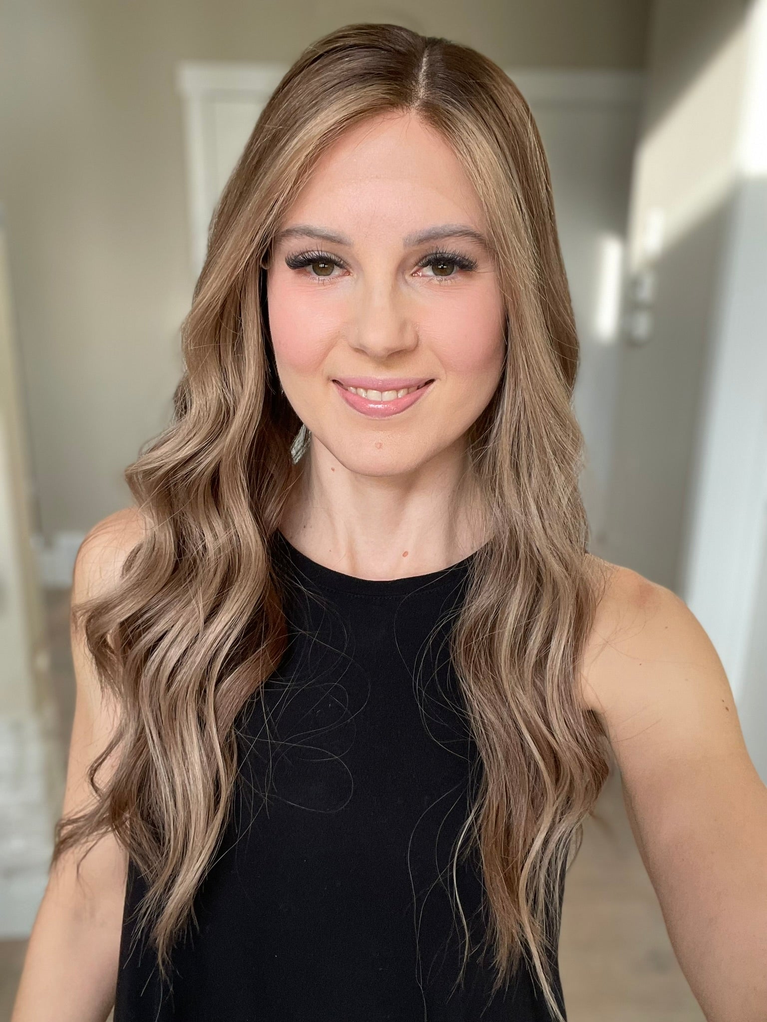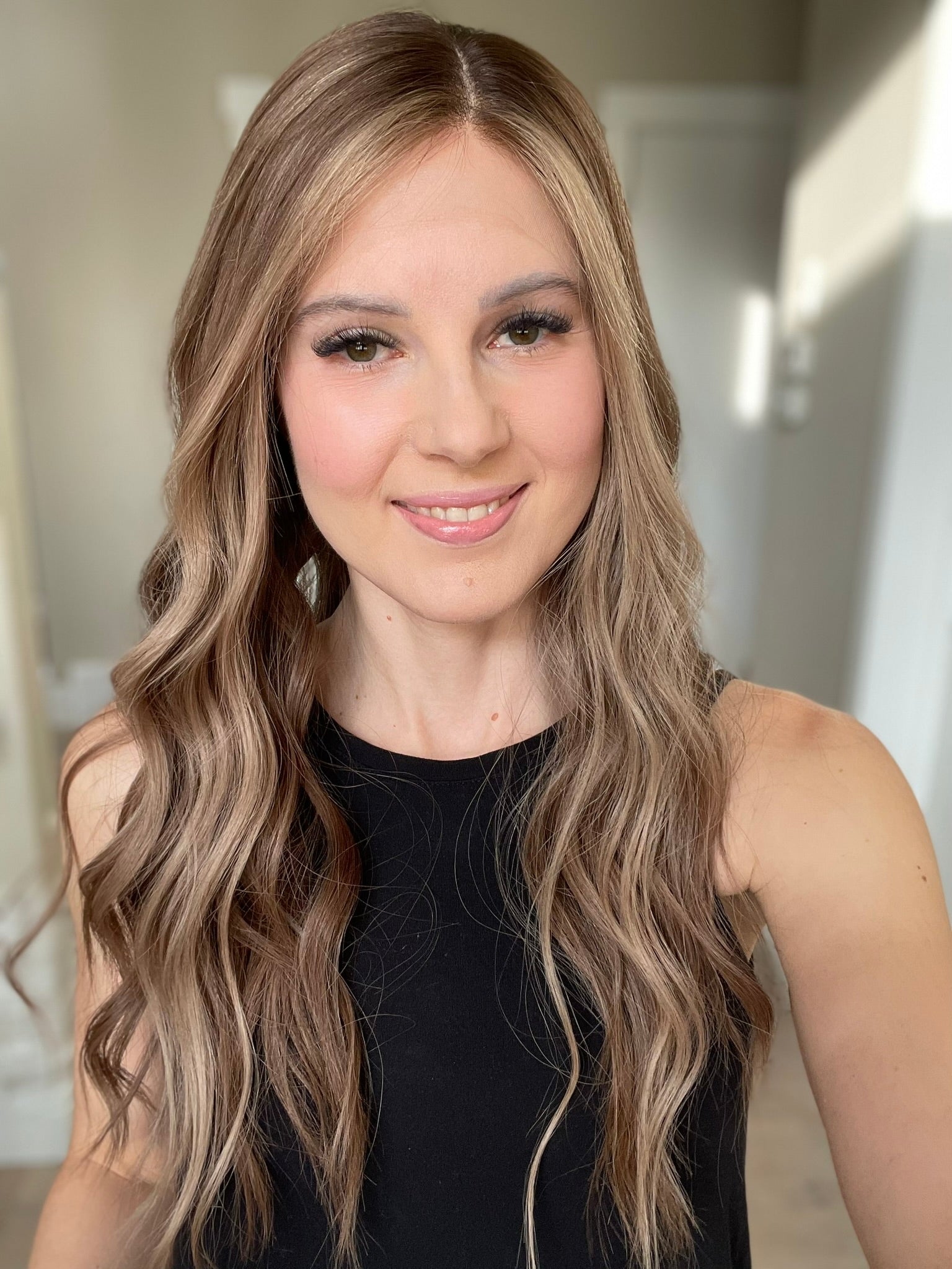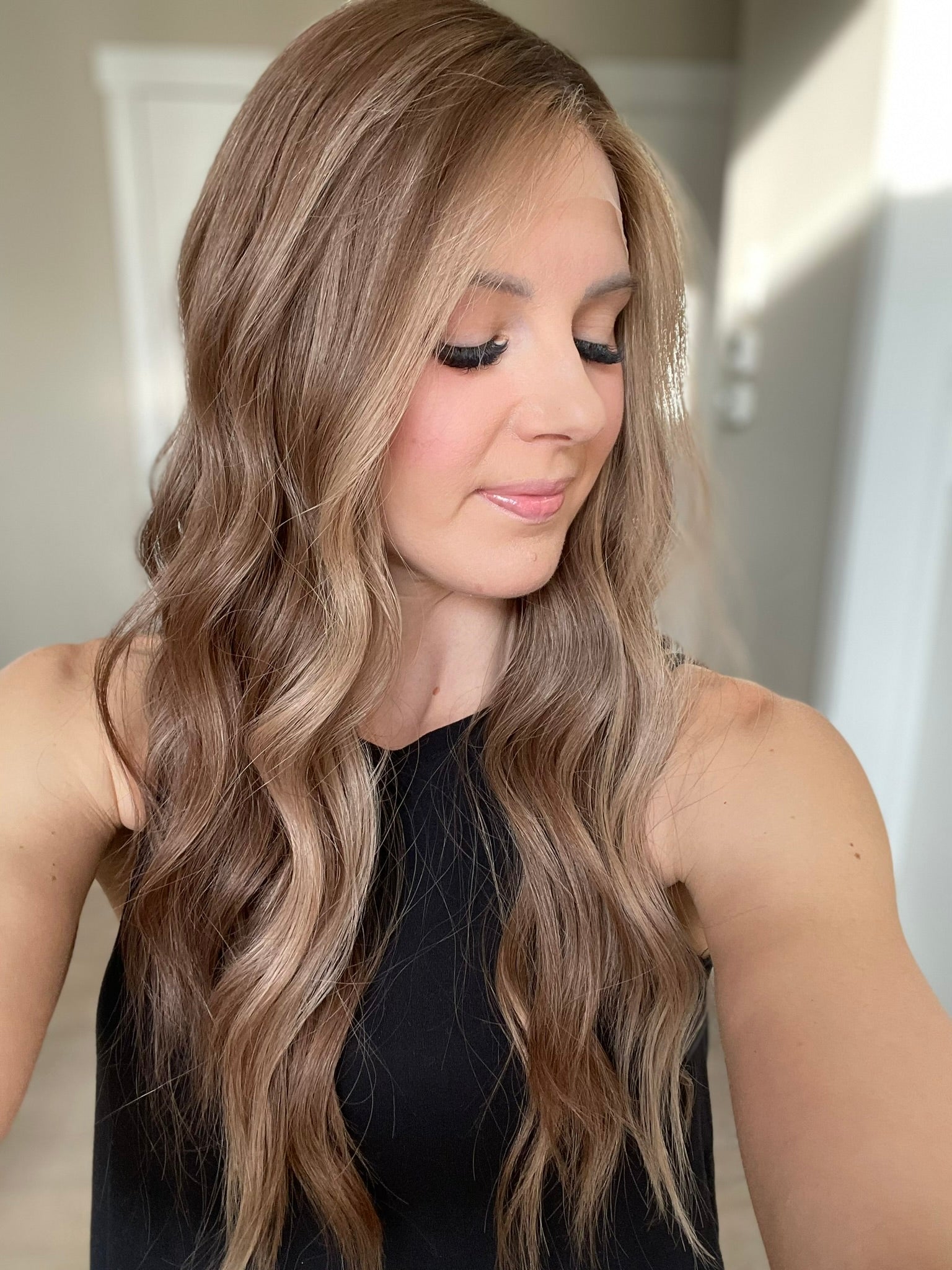 * Color: Medium neutral brown with blonde highlights and darker brown rooting.