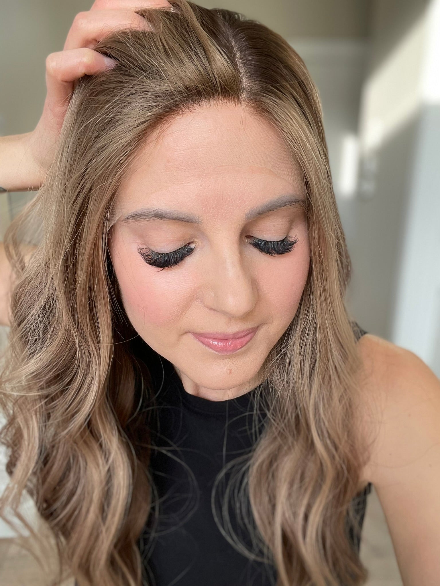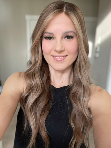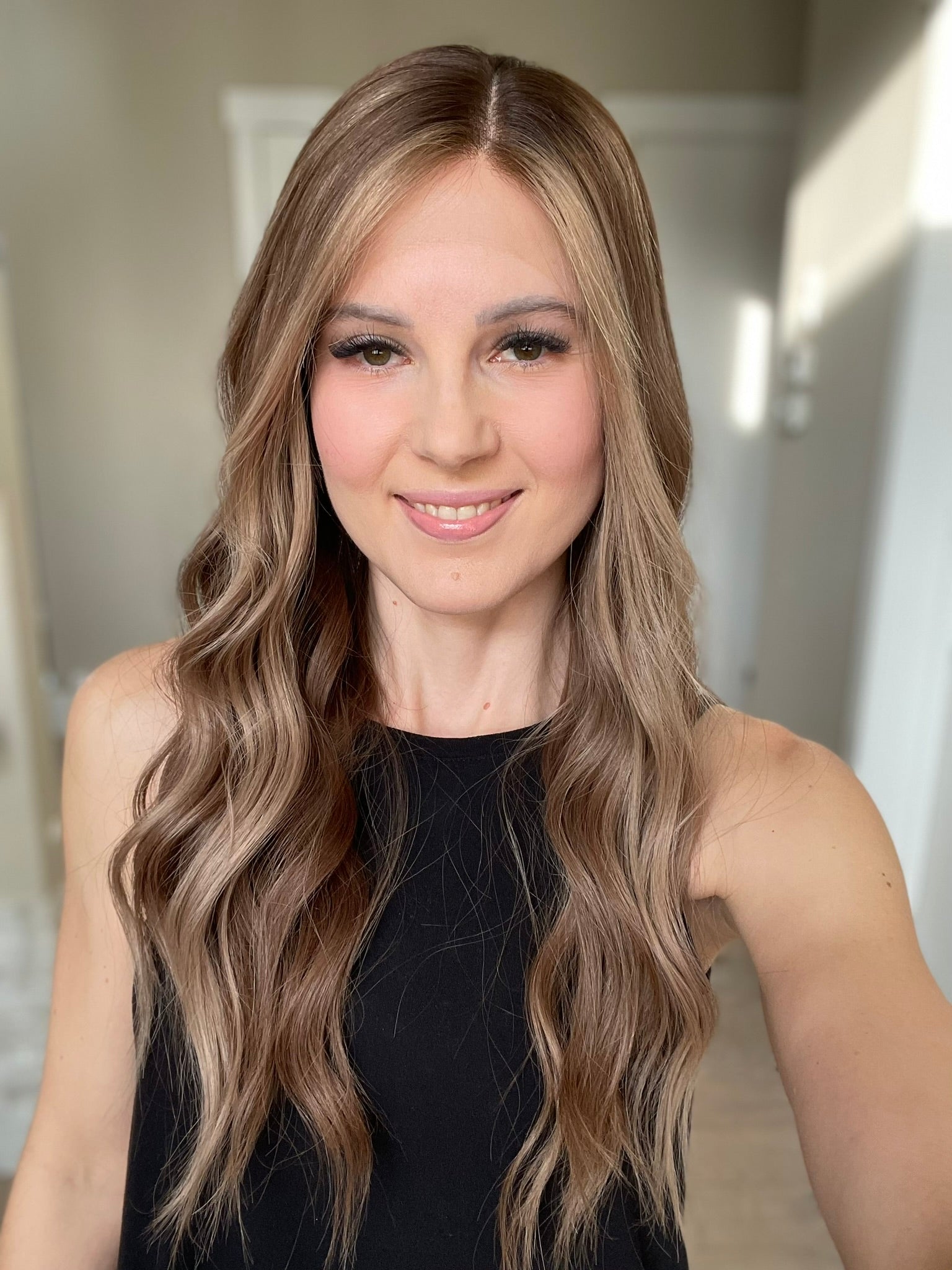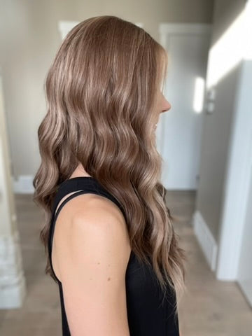 * Color: Medium neutral brown with blonde highlights and darker brown rooting.