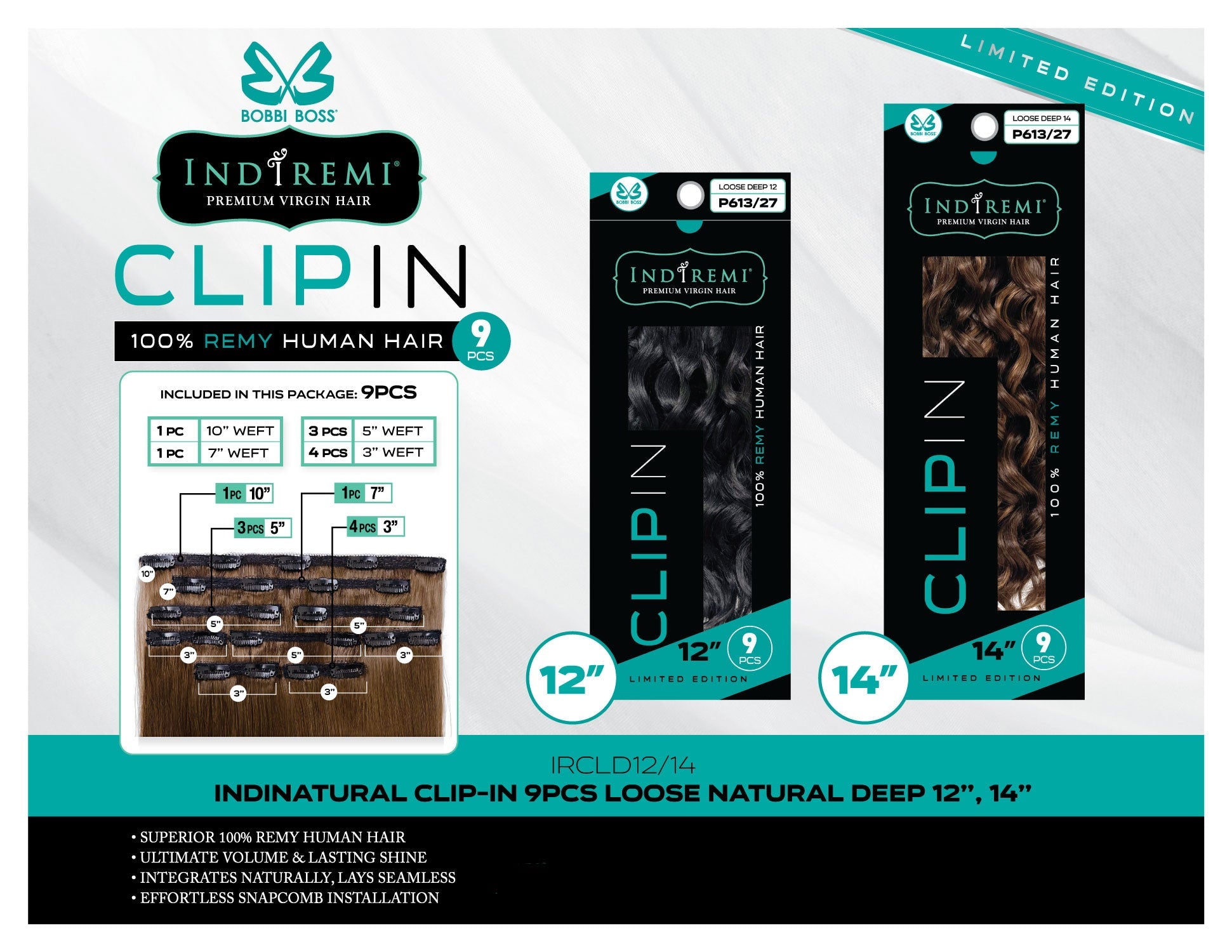 Bobbi Boss Indiremi Clip-In 9 PCS 100% Remy Human Hair Weaving - LOOSE DEEP 12"/14"
