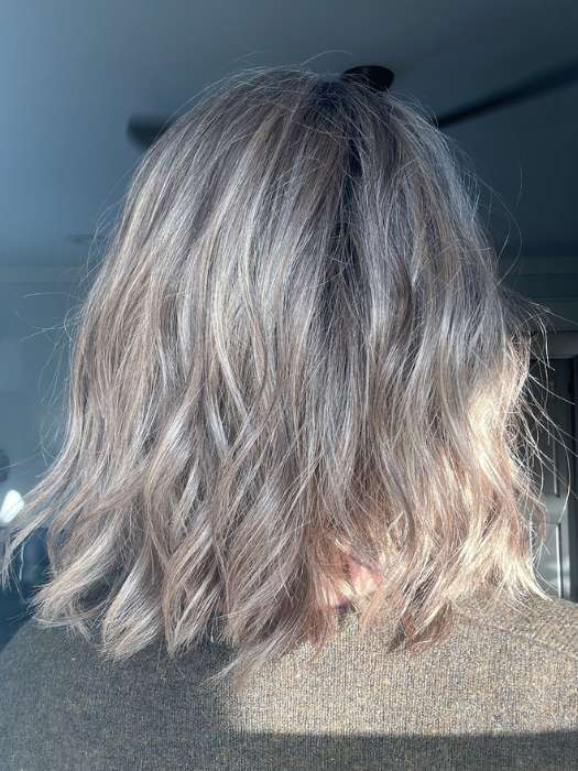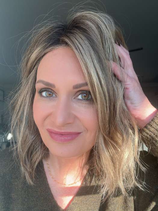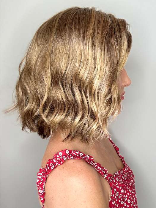Charlotte by showcases a wavy, layered bob that extends past the chin for a mid-length hairdo. The has a part that creates the look of hair growth. The gives the illusion of natural hairline.