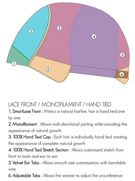 The 100% hand-tied stretch cap is completely hand-knotted, creating supreme comfort and natural movement. The SmartLace™ front creates a natural-looking hairline and allows for styling hair off the face. The provides multi-directional styling and looks like natural hair growth. And the ready-to-wear looks and feels like natural hair.